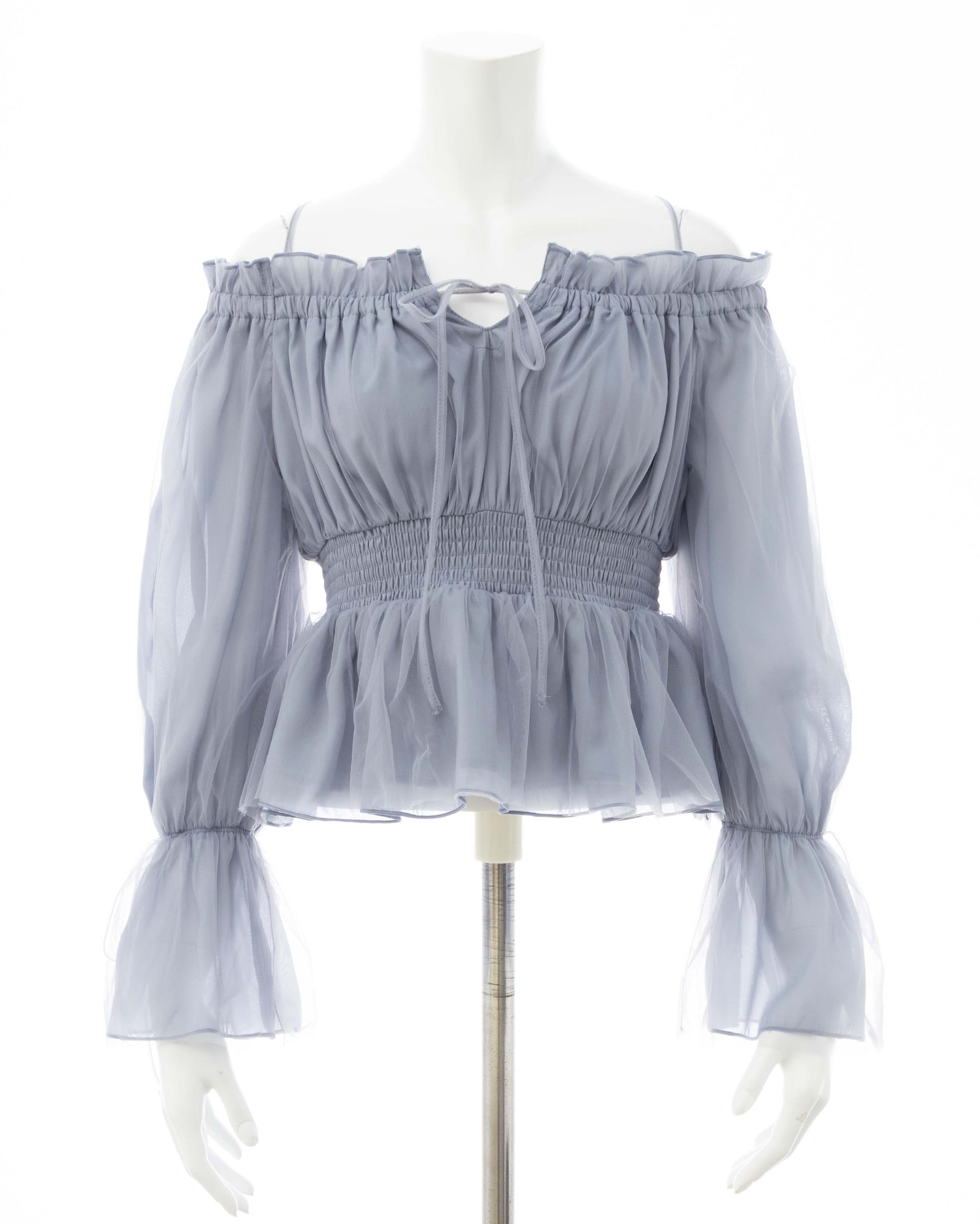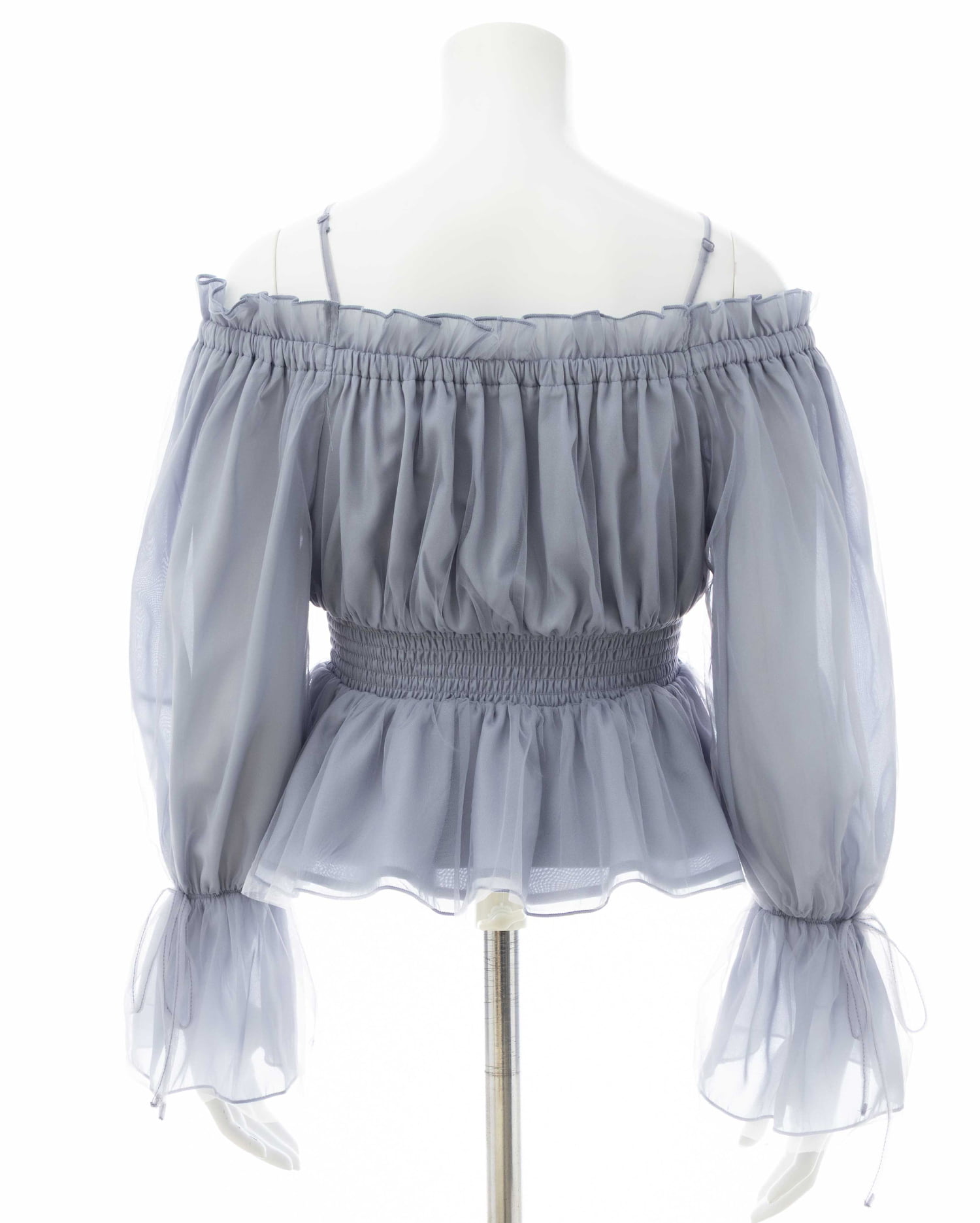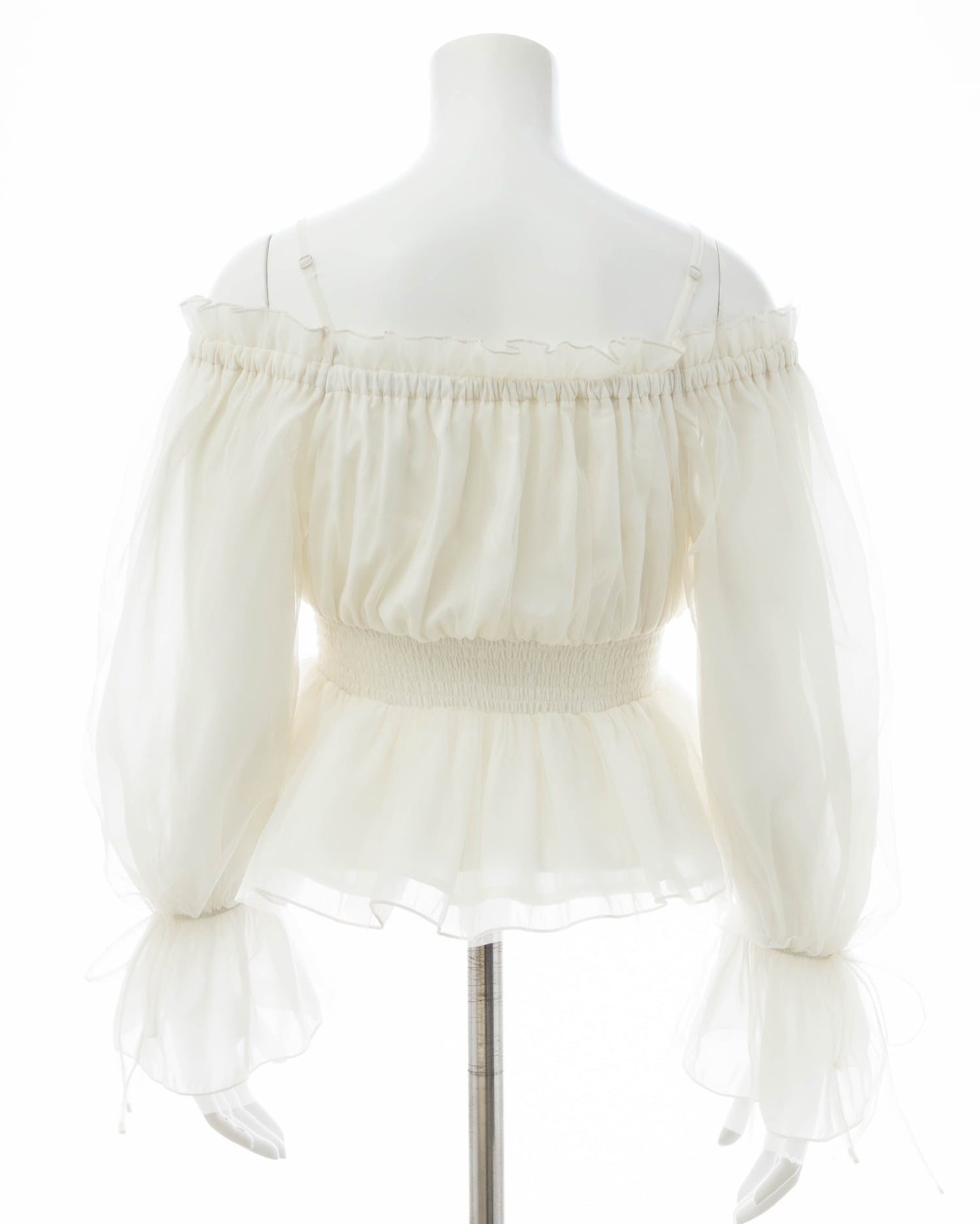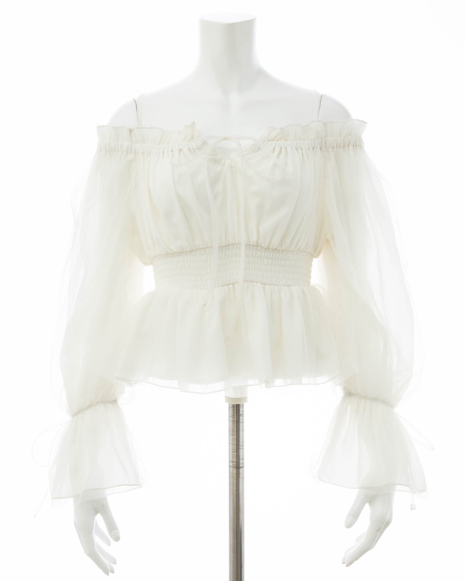 オフショルダー&チュールで軽やかに着こなせるブラウス。