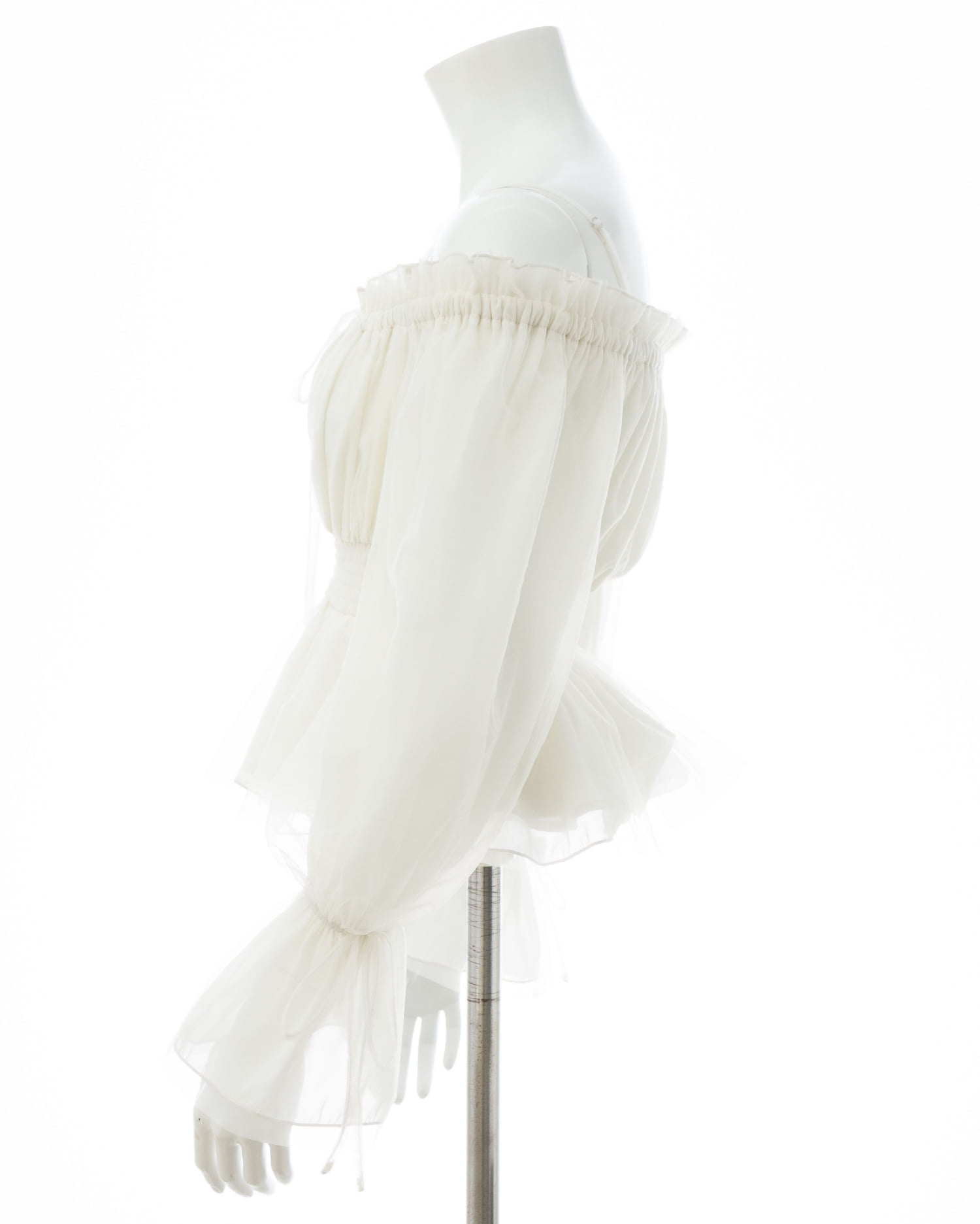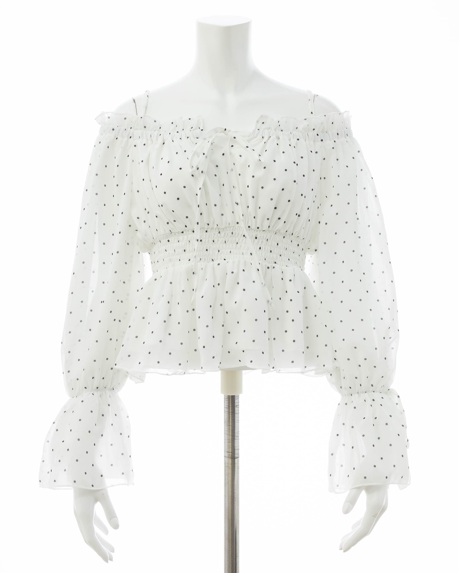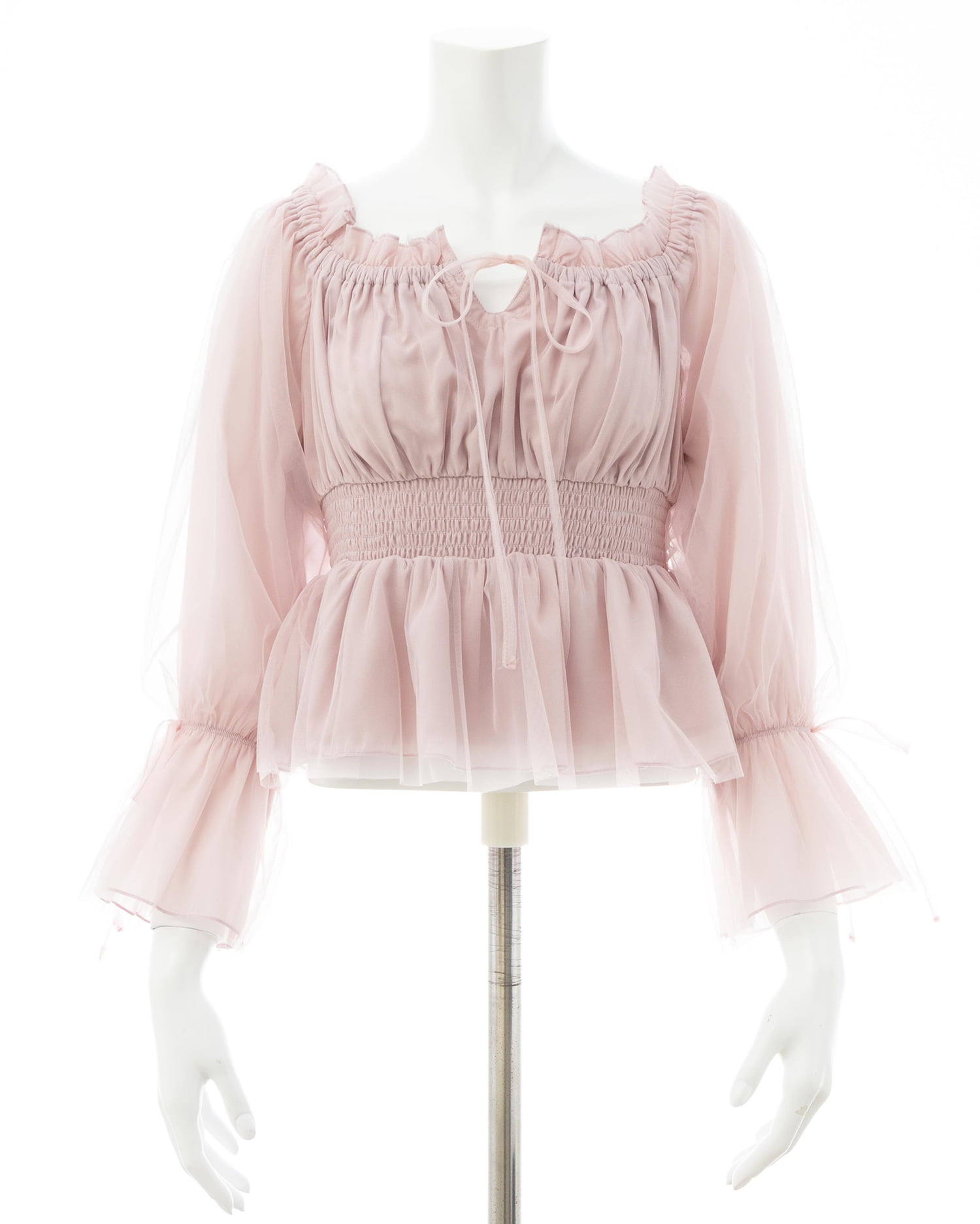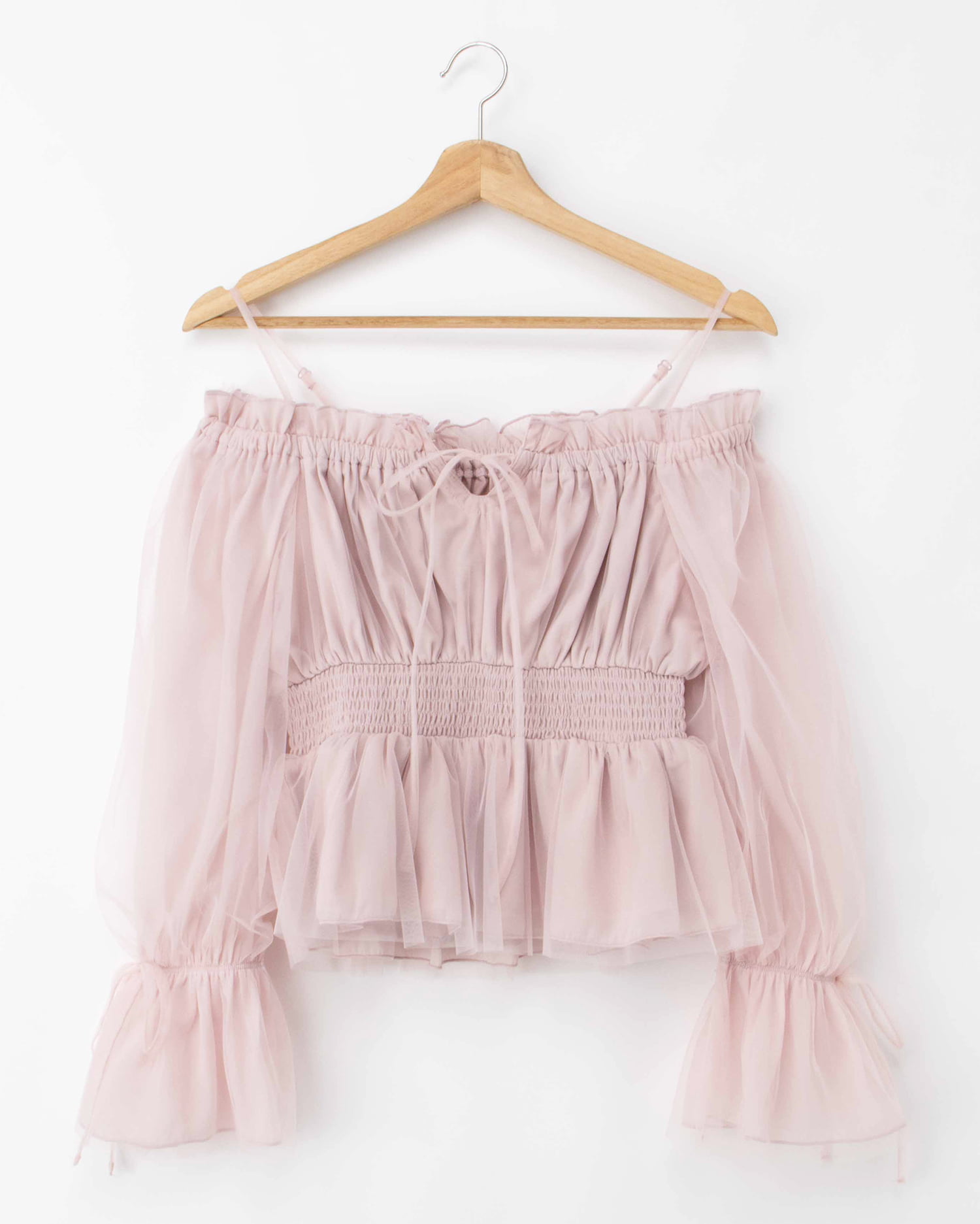 オフショルダー&チュールで軽やかに着こなせるブラウス。