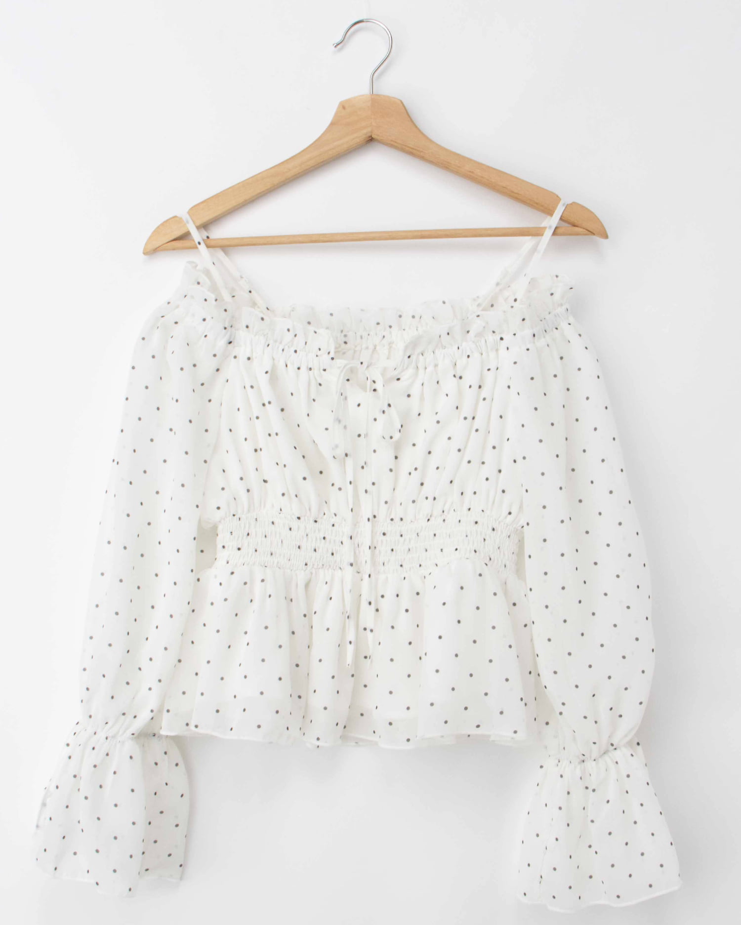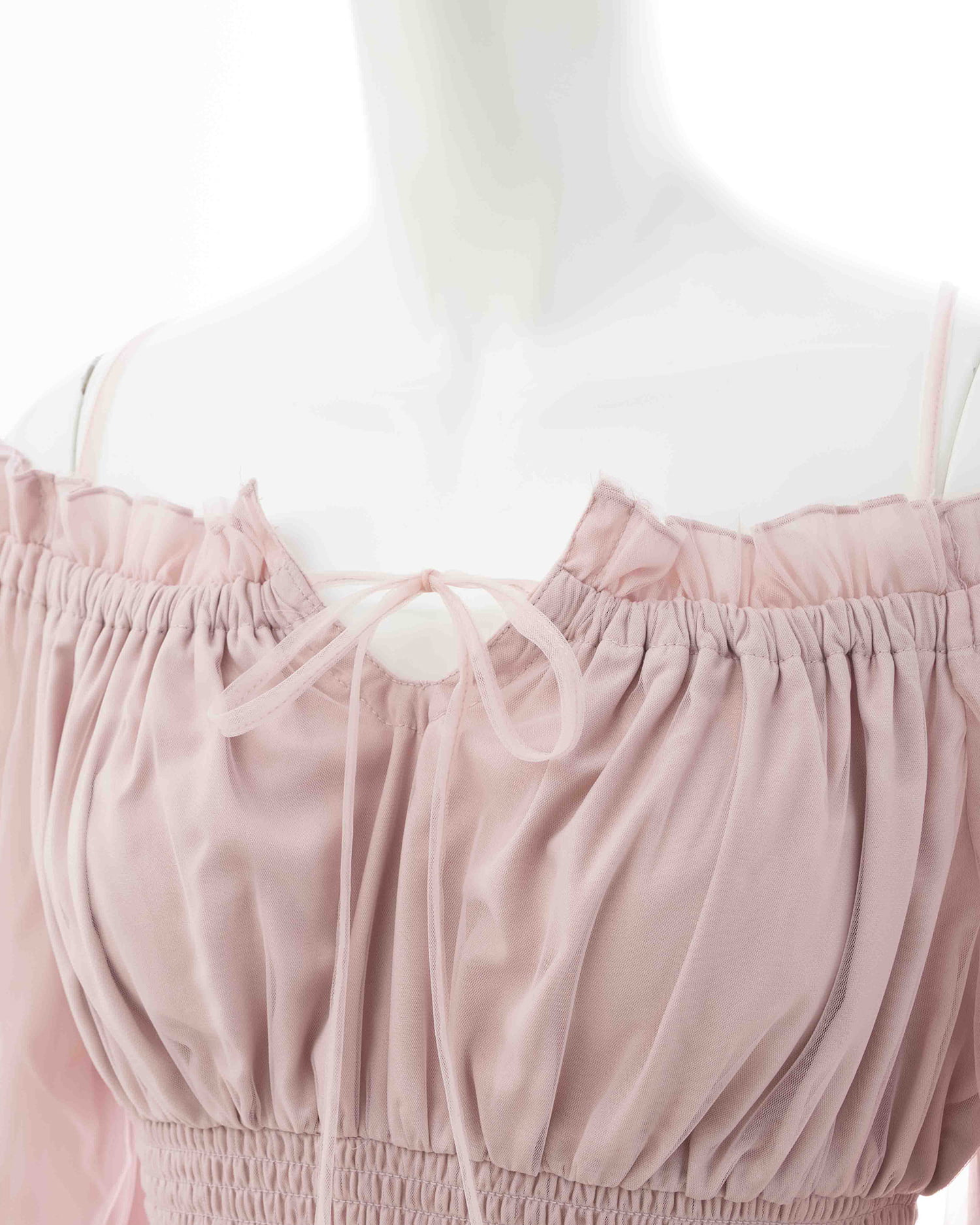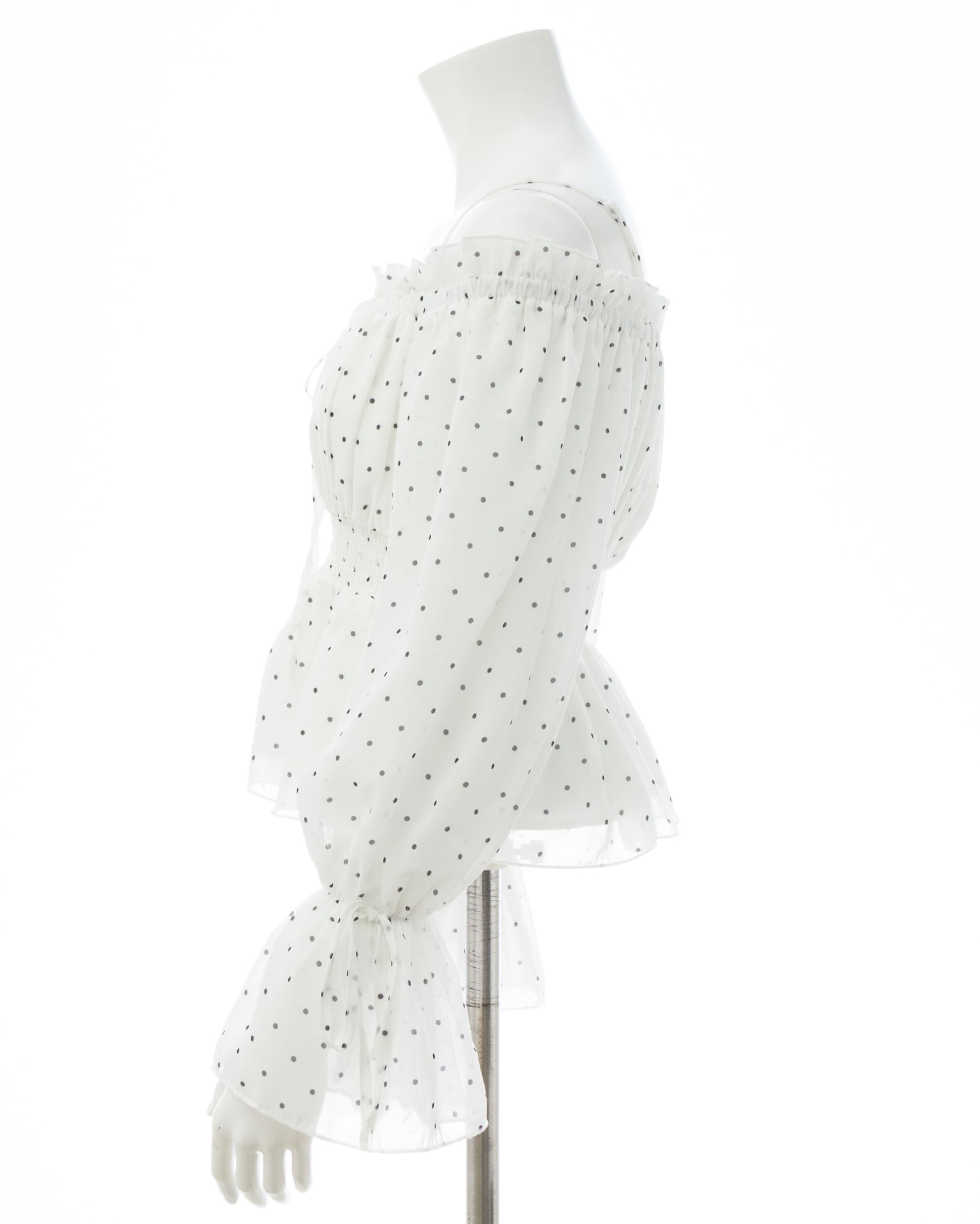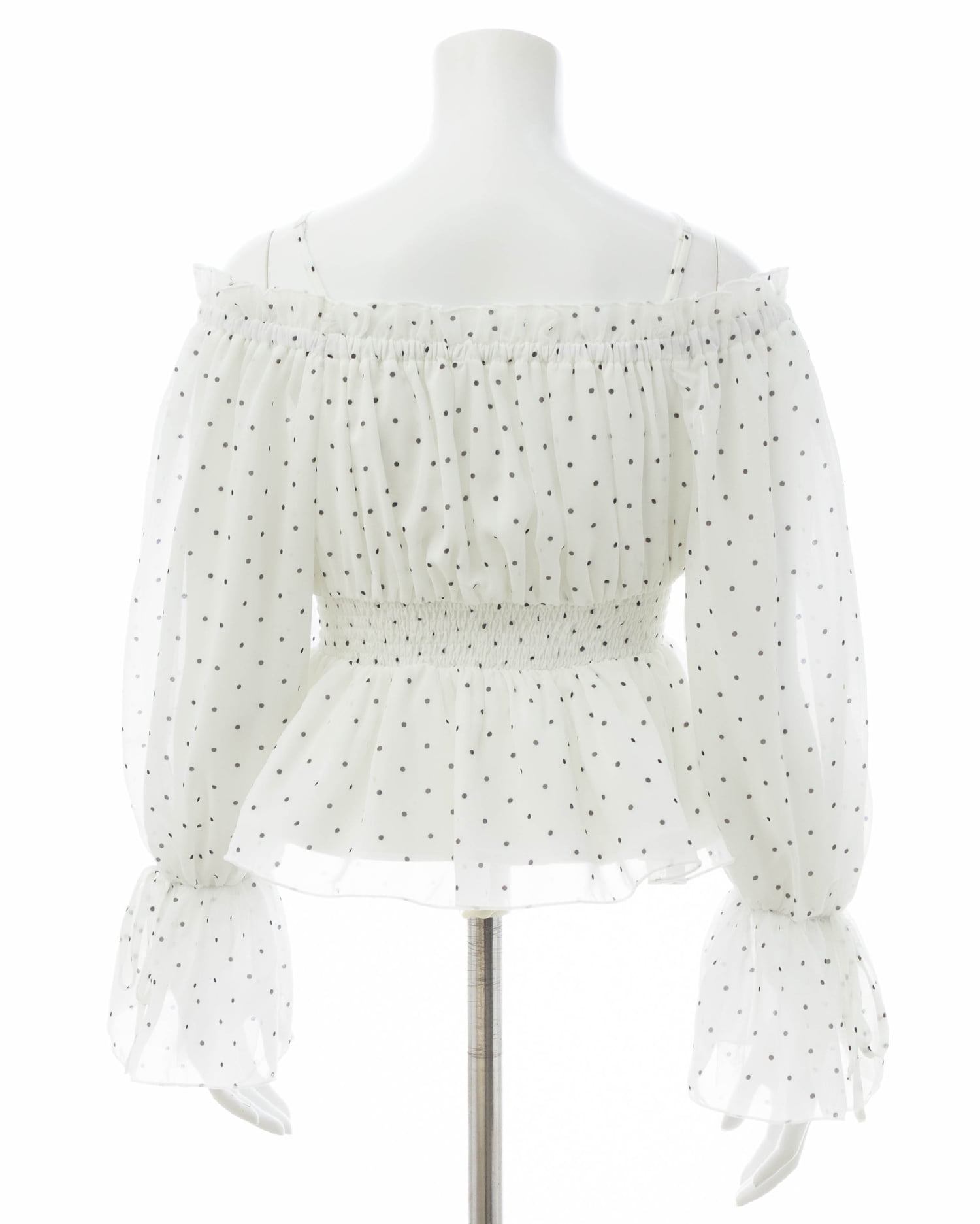 オフショルダー&チュールで軽やかに着こなせるブラウス。