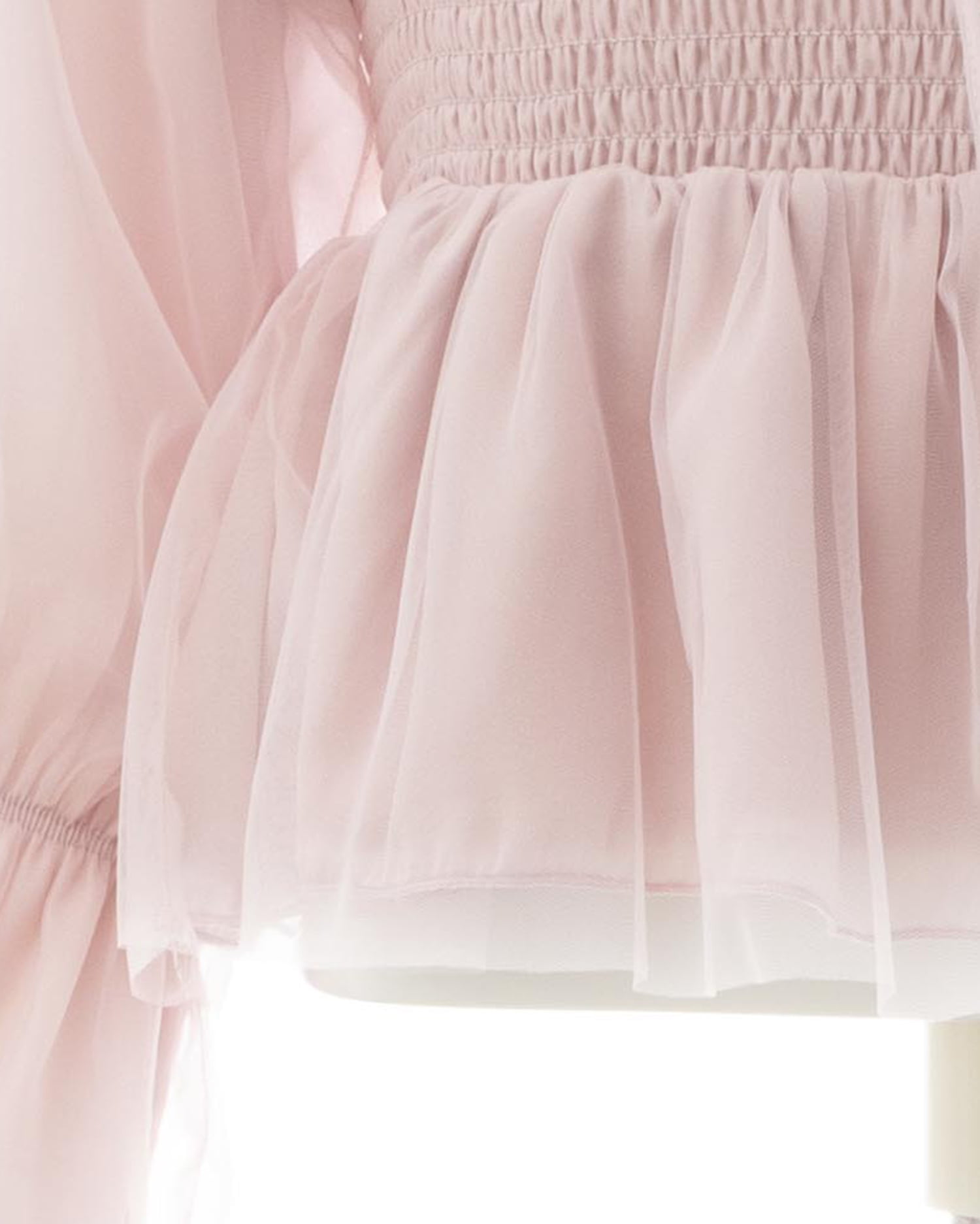 ふんわりとしたボリューミーなシルエットもバスト下のシャーリングでメリハリをプラス。