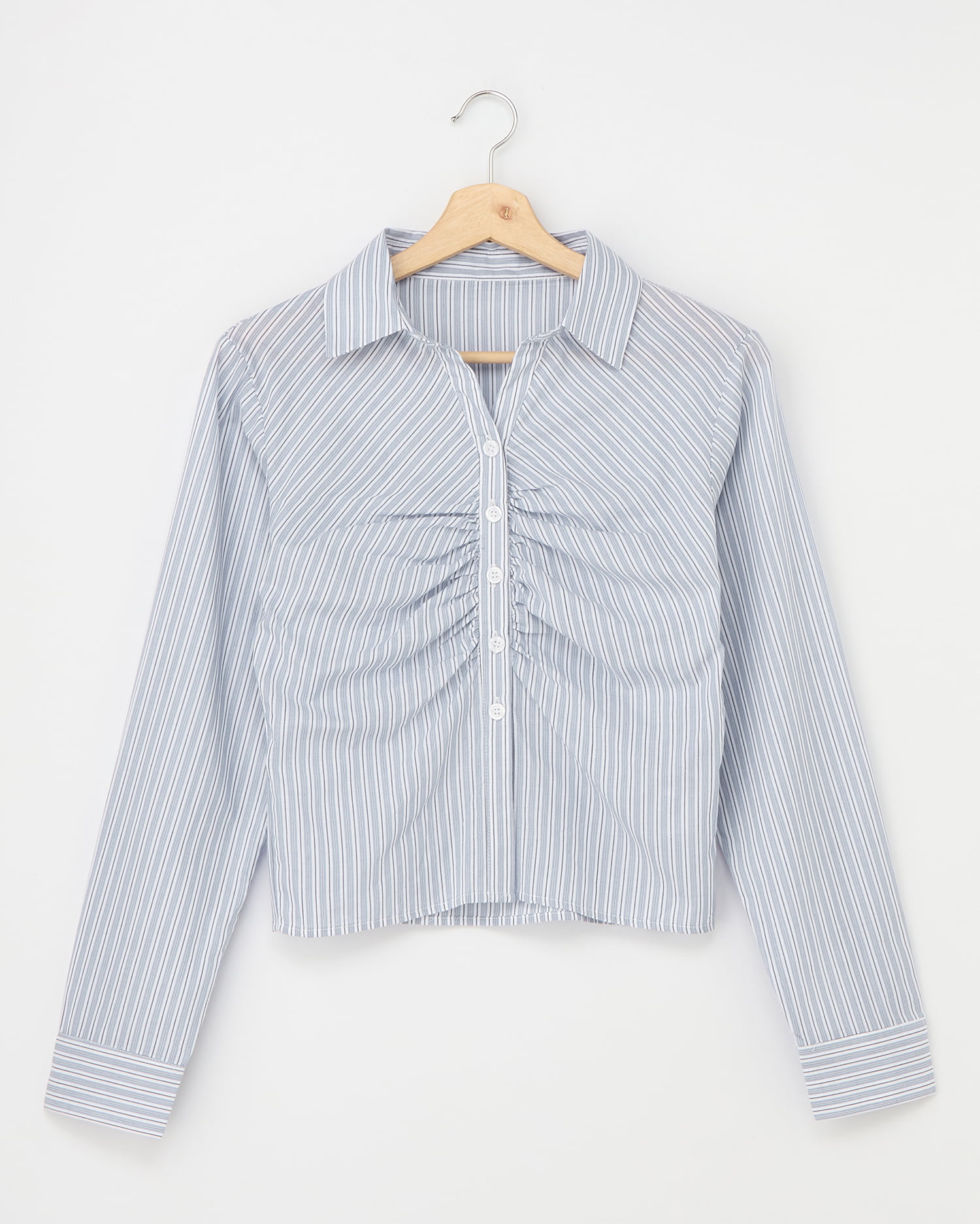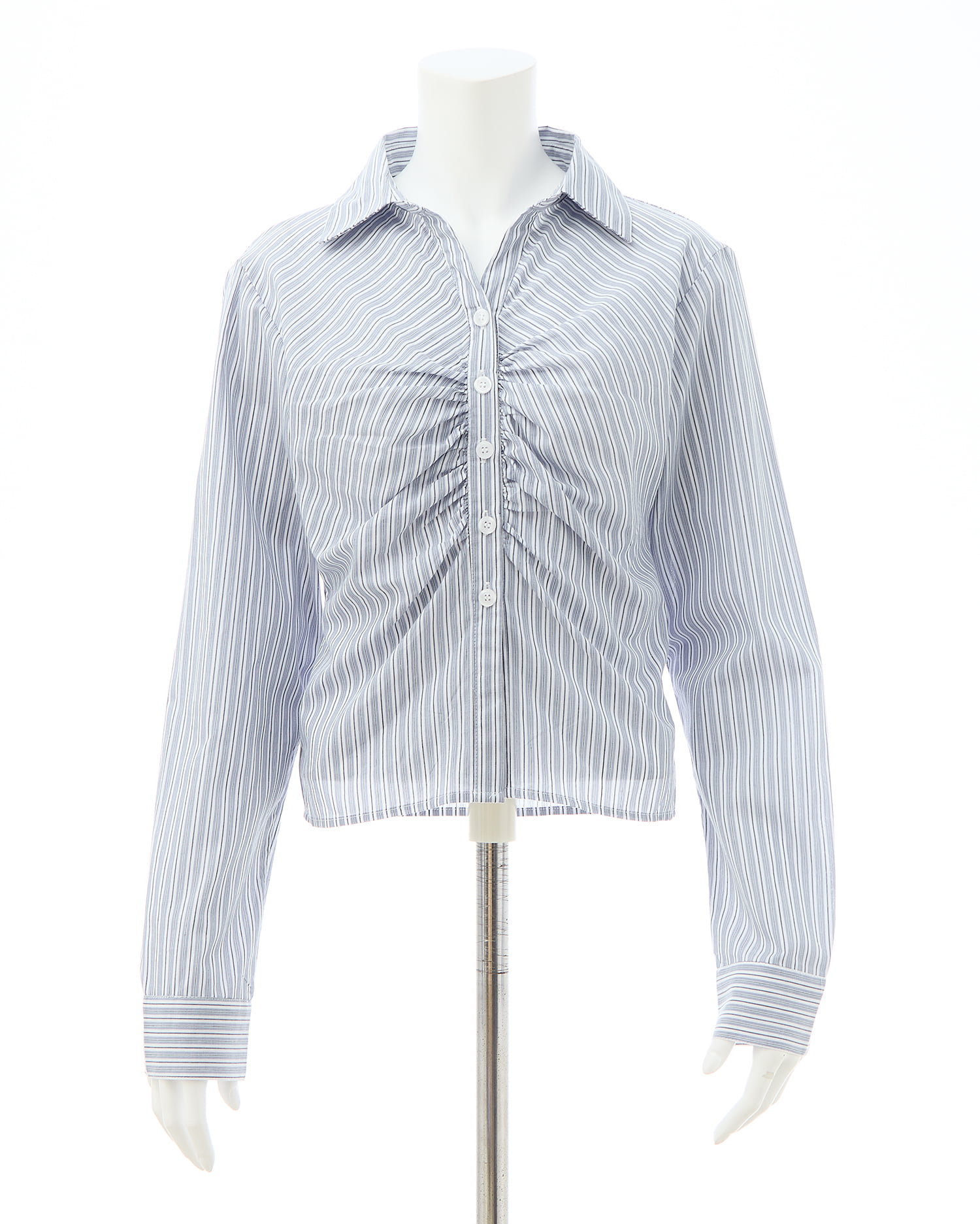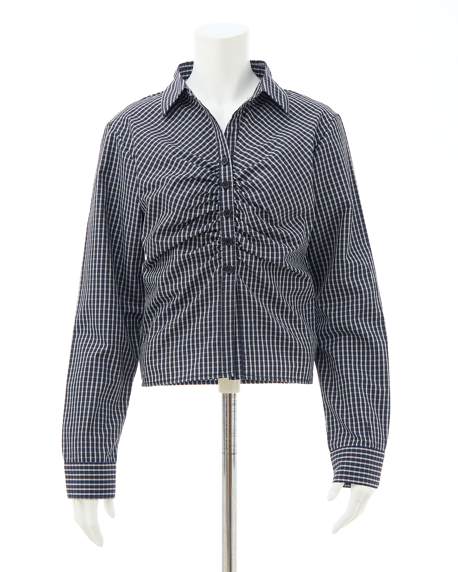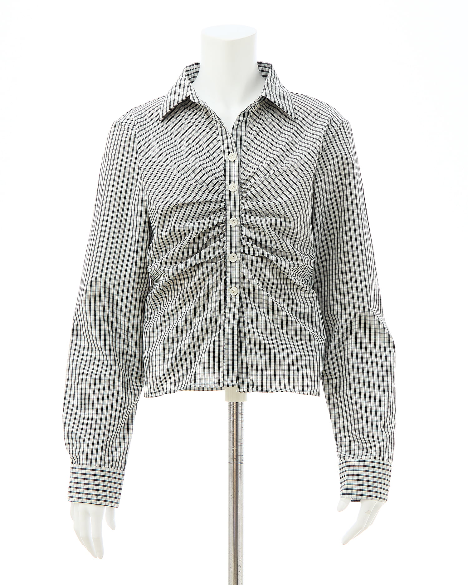 胸元のギャザーでメリハリシルエットに仕上げたシャツ。