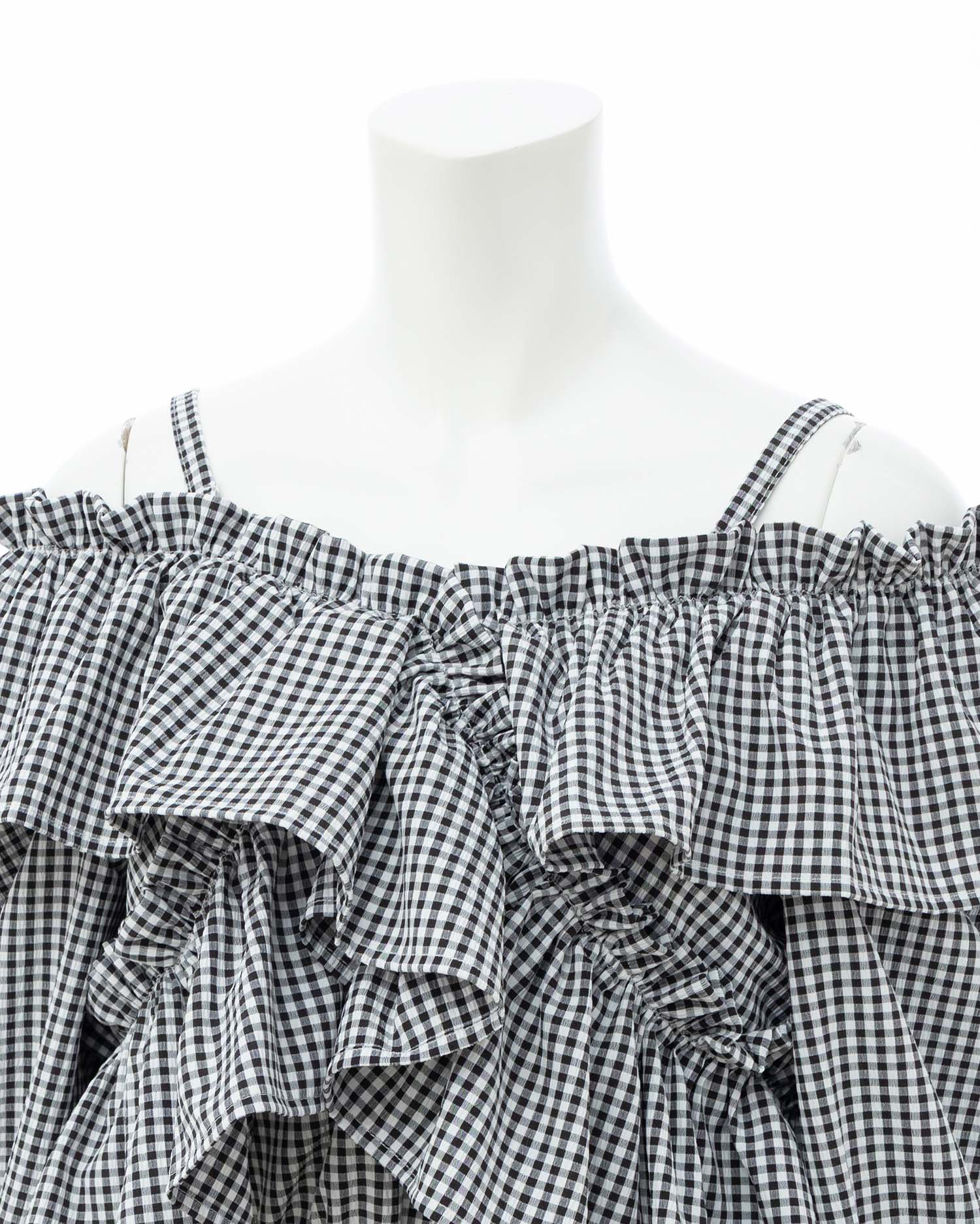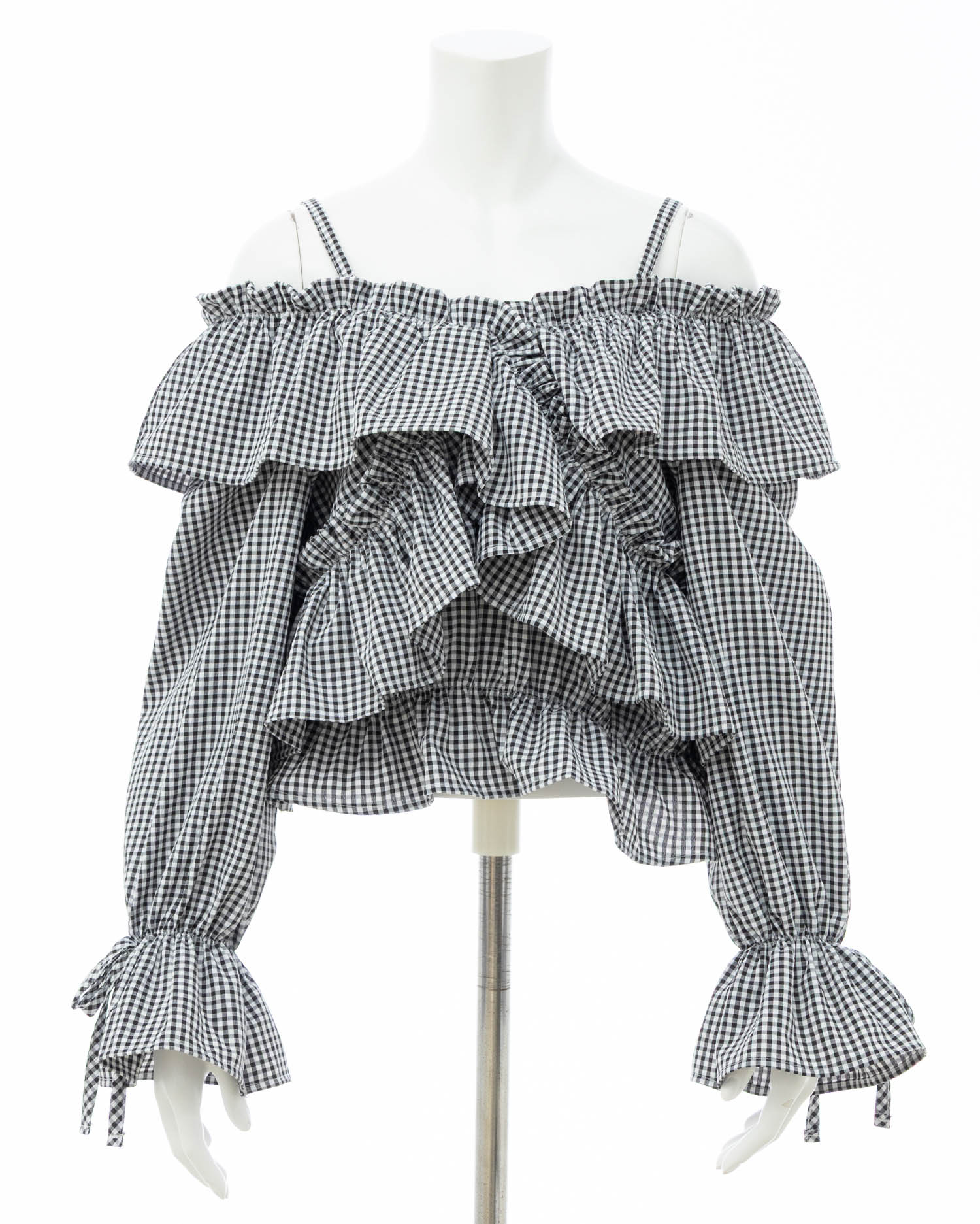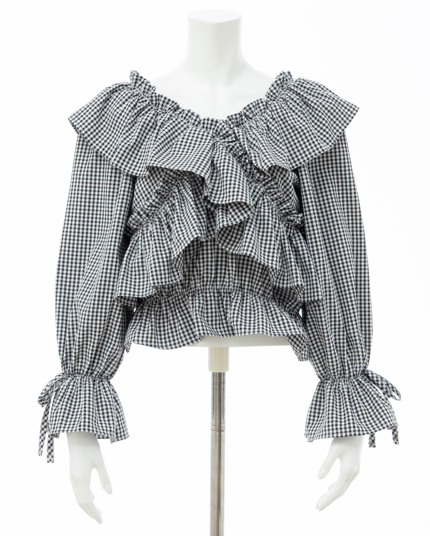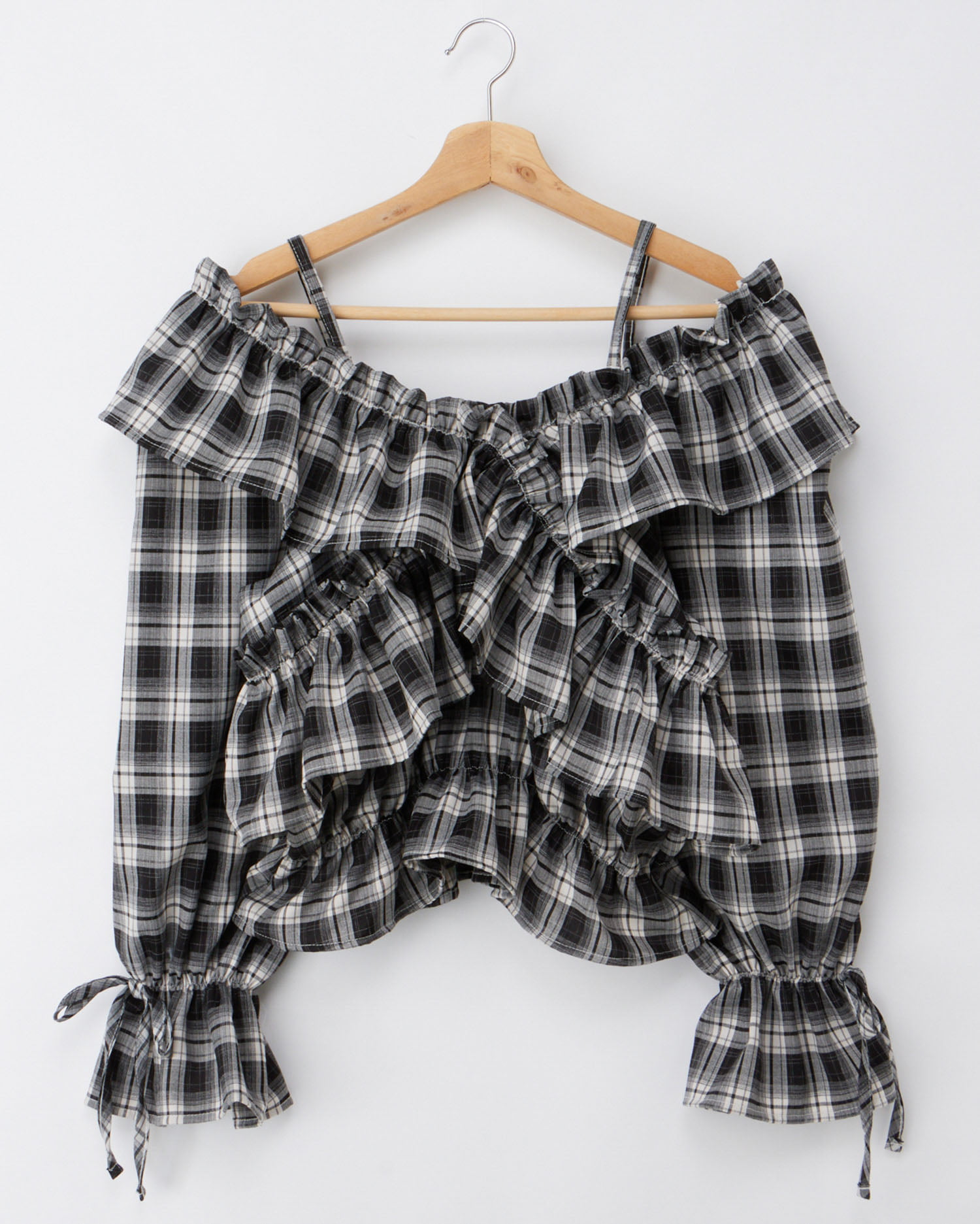 胸元でクロスさせたたっぷりフリルが着こなしに表情をプラス。