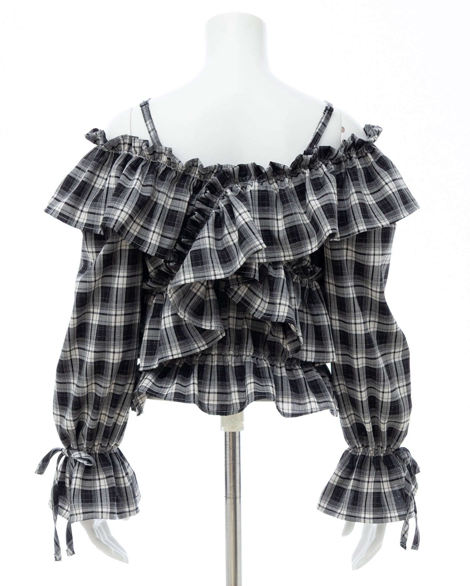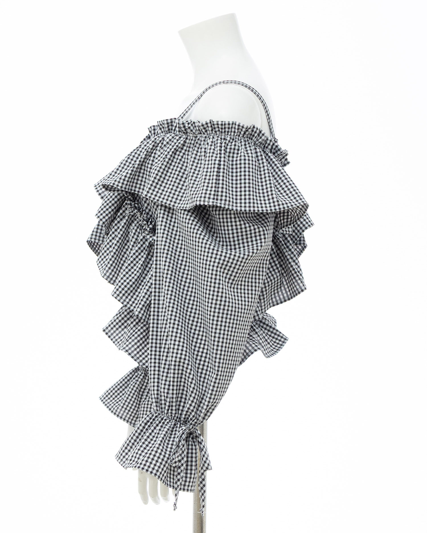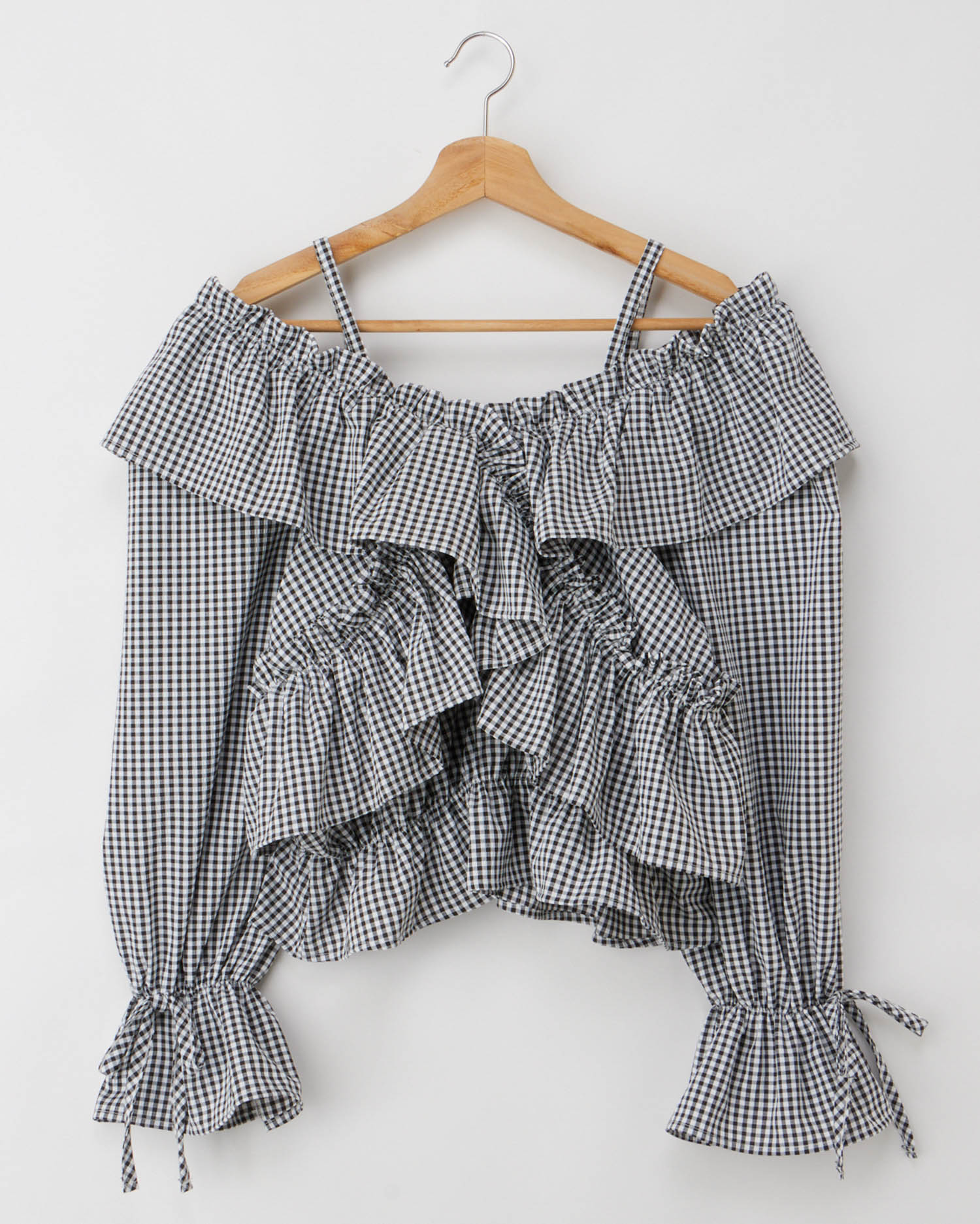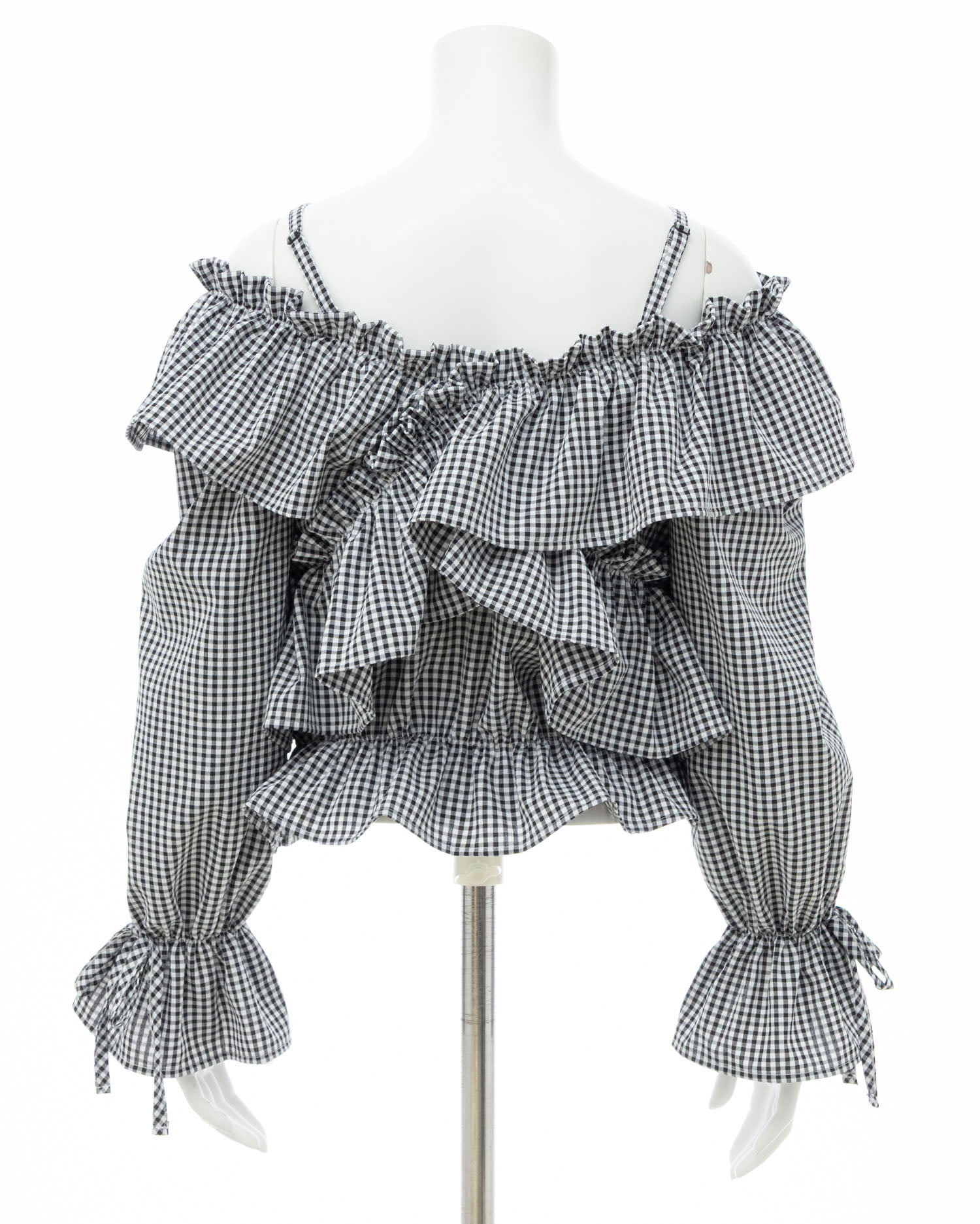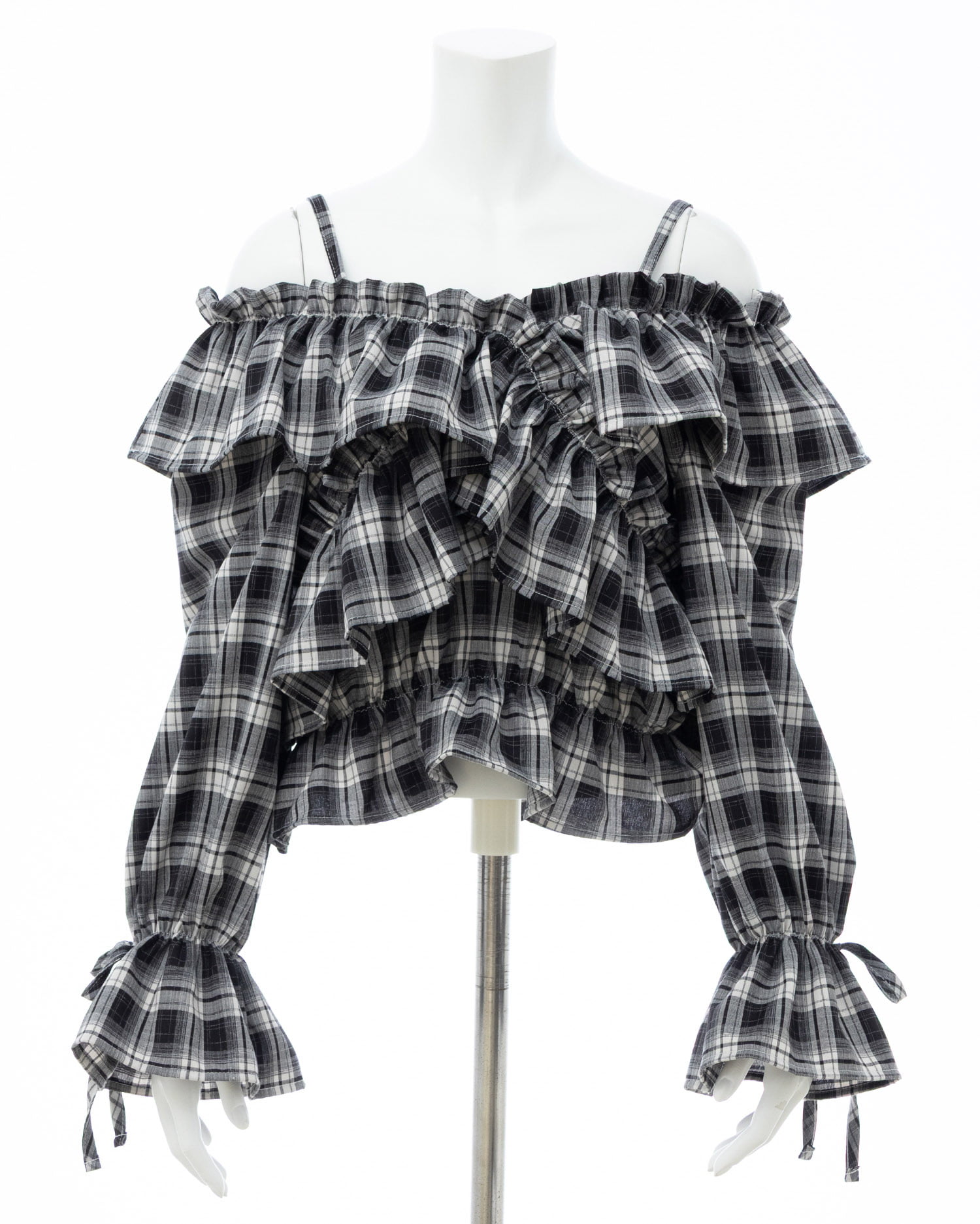 胸元でクロスさせたたっぷりフリルが着こなしに表情をプラス。
