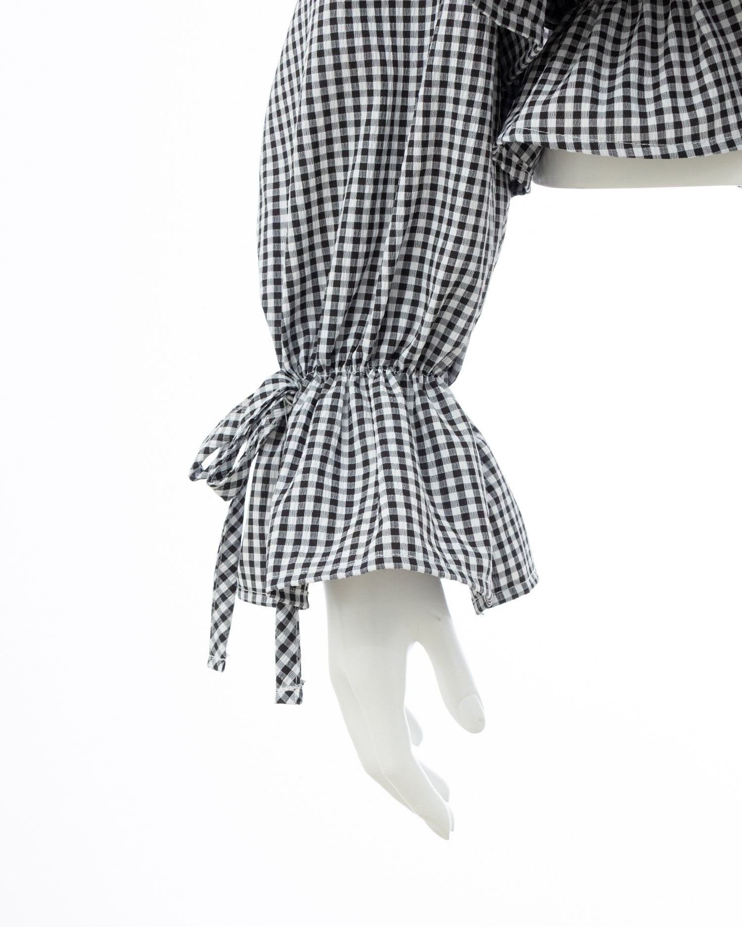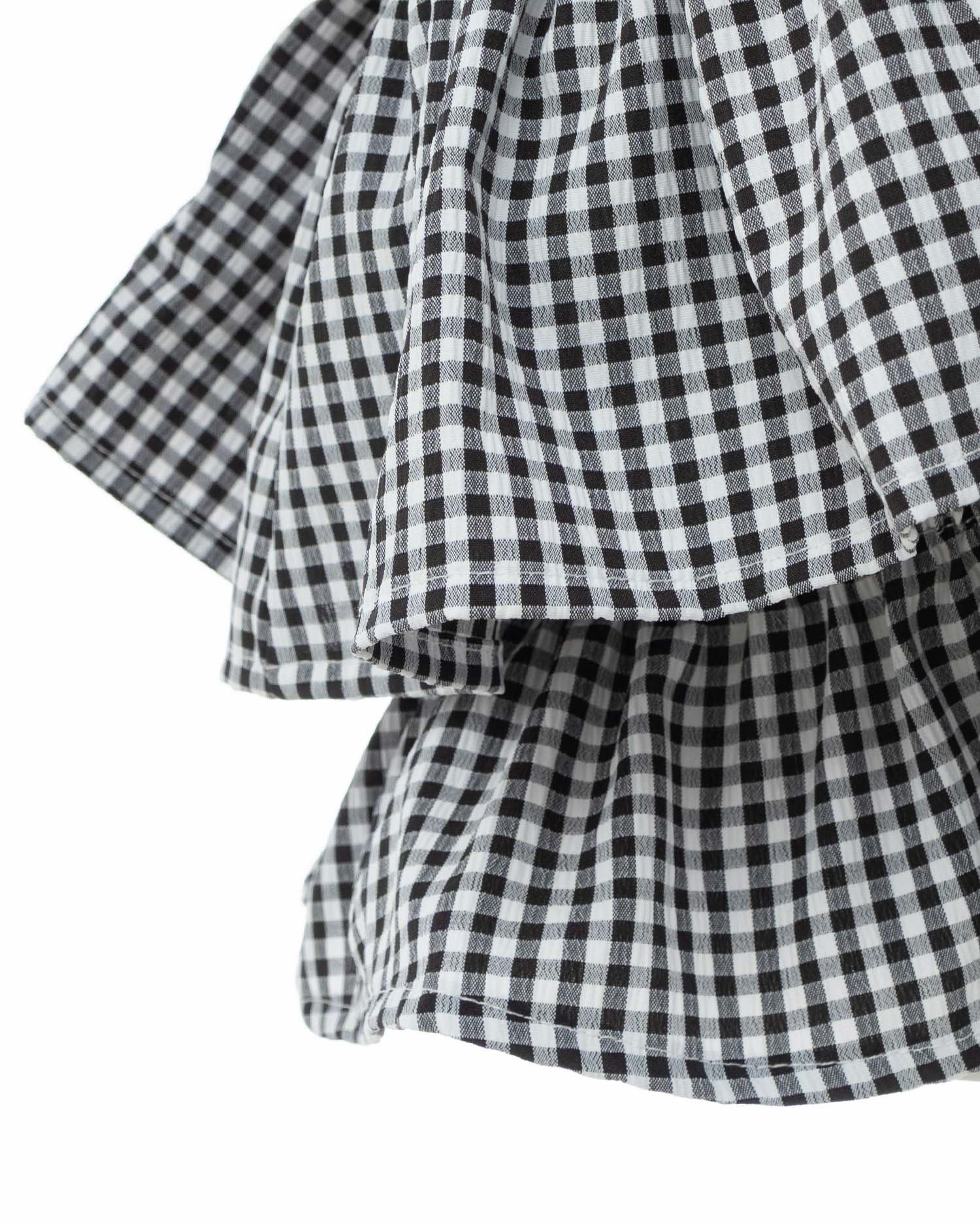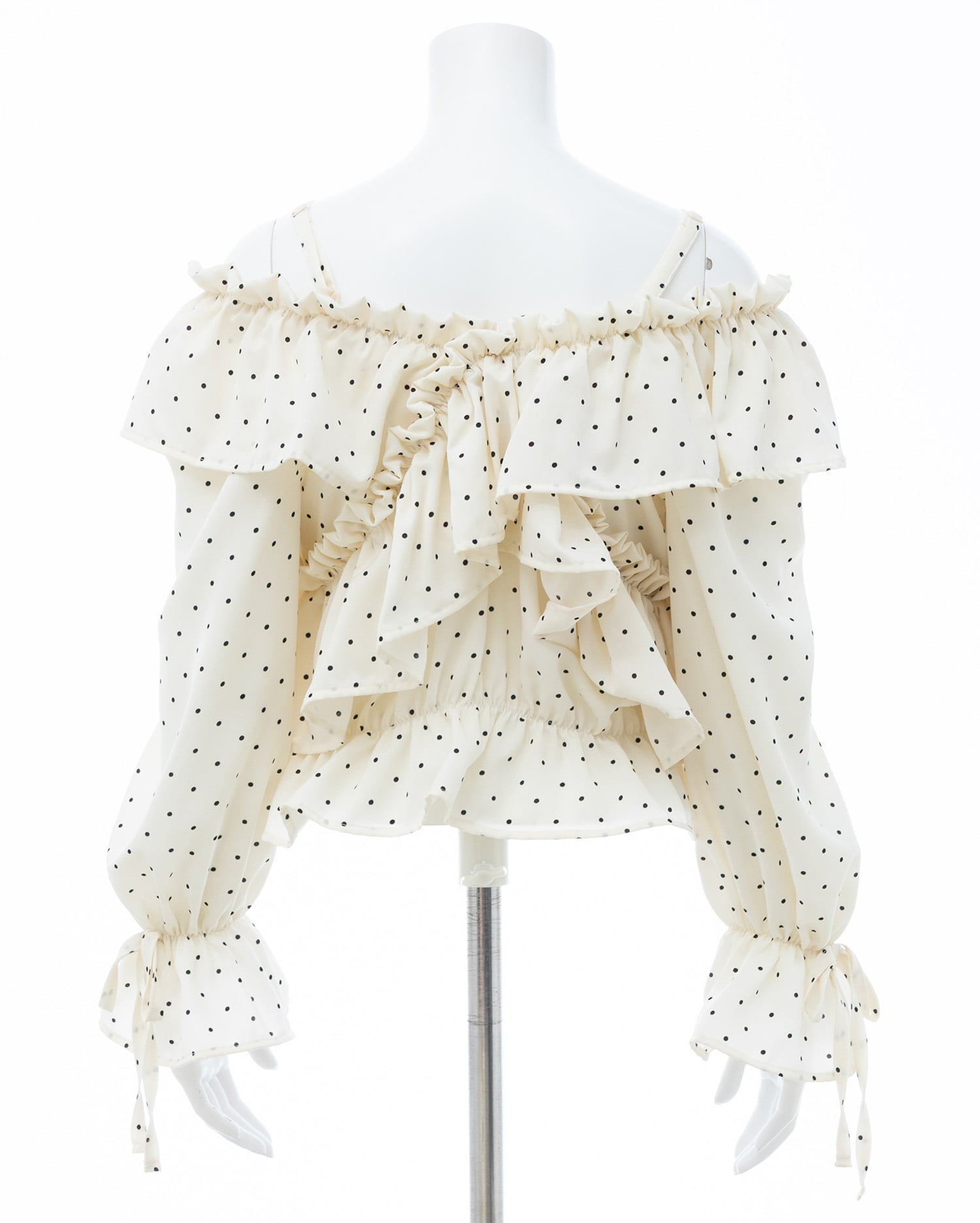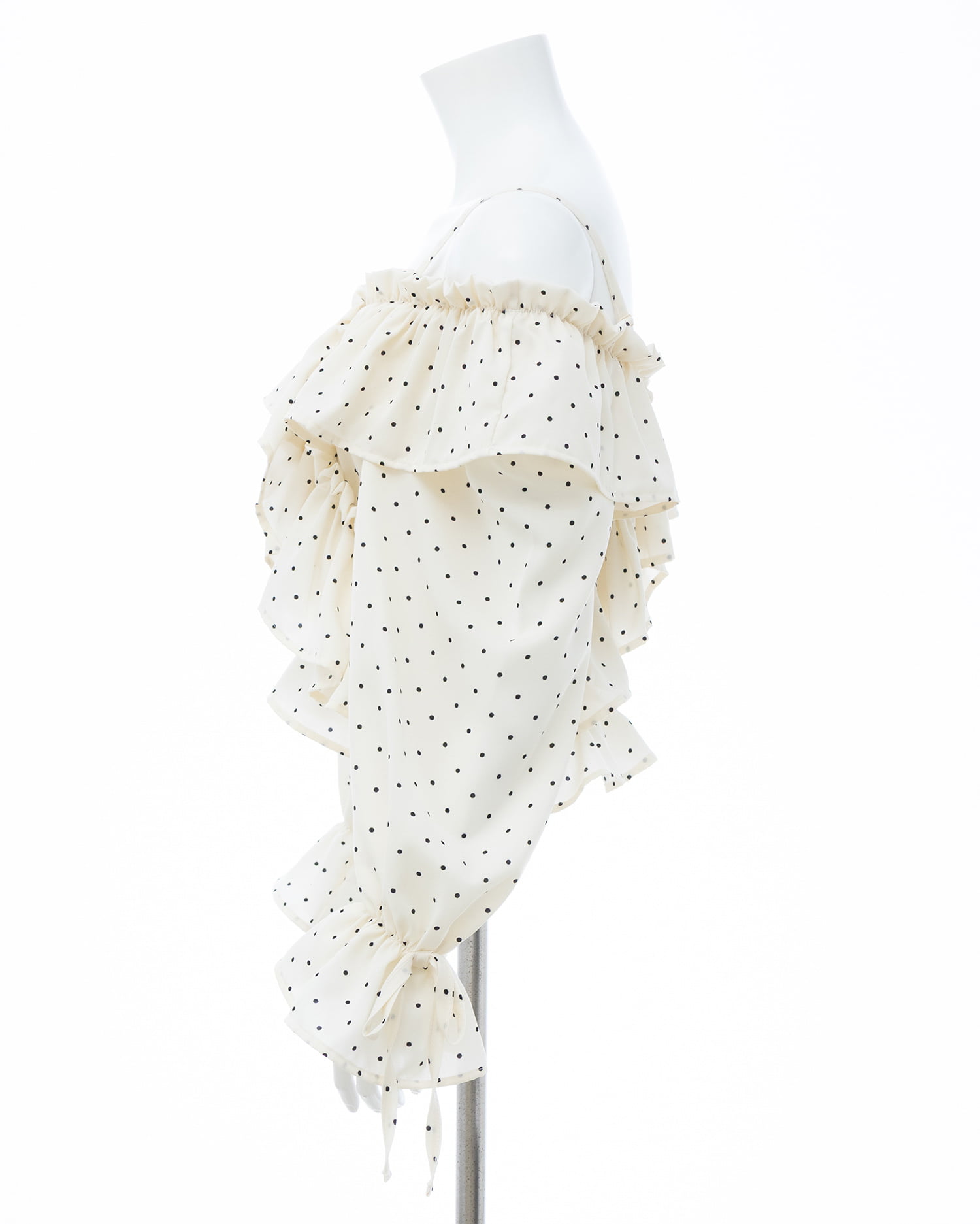 胸元でクロスさせたたっぷりフリルが着こなしに表情をプラス。