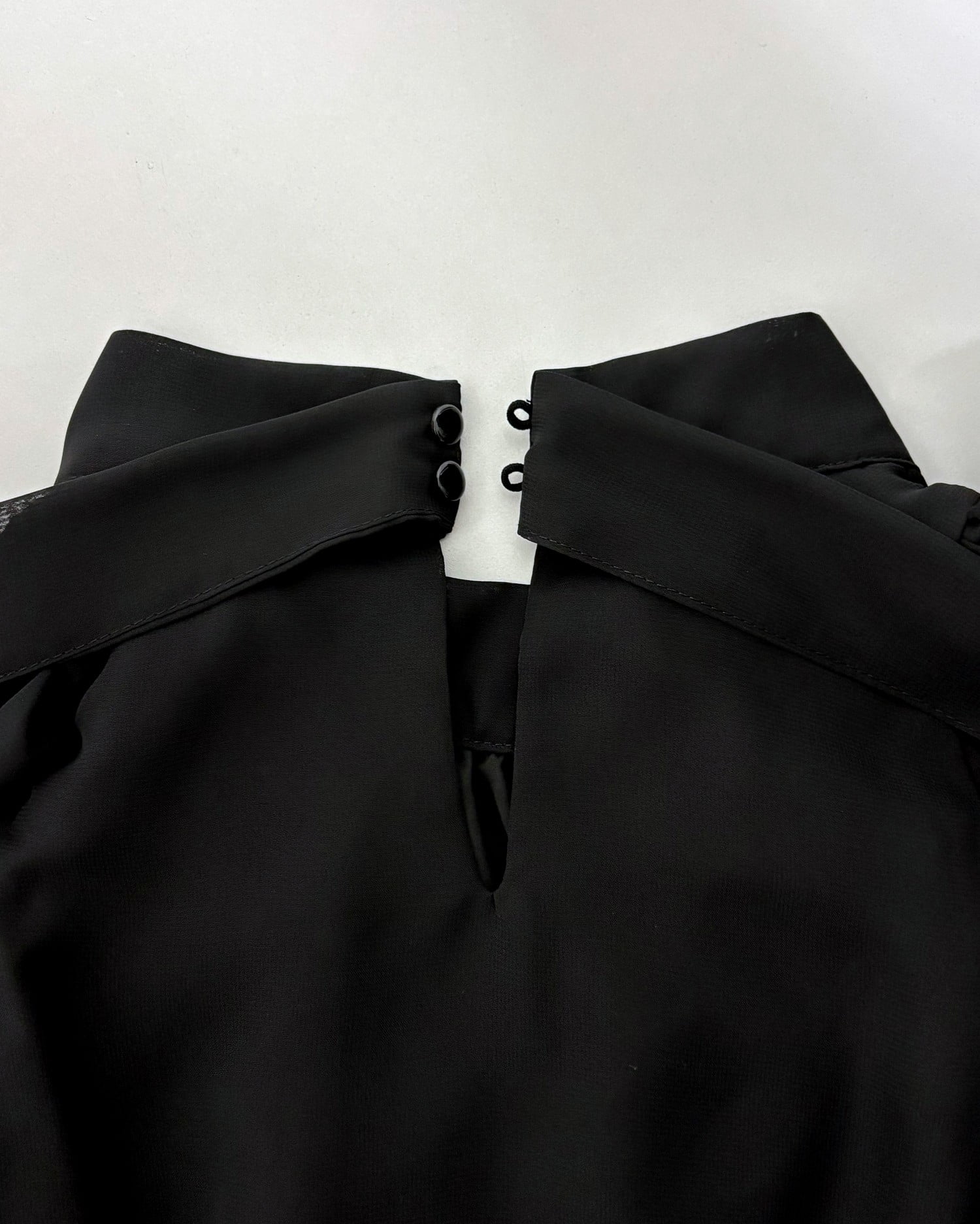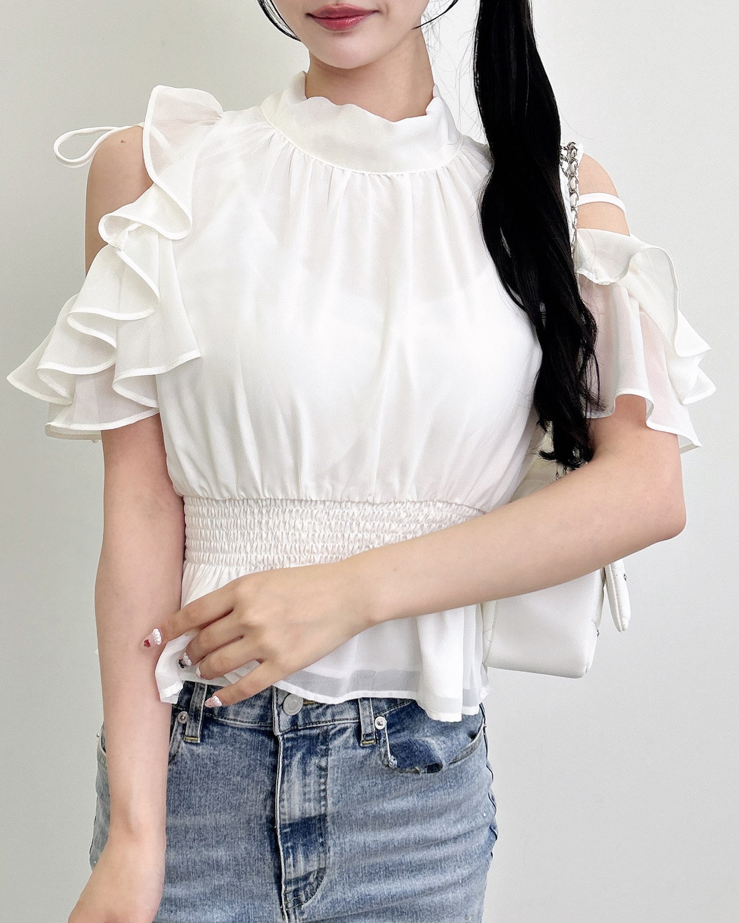 透け感のあるシフォン生地で仕立てたレディなオープンショルダーブラウス。