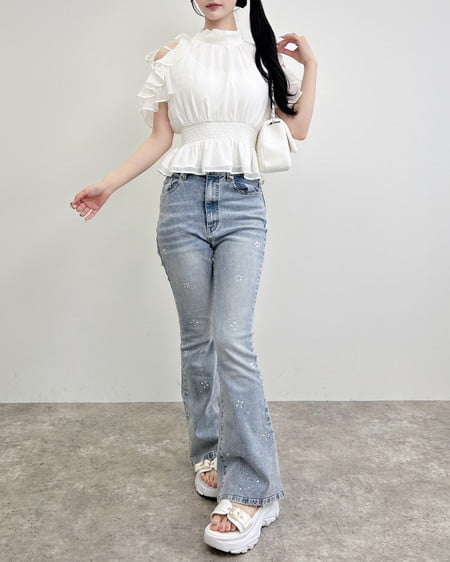 肩や袖にたっぷりフリルをあしらってシンプルなワンカラーに表情をプラス。