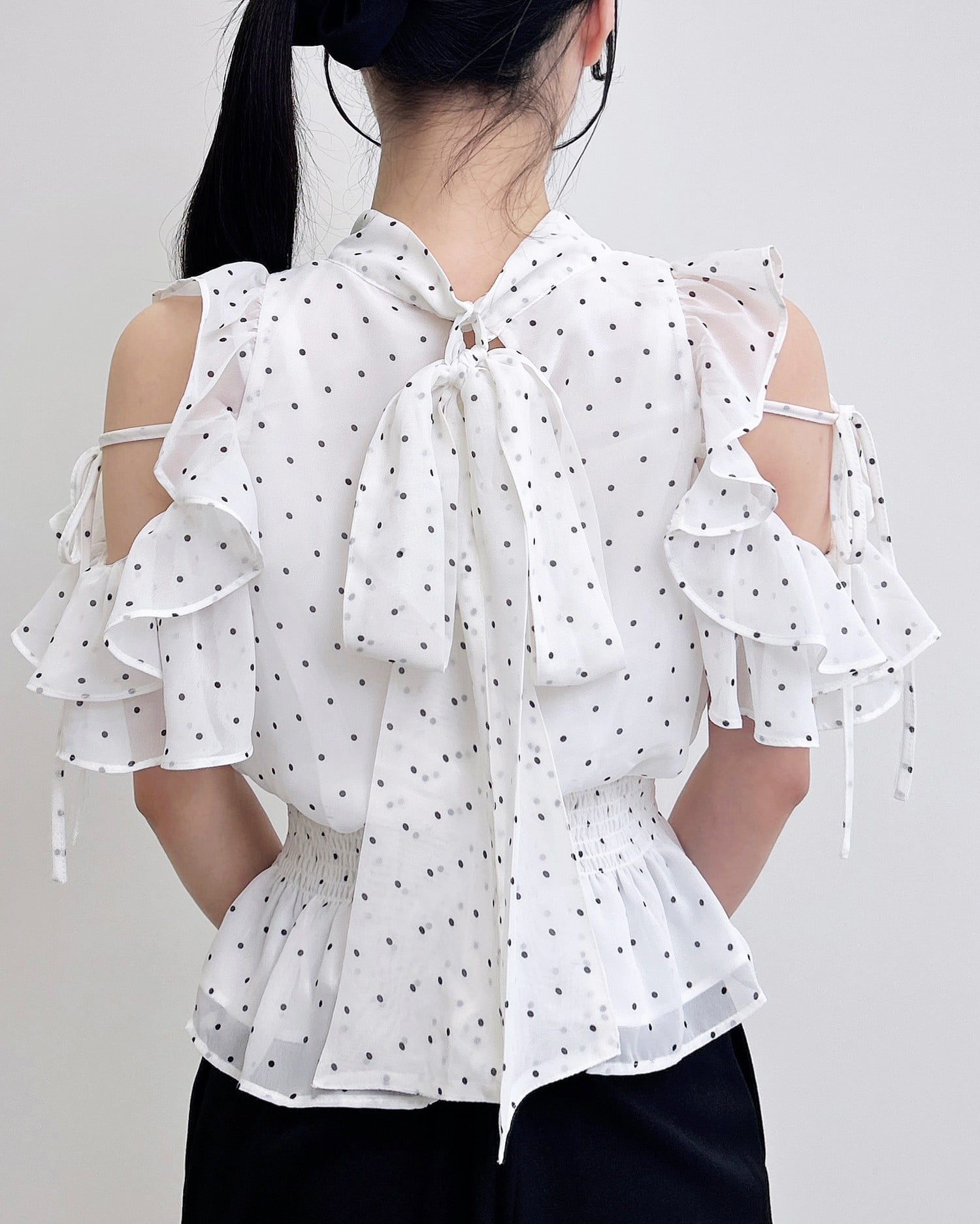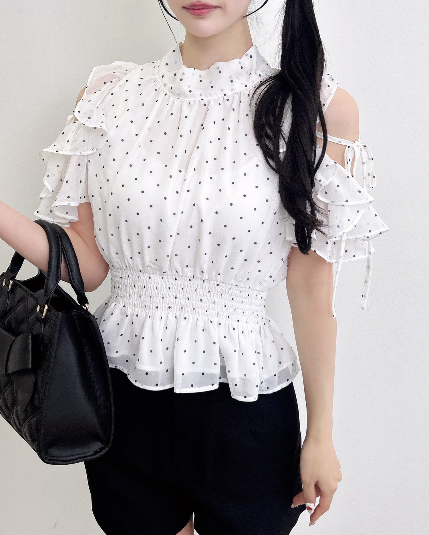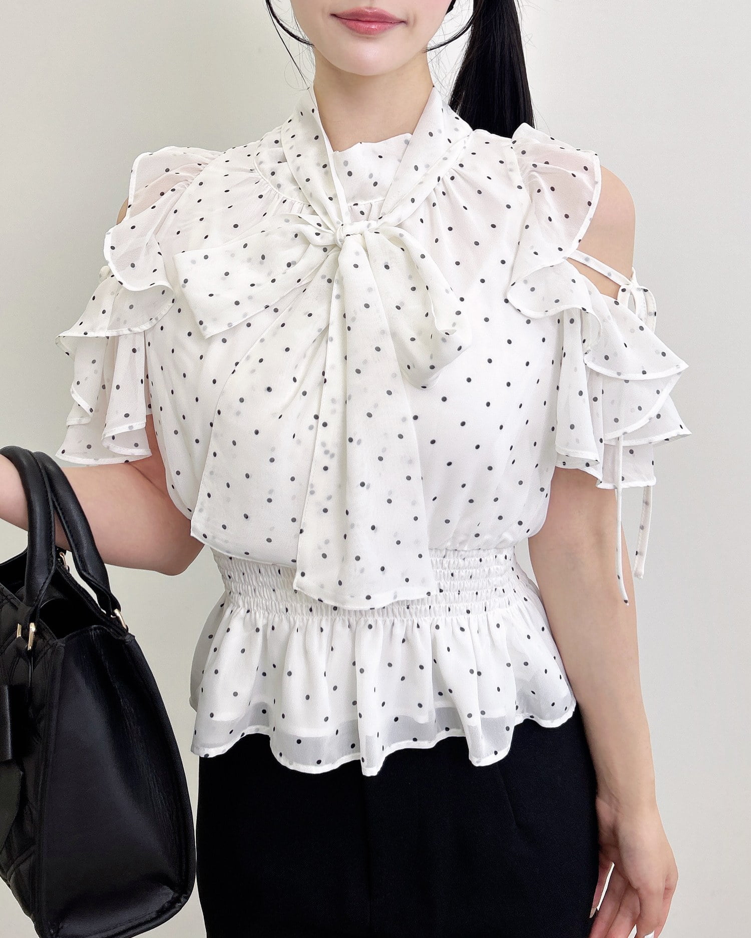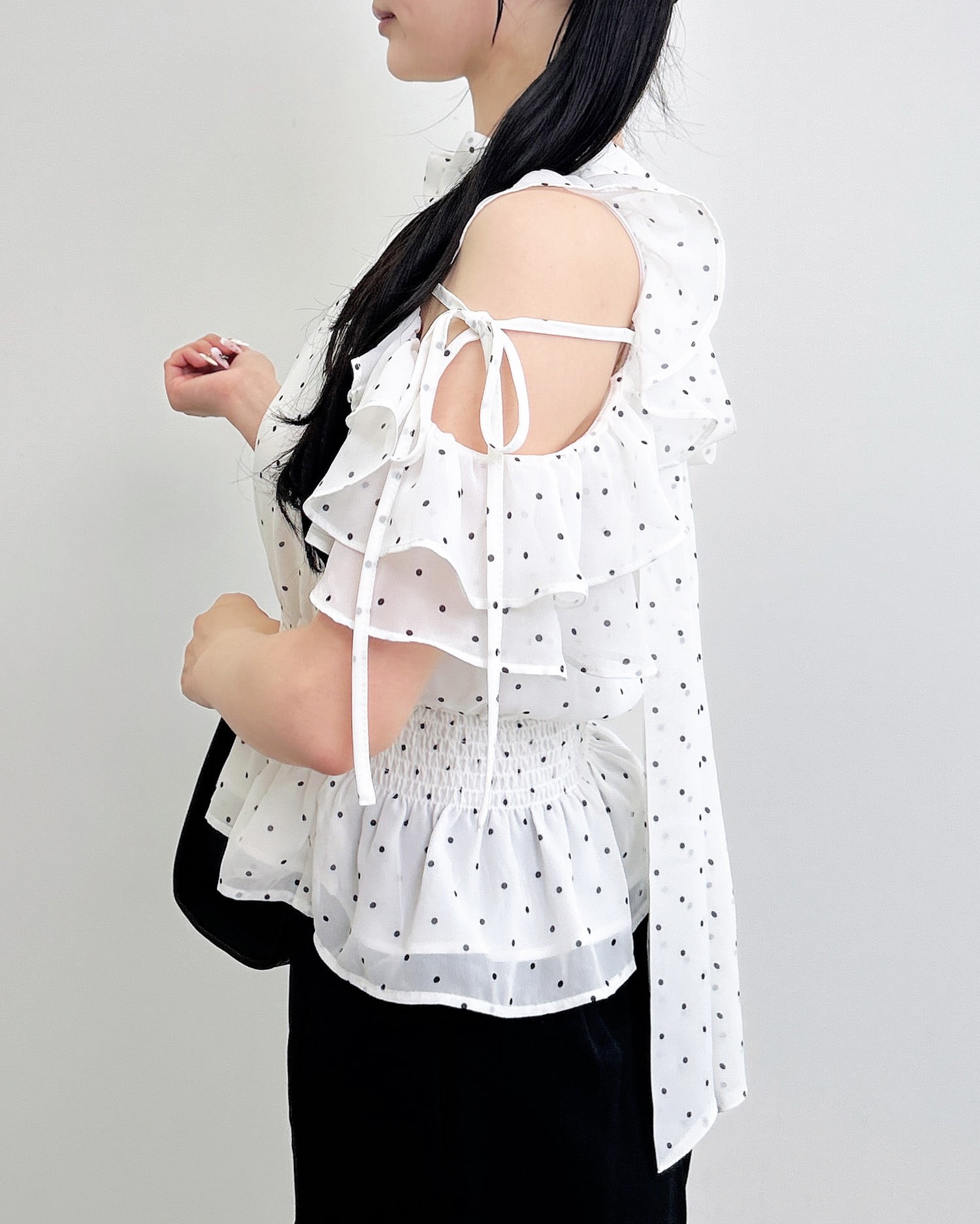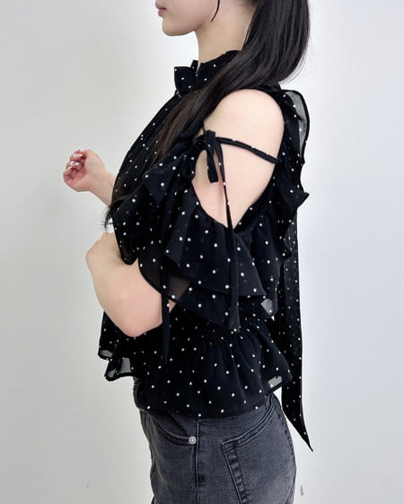 【1261-200261 2Wayリボン肩あきフリル半袖ブラウス】