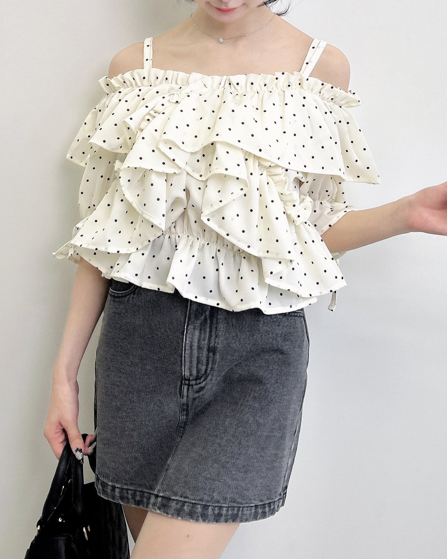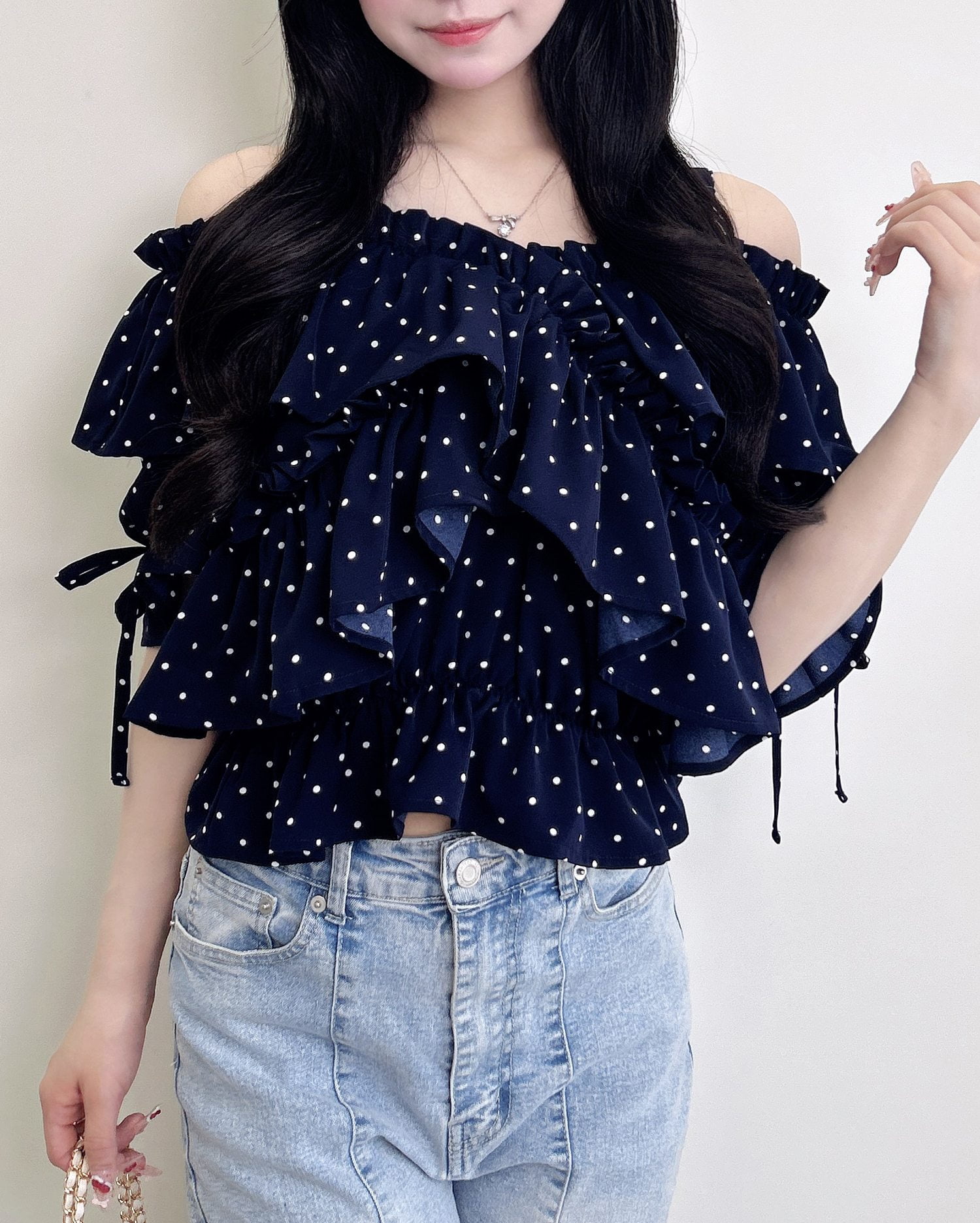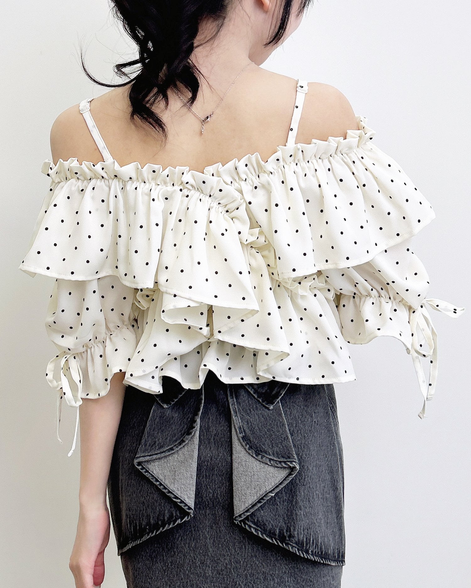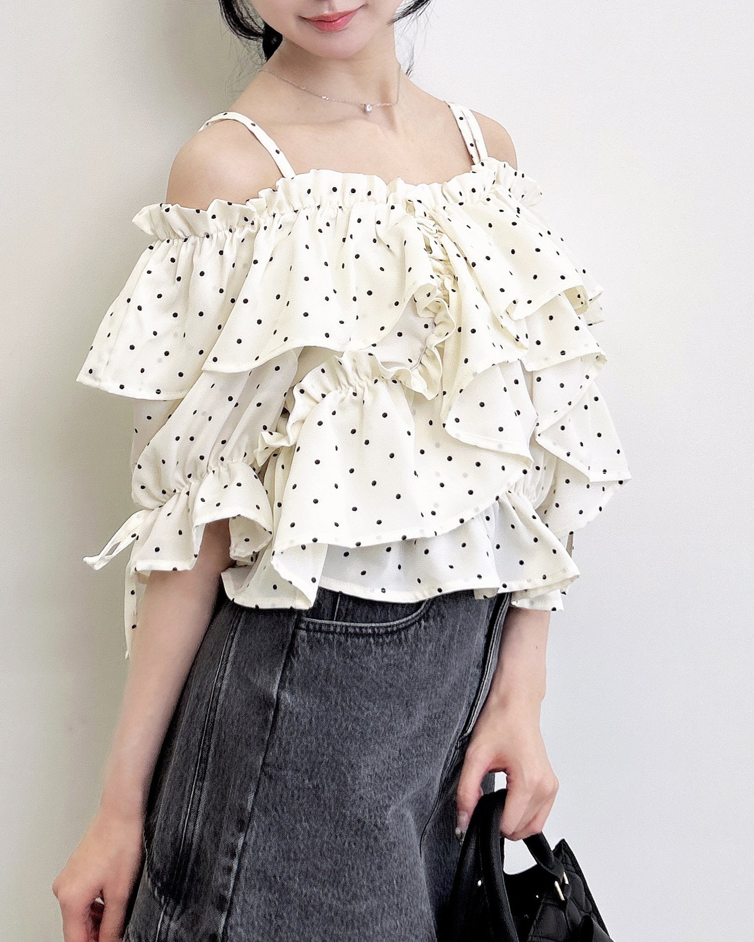 胸元でクロスさせたたっぷりフリルが着こなしに表情をプラス。
