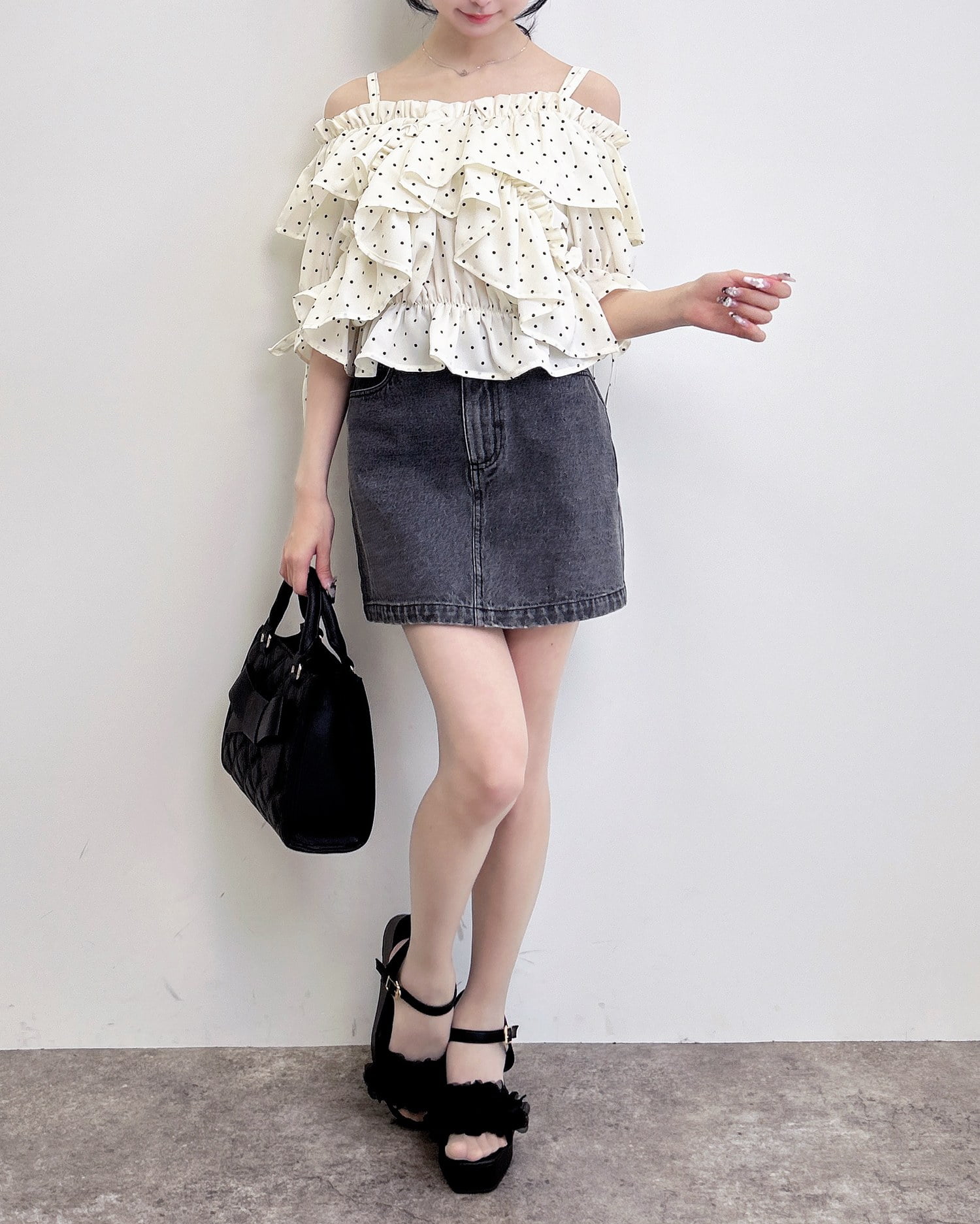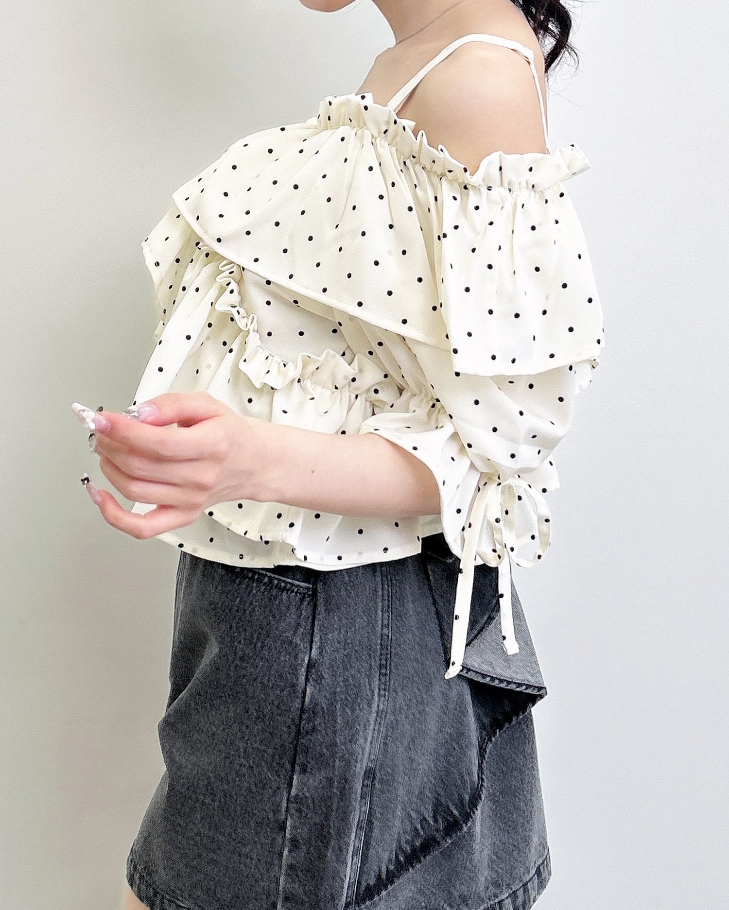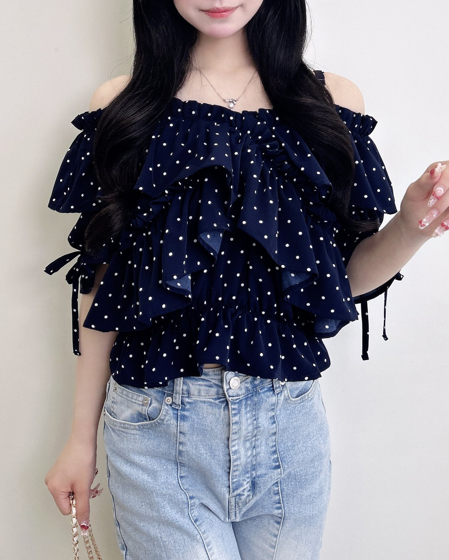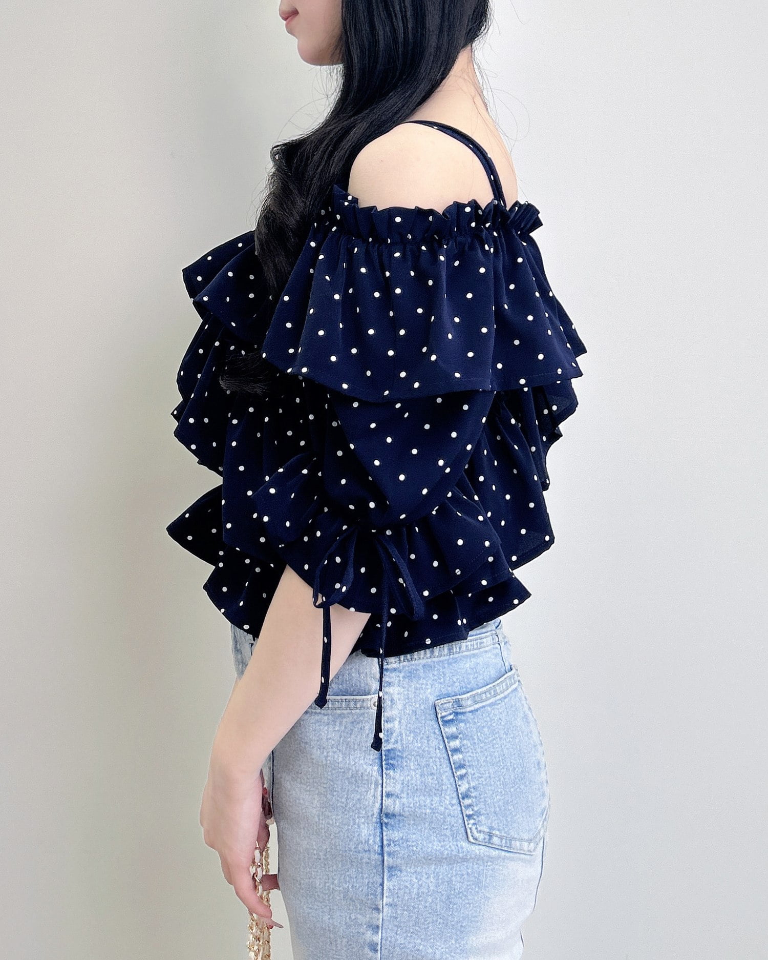 胸元でクロスさせたたっぷりフリルが着こなしに表情をプラス。