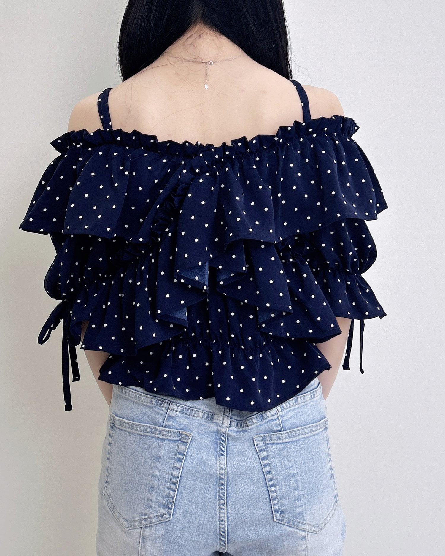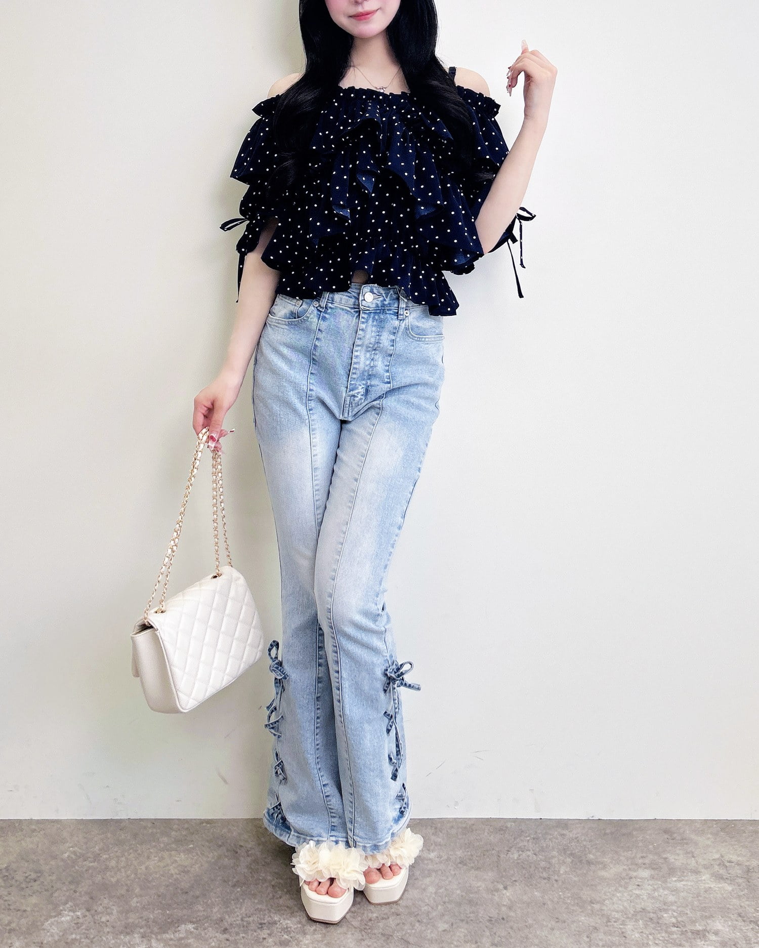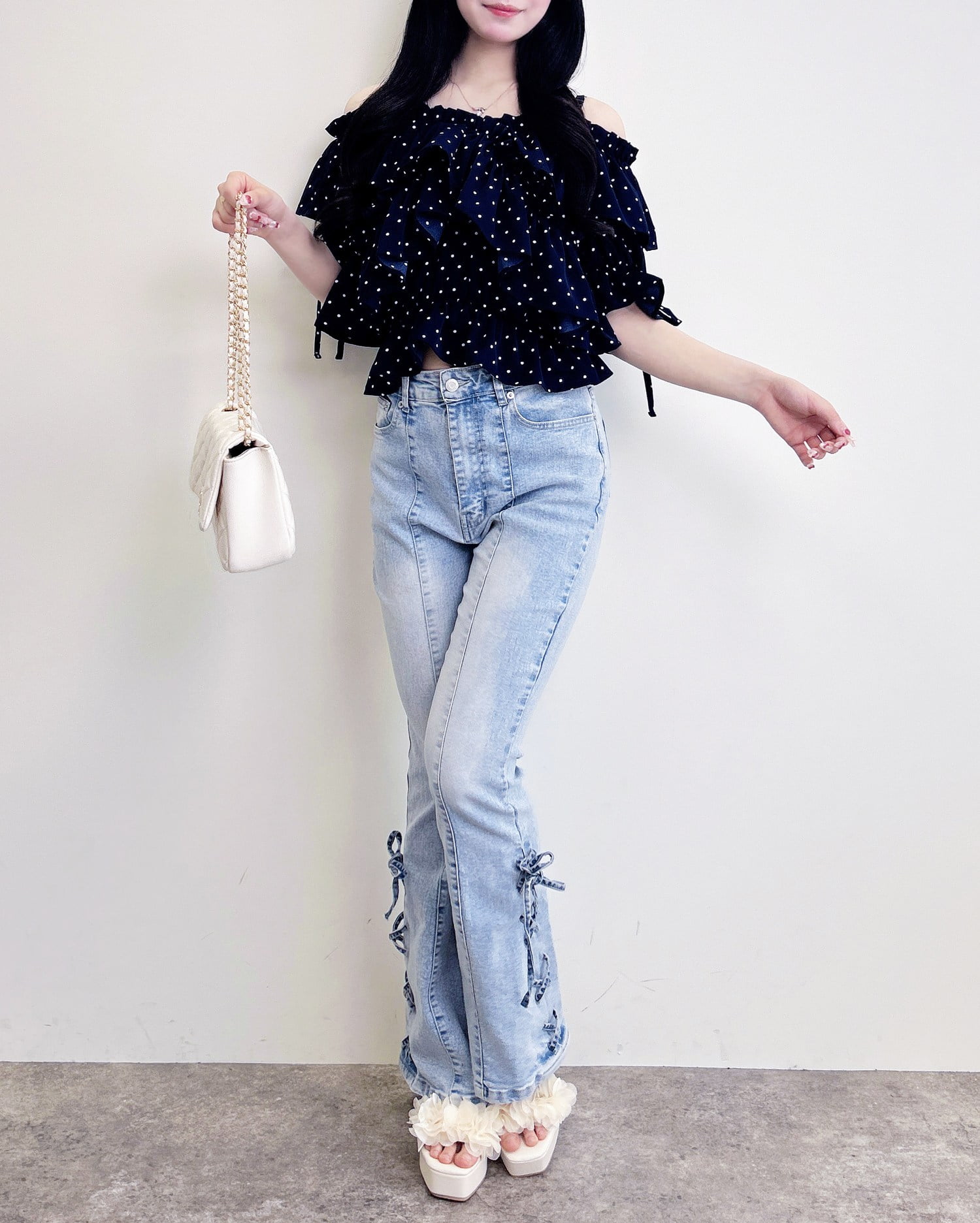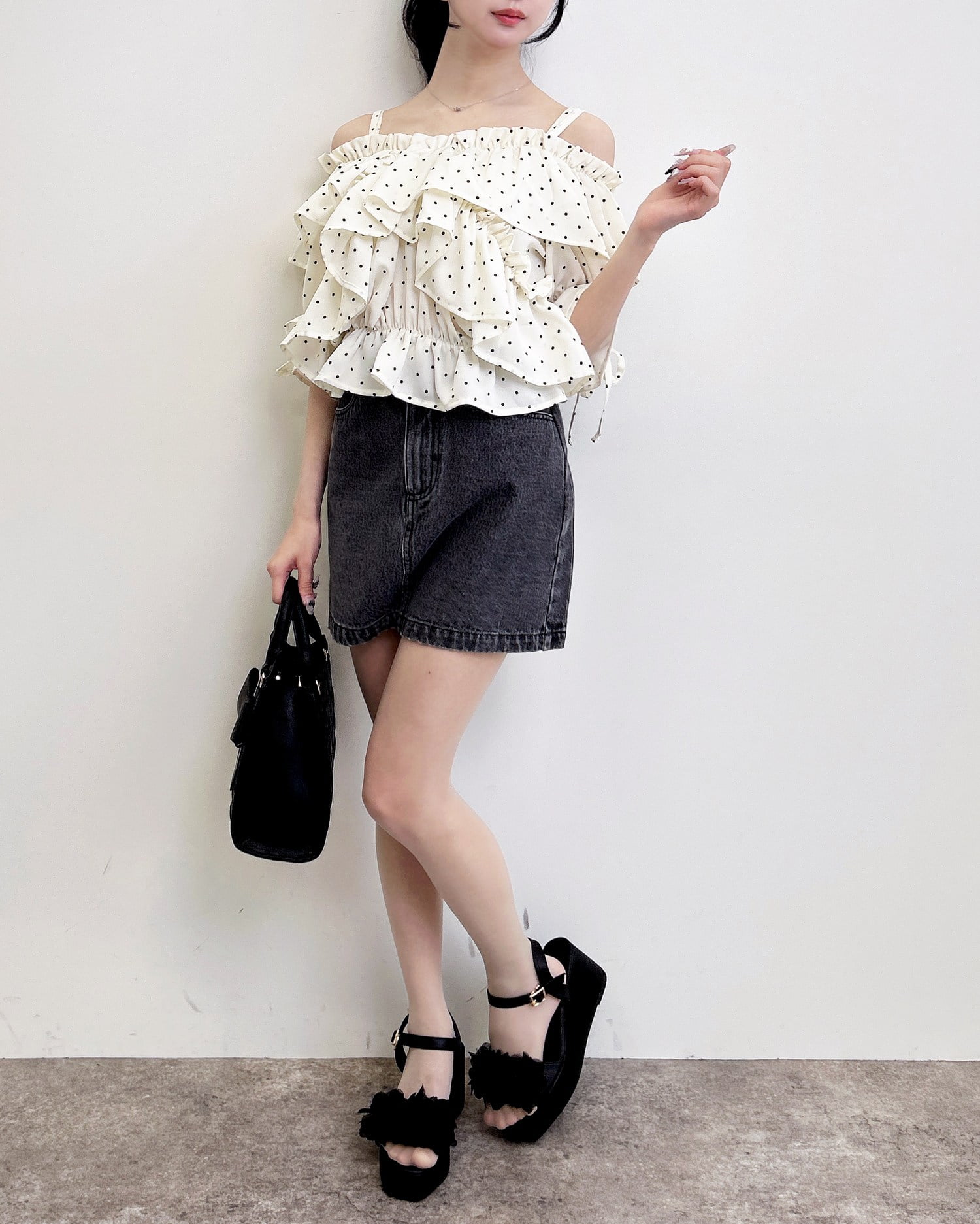 胸元でクロスさせたたっぷりフリルが着こなしに表情をプラス。