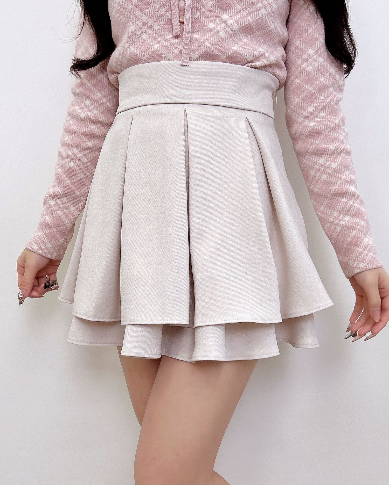 ウエスト下のタックから広がるフレアシルエットが華奢見えを叶えてくれるのも◎。