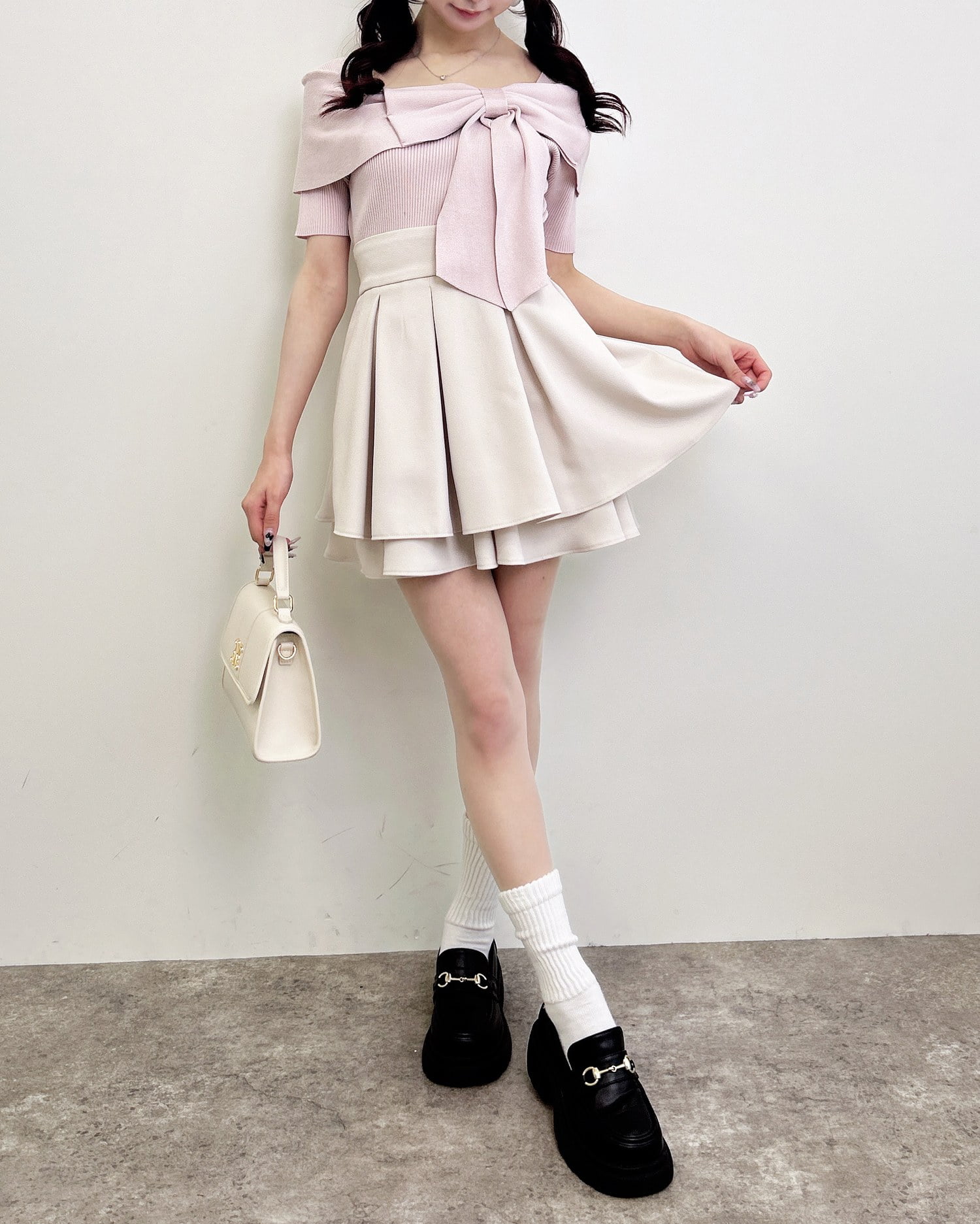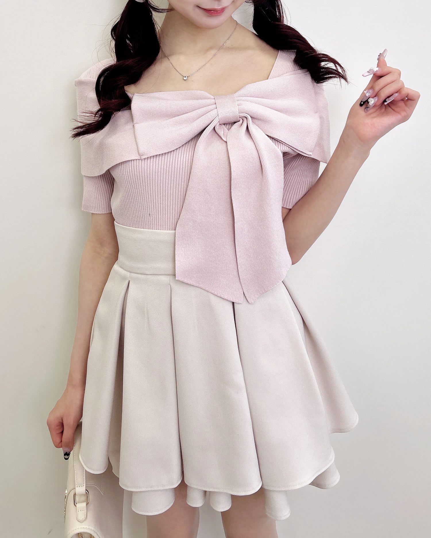 ウエスト下のタックから広がるフレアシルエットが華奢見えを叶えてくれるのも◎。