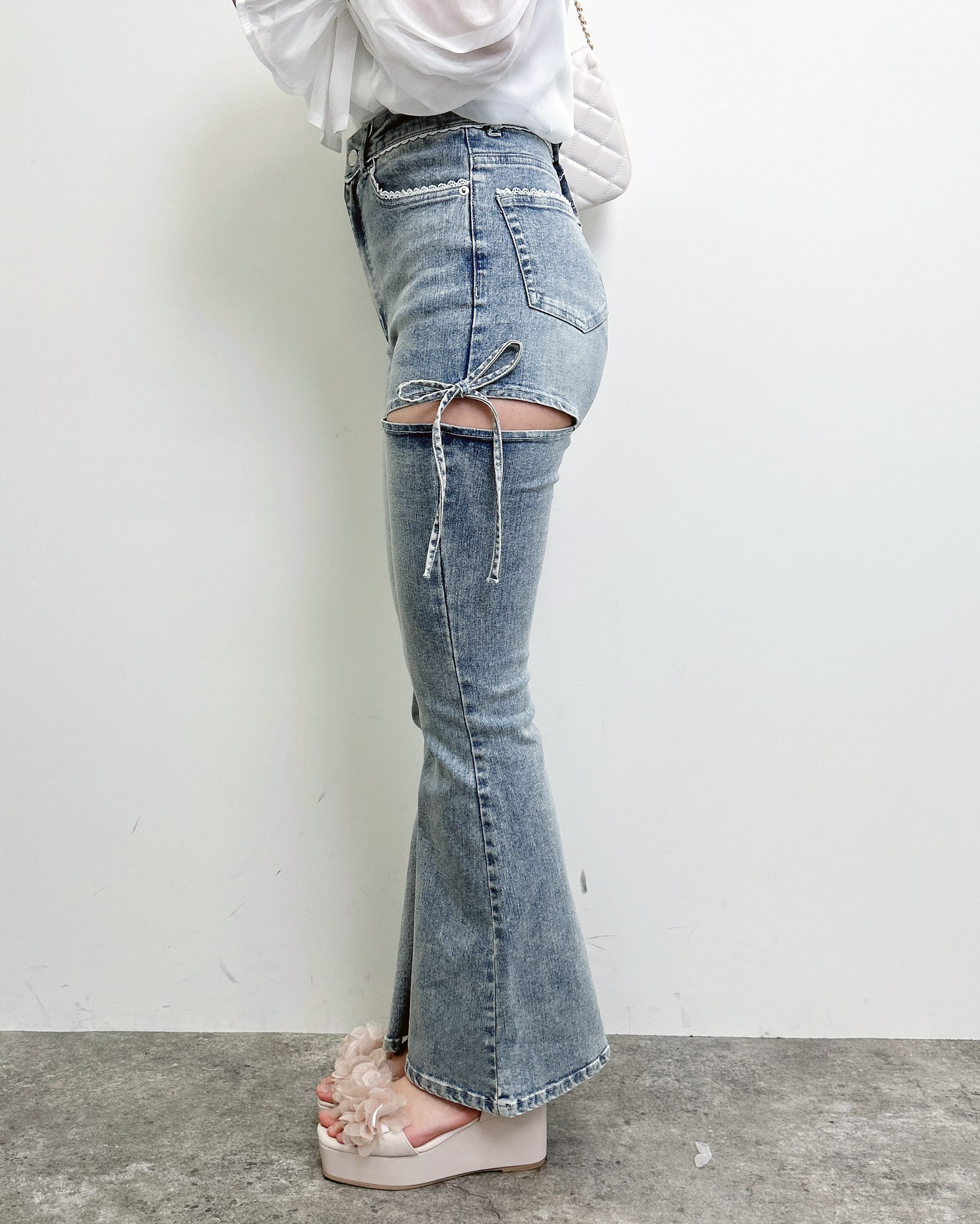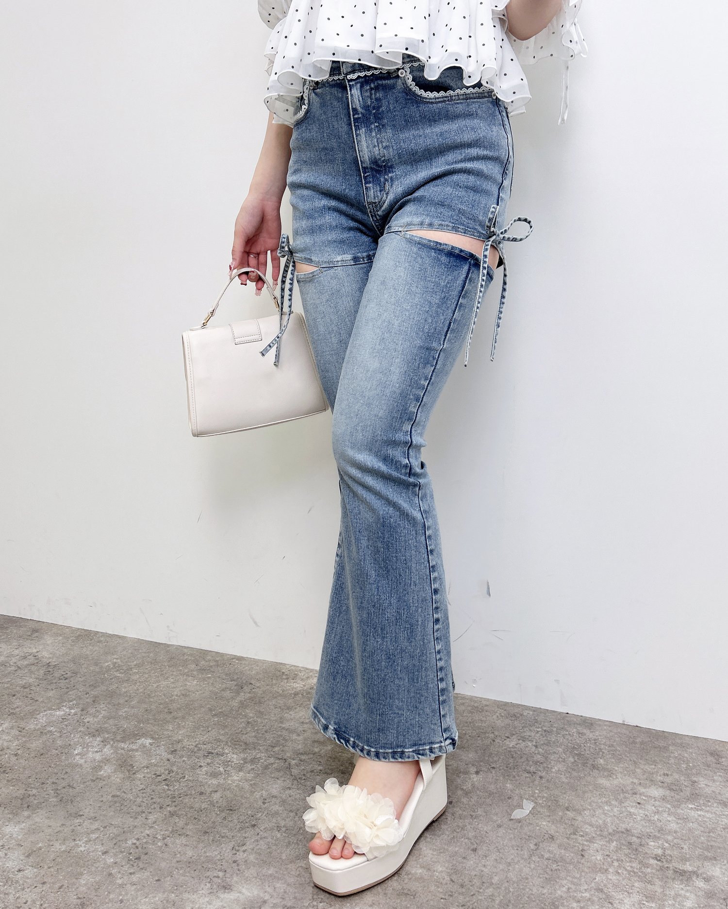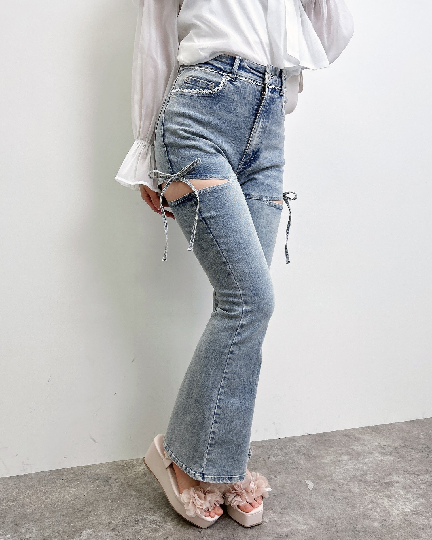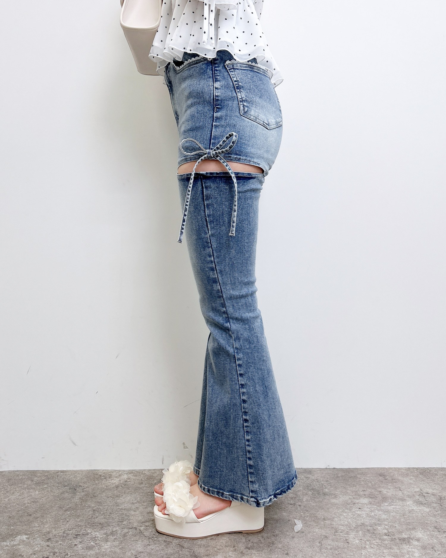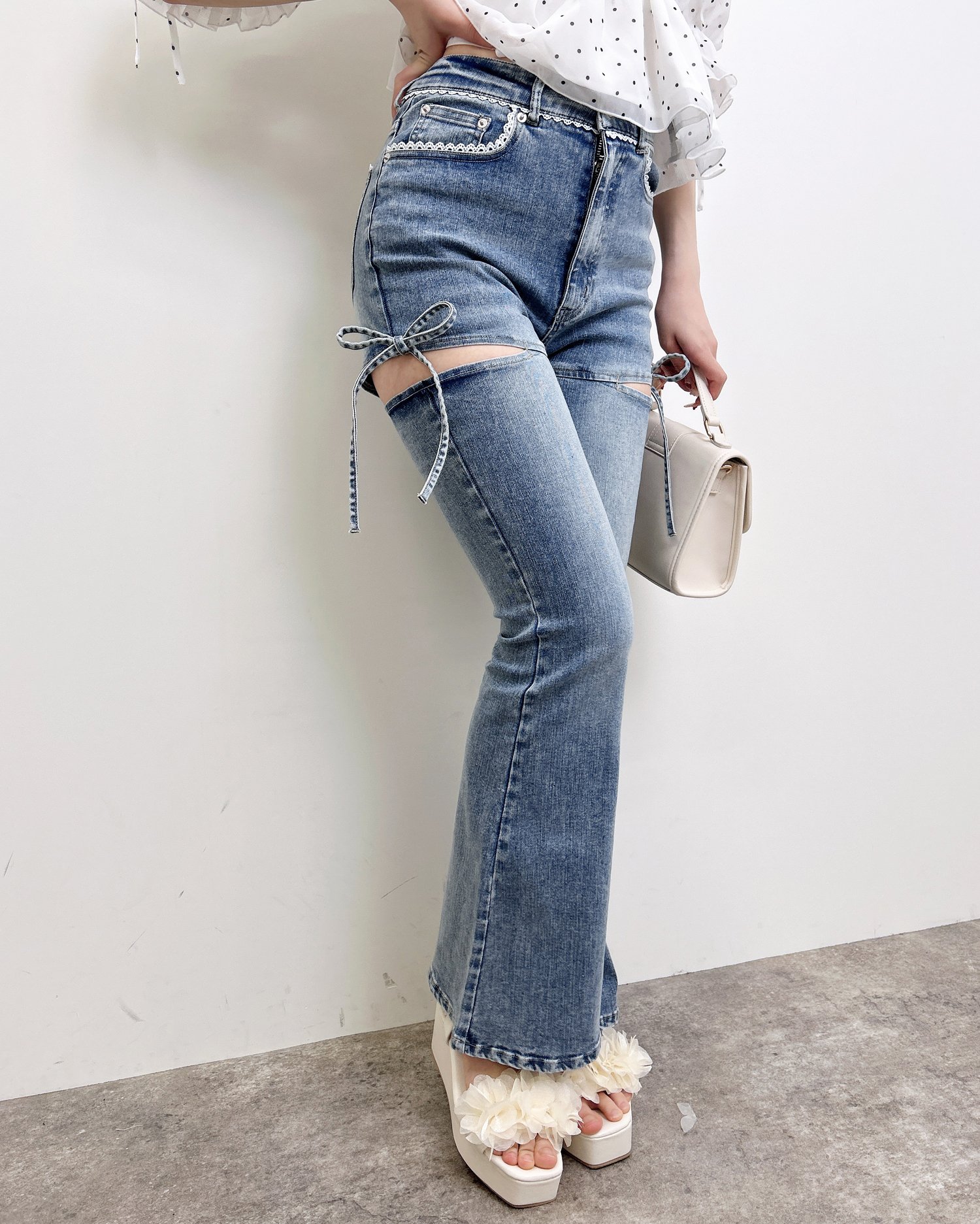【ほどよい肌見せとリボンディテールでトレンド感たっぷりのフレアデニム】