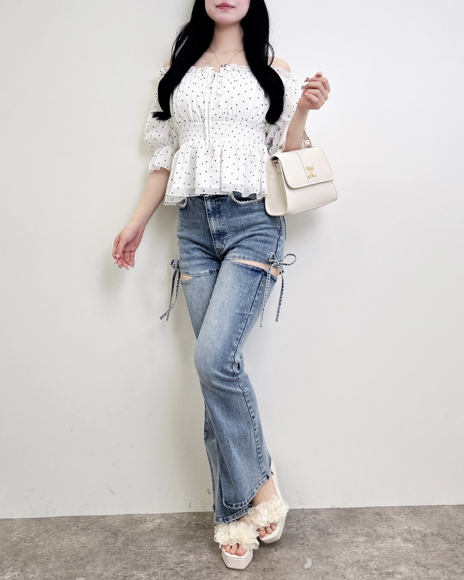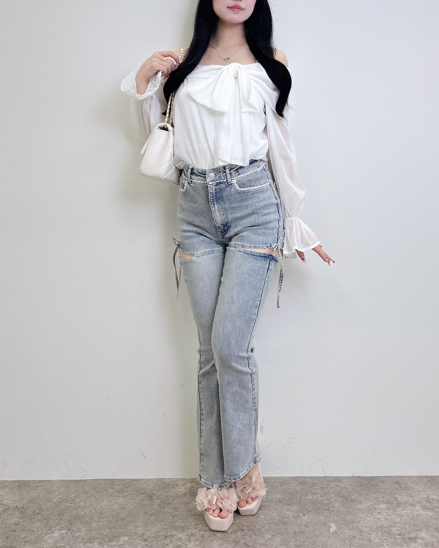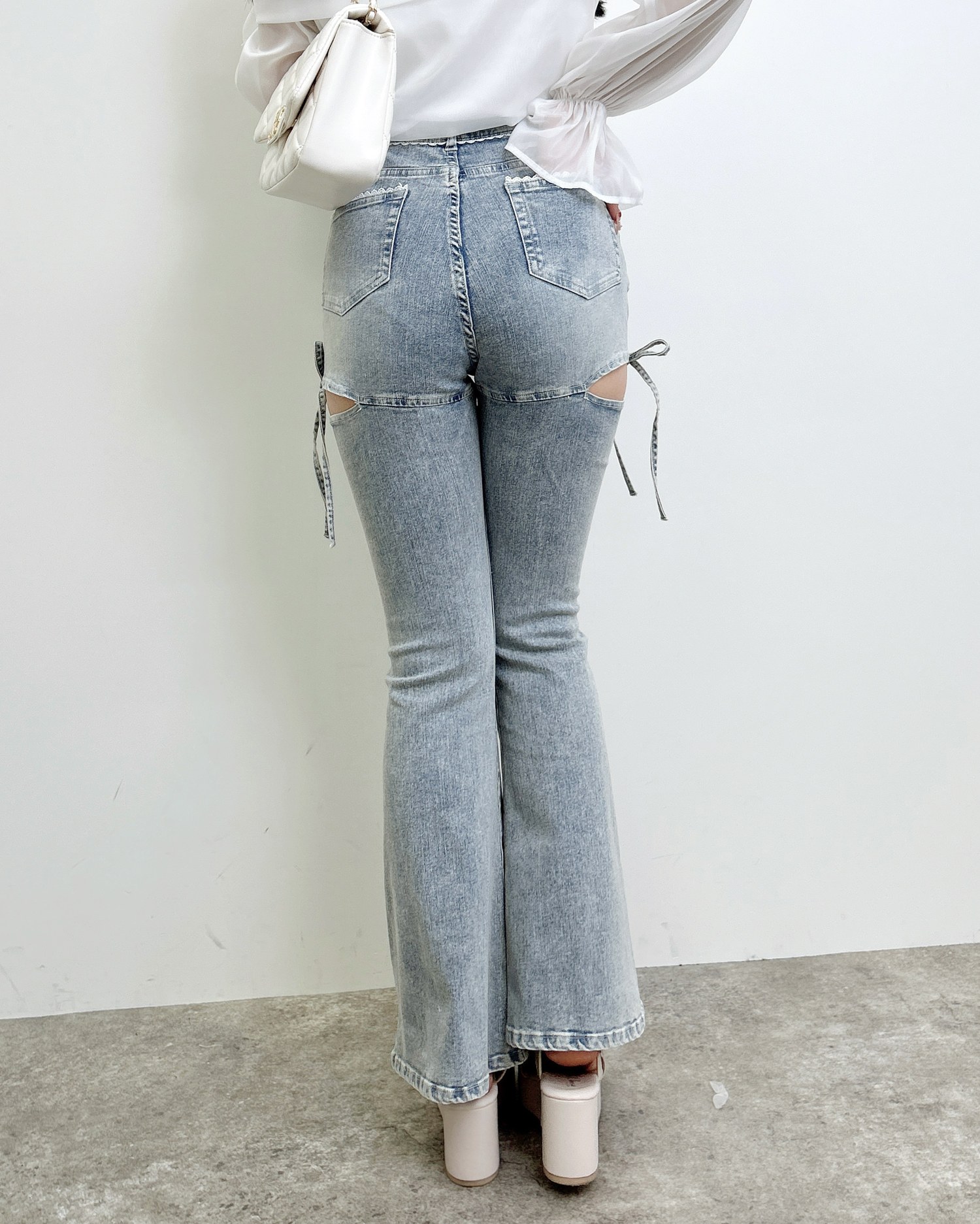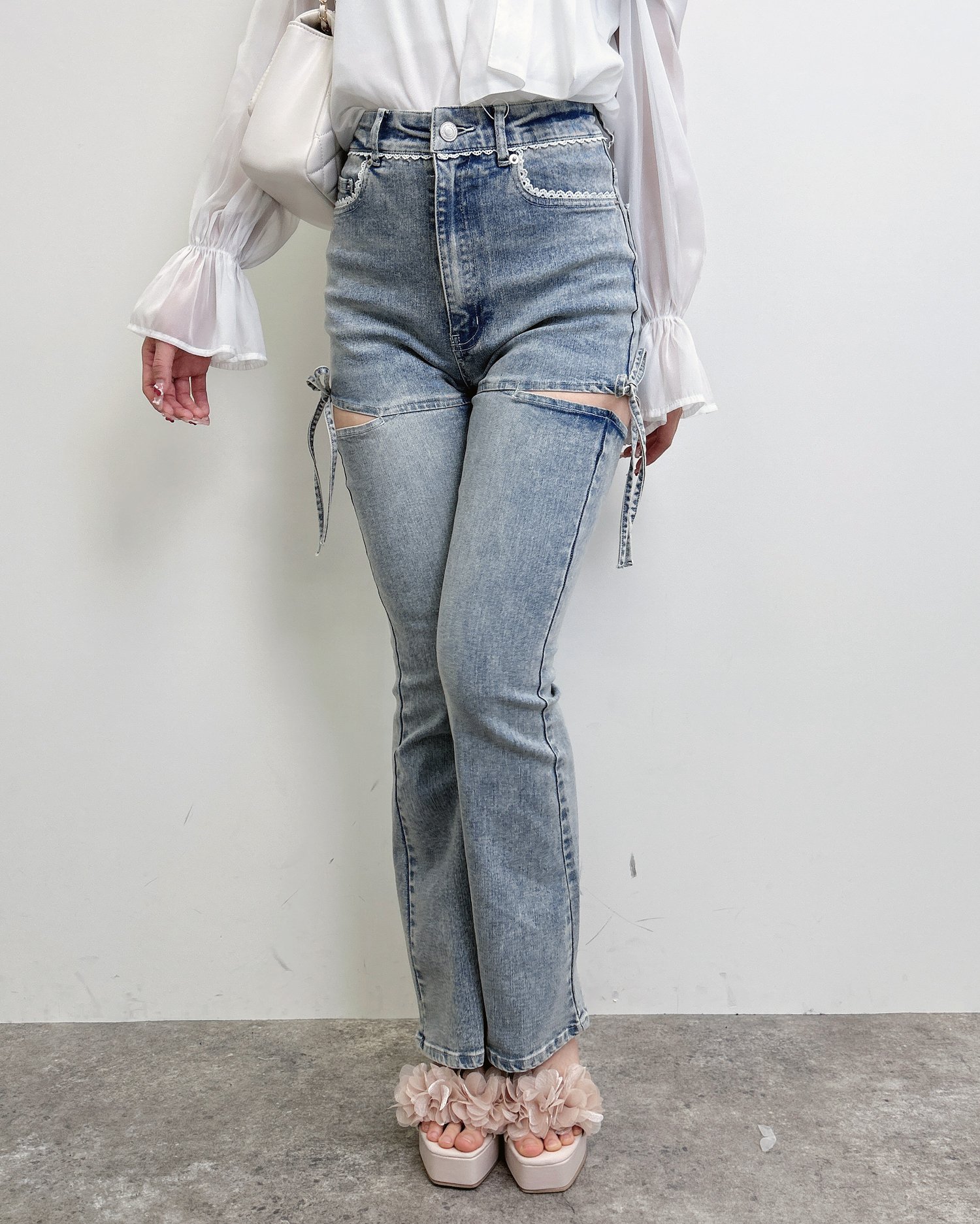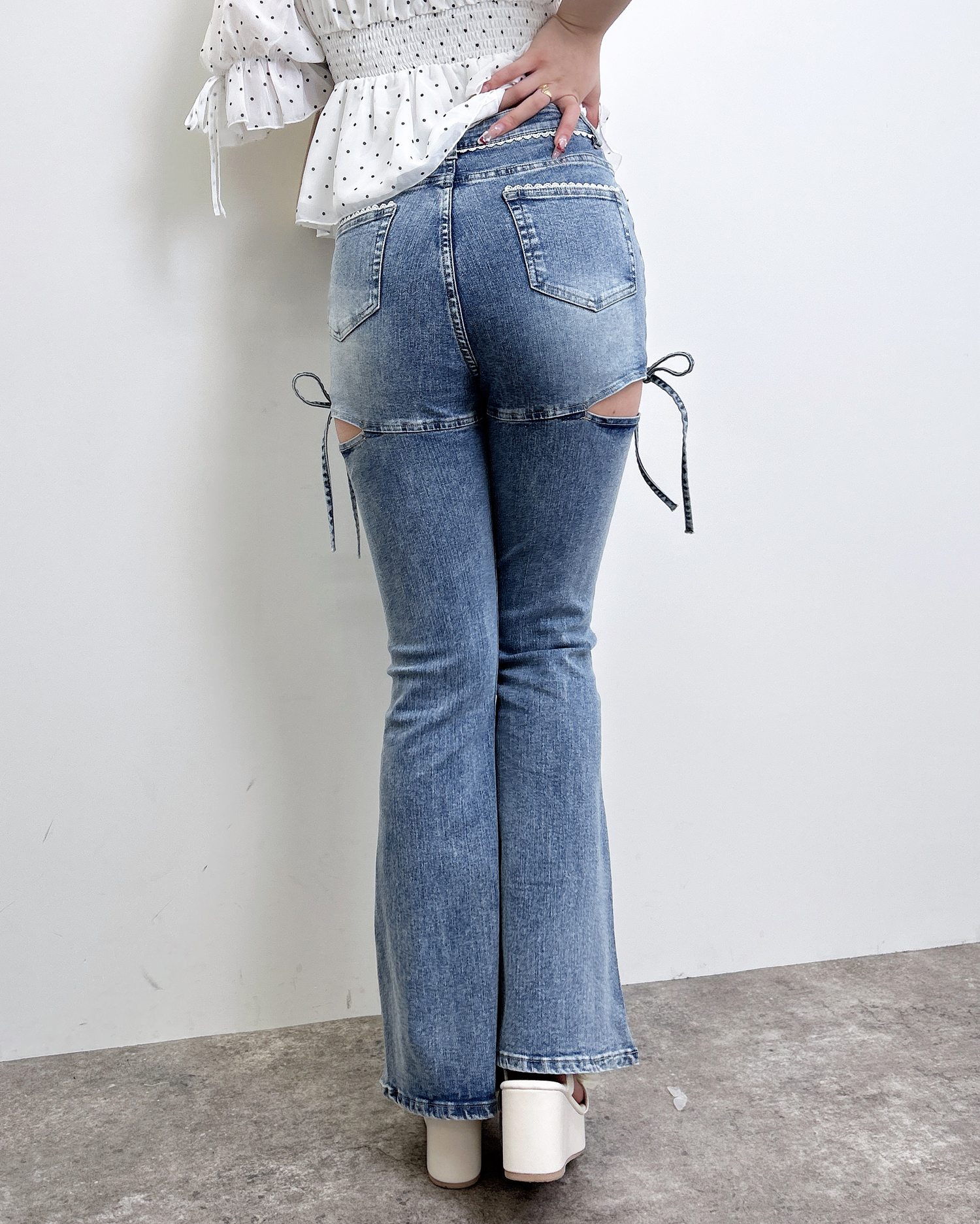 【ほどよい肌見せとリボンディテールでトレンド感たっぷりのフレアデニム】