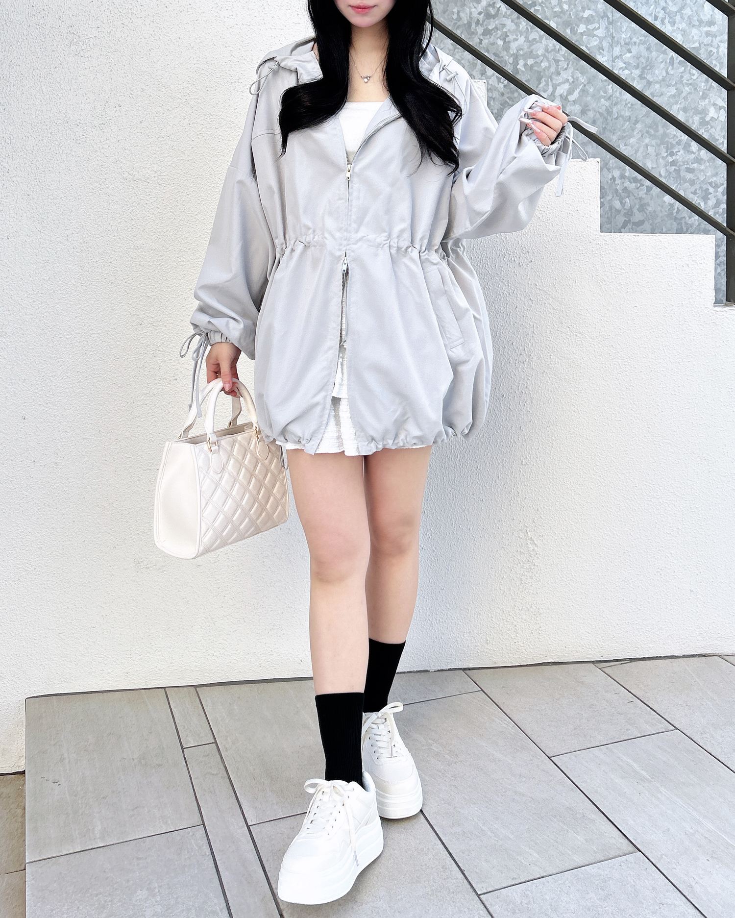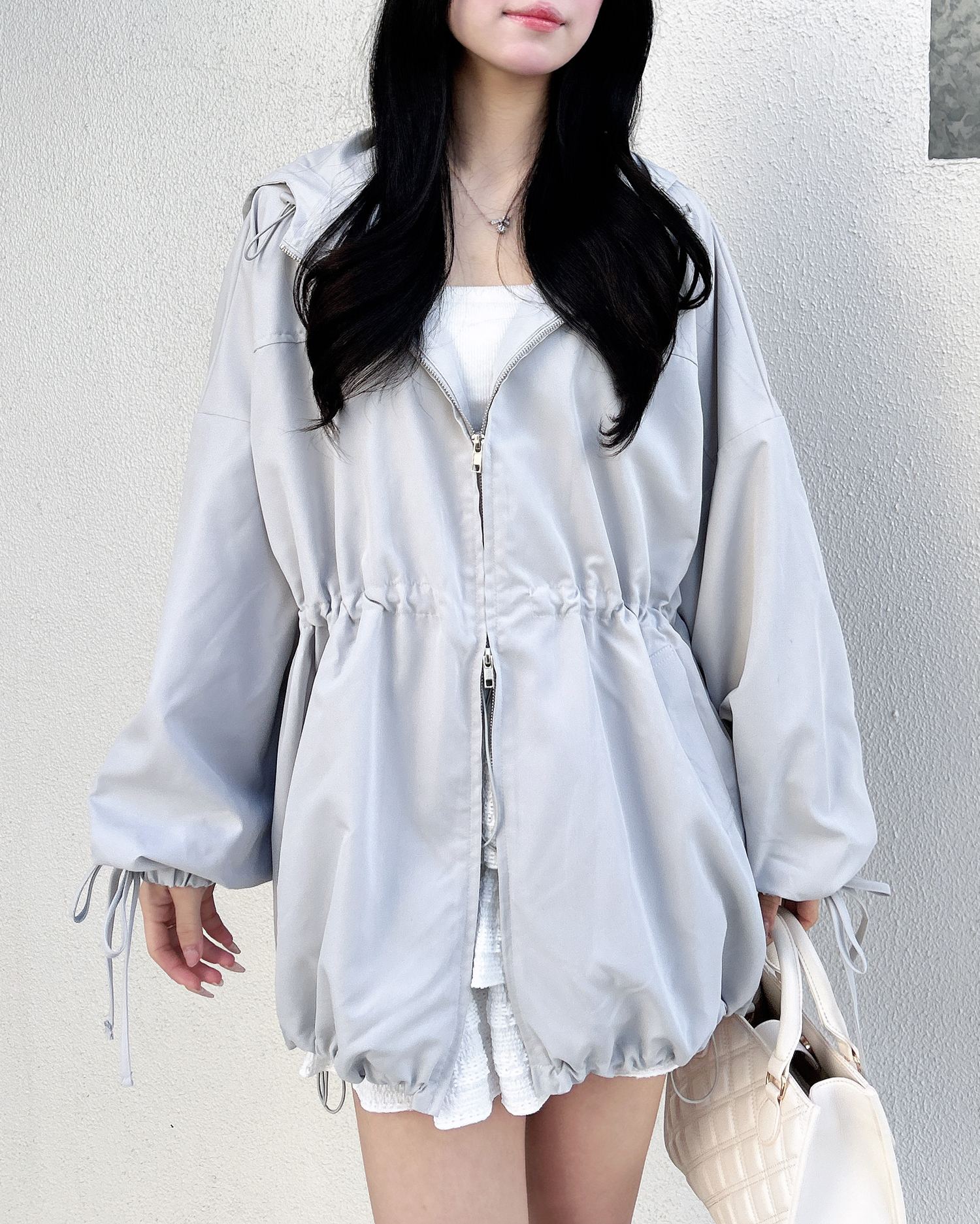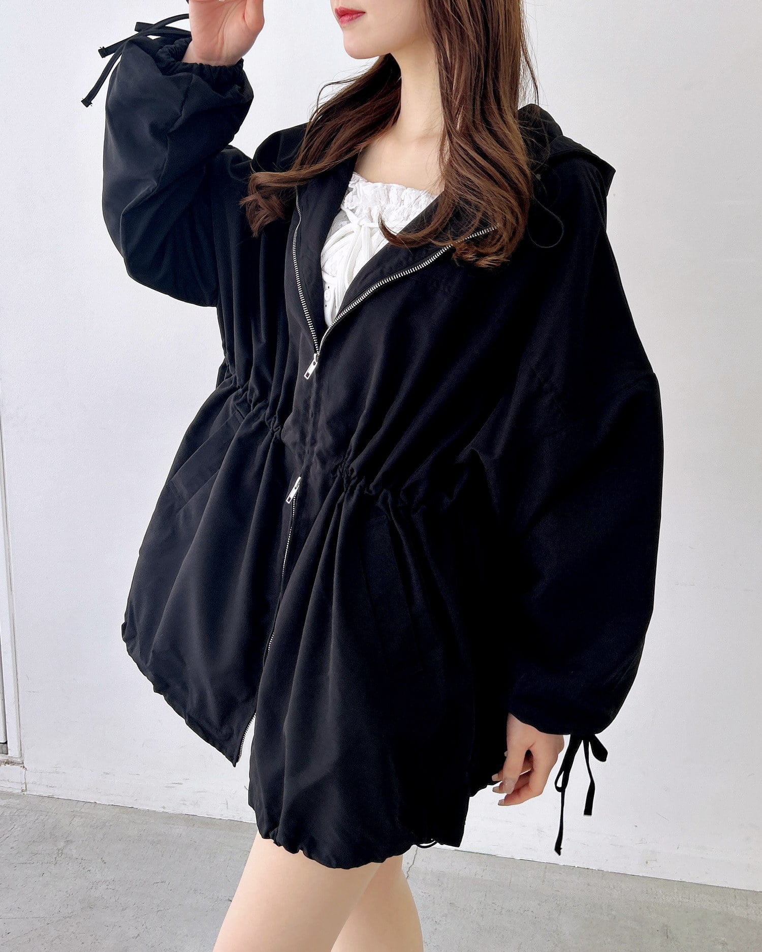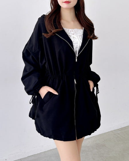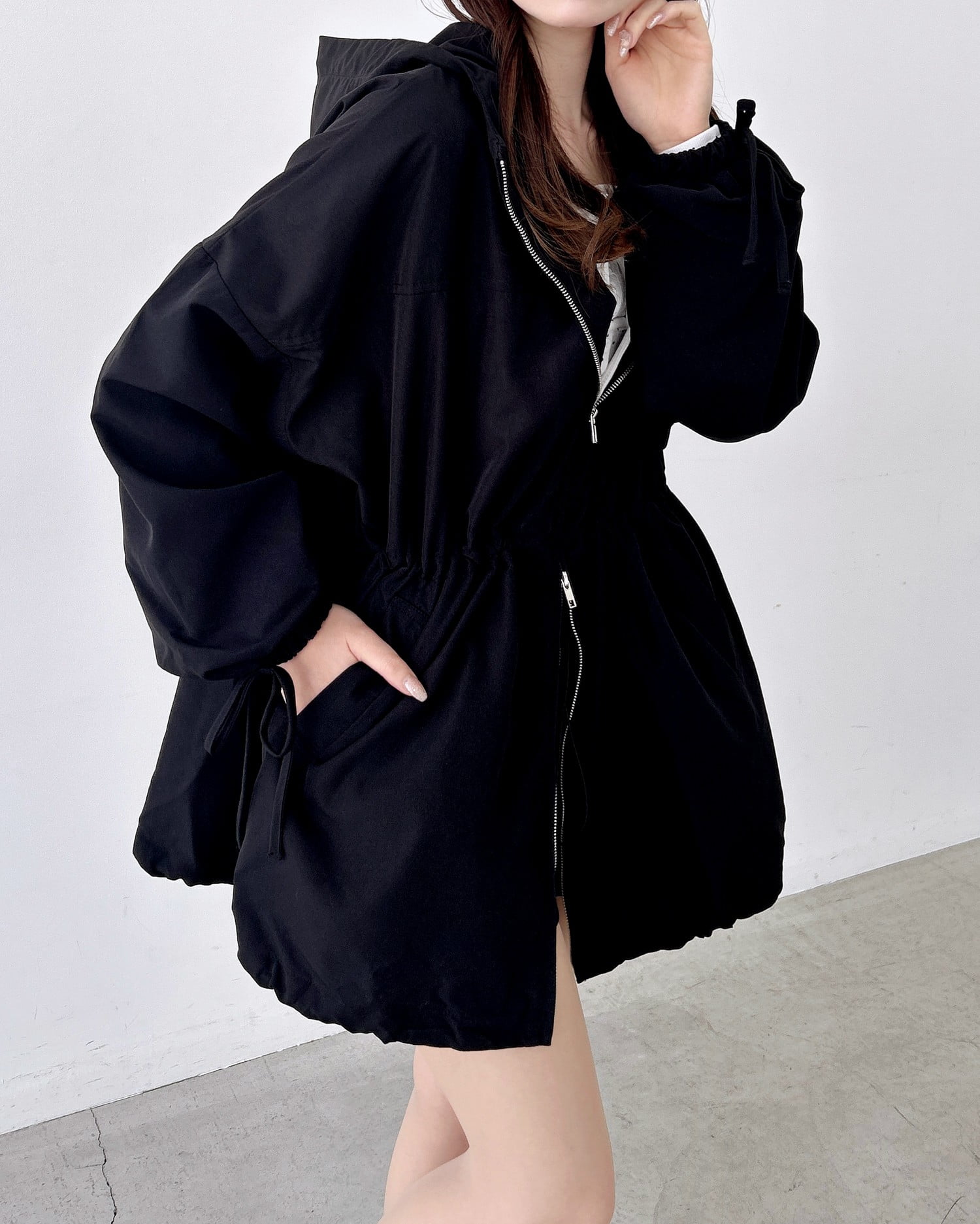 ウエスト・裾部分のドローコード、ダブルジップ付きなので