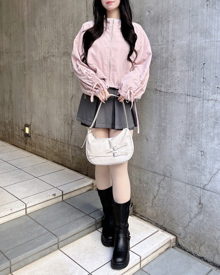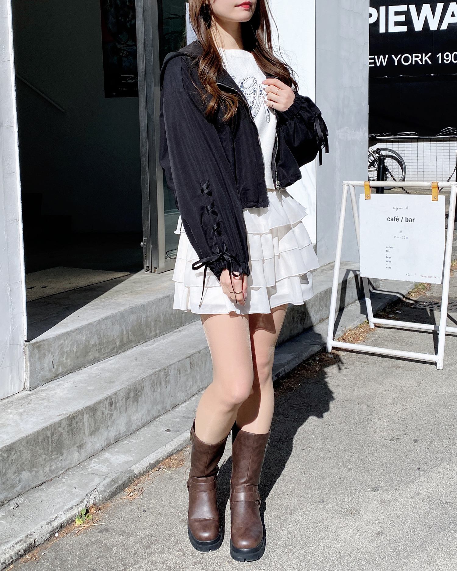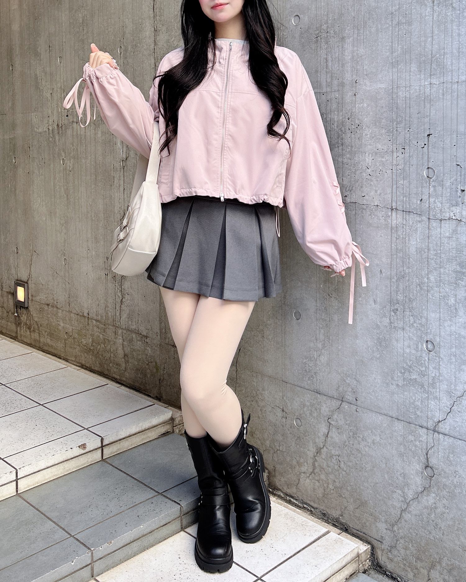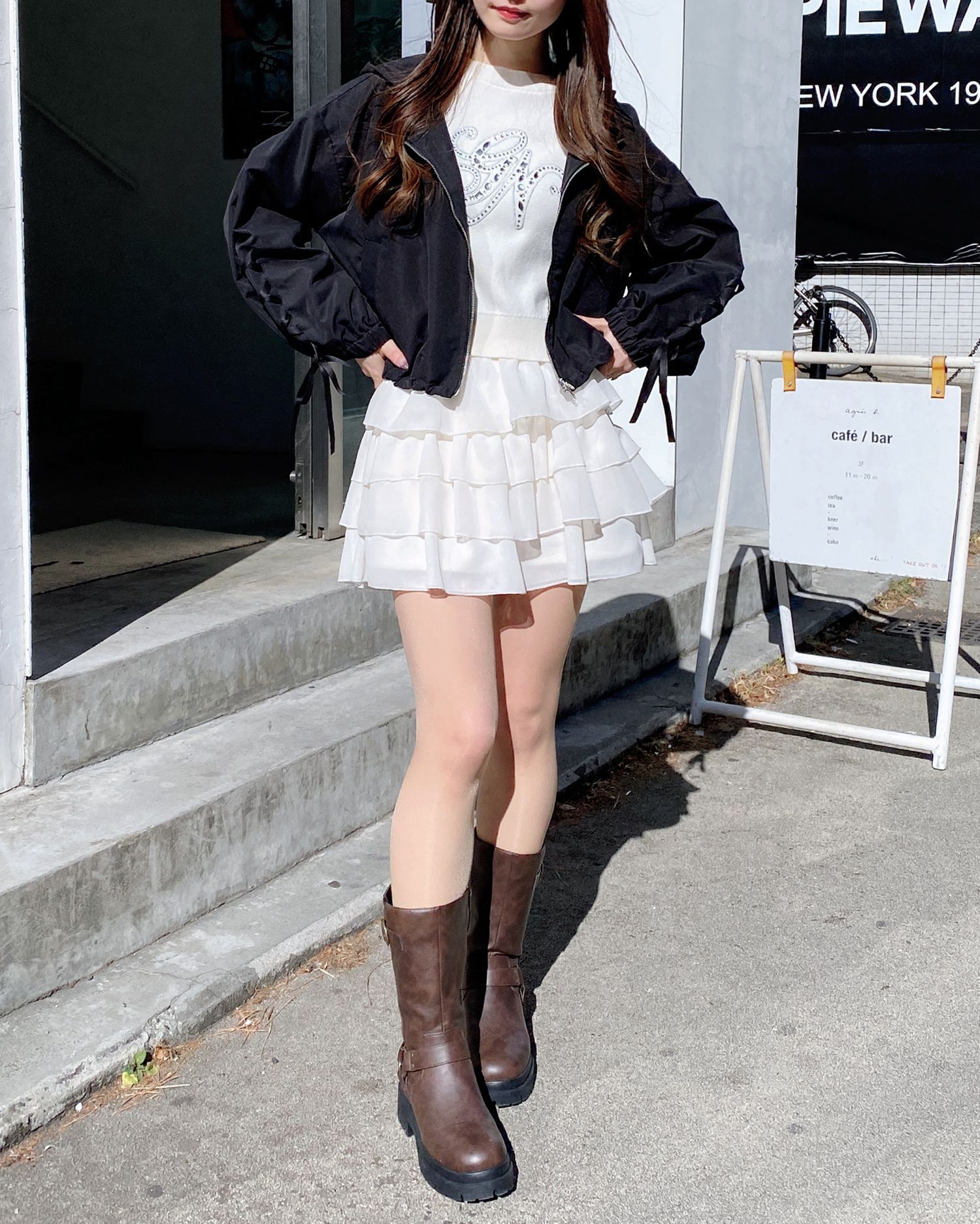 ミニスカートを合わせたガーリーなスタイリングもおすすめ。
