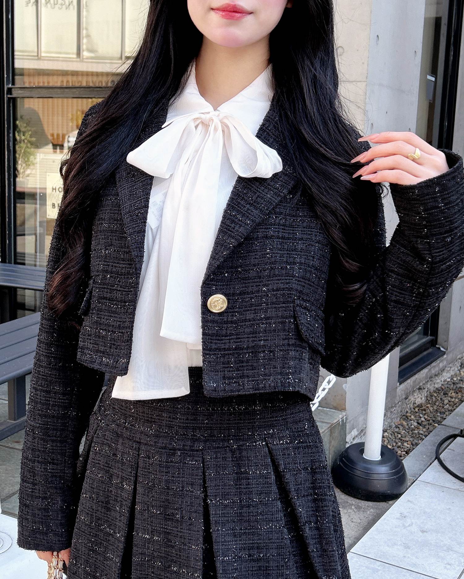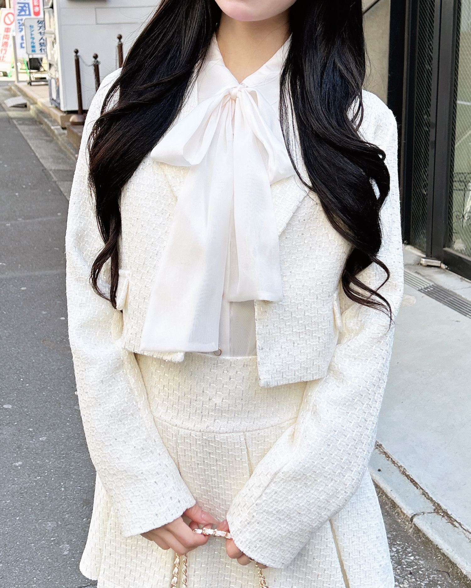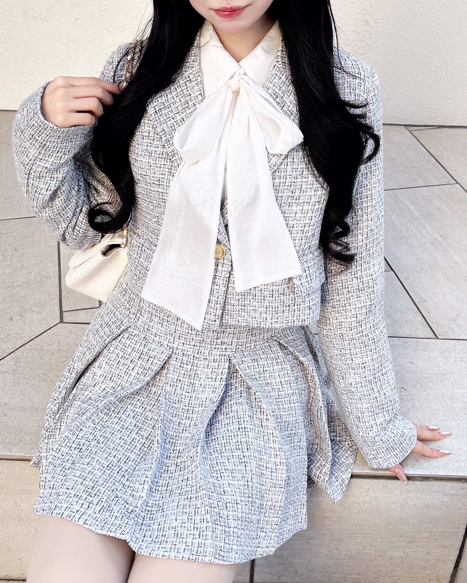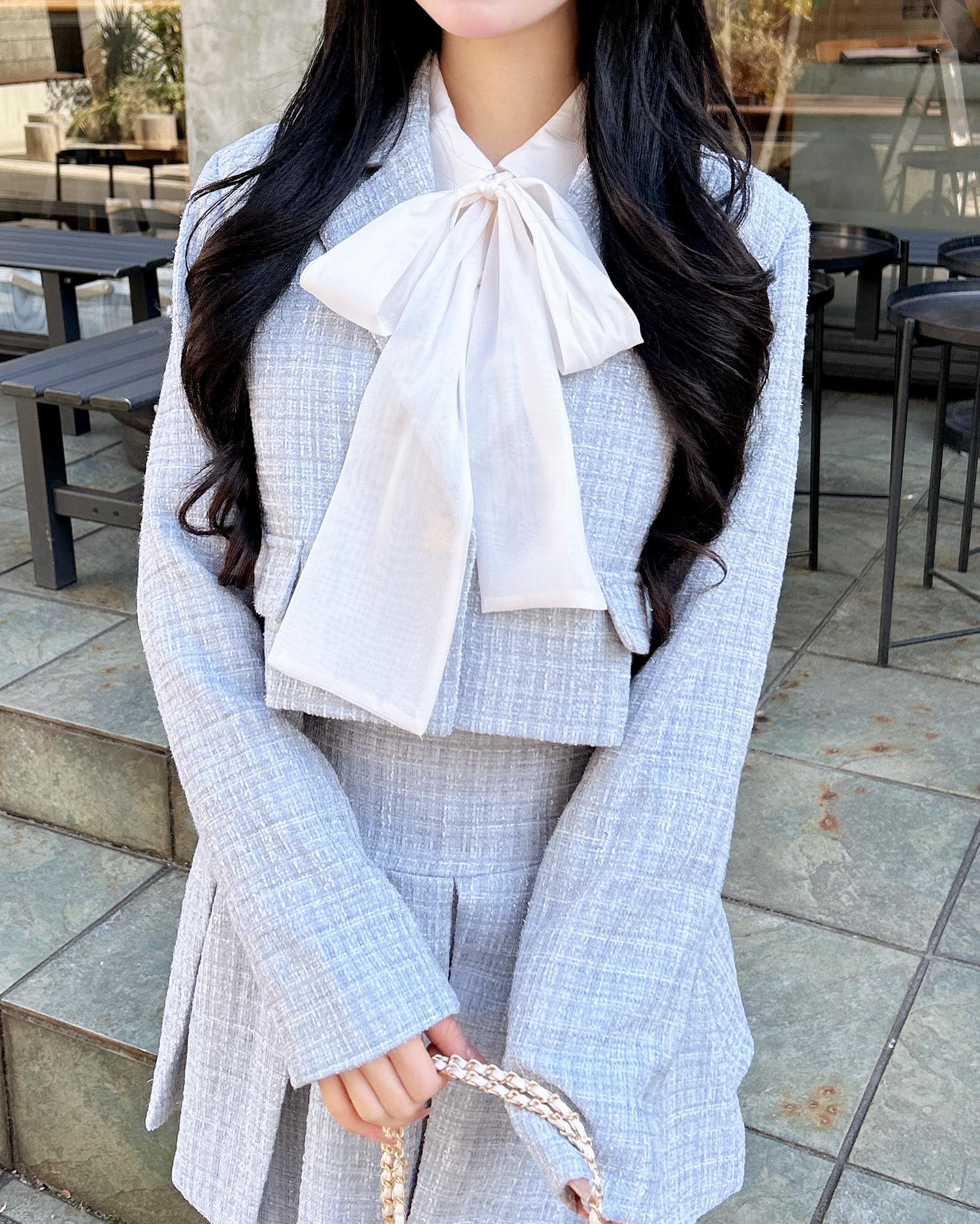 上品なツイード生地でオンオフ問わずに着まわせる