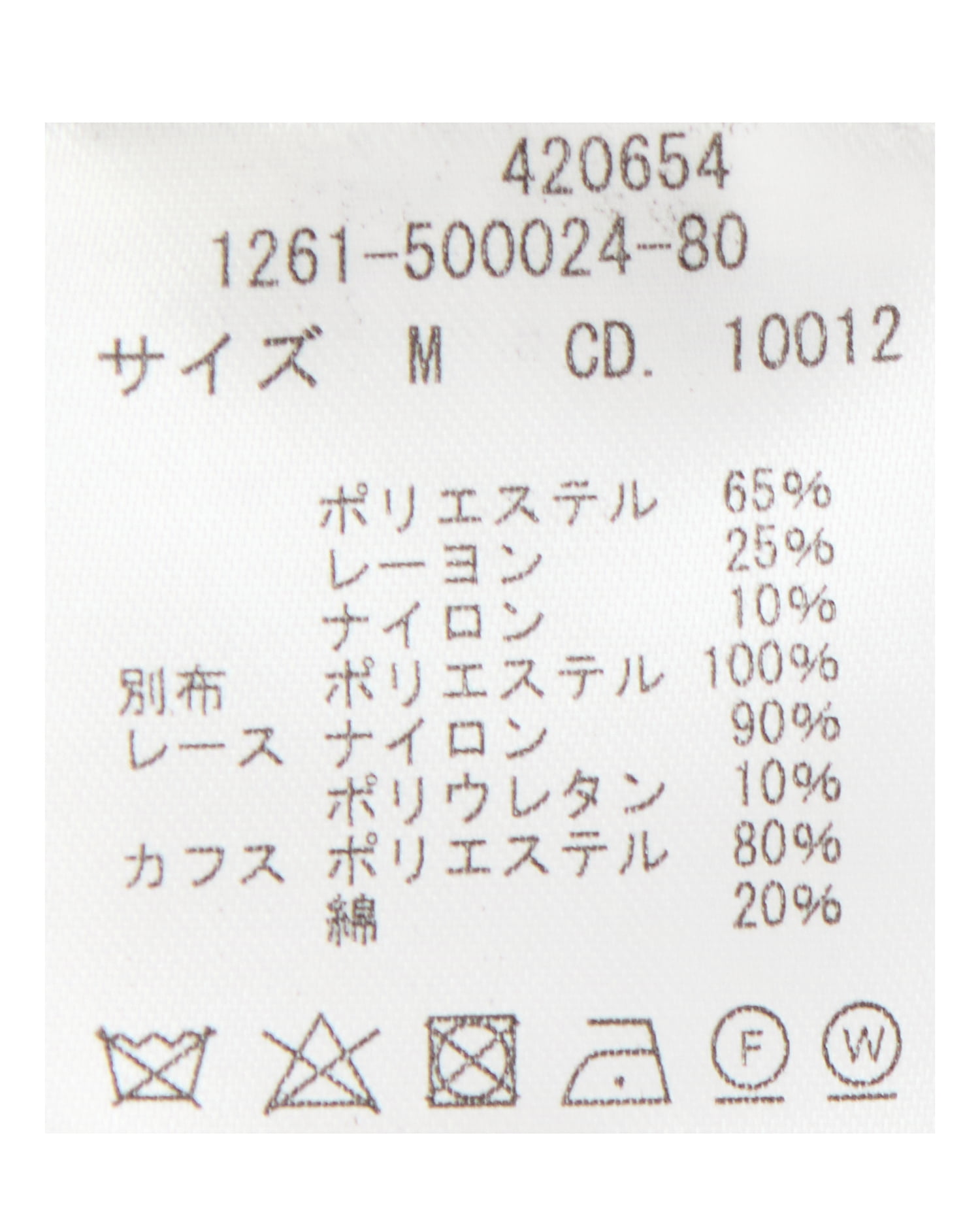 原産国 中国 ニット ポリエステル65% ニット レーヨン25% ニット ナイロン10% 別布 ポリエステル100% レース ナイロン90% レース ポリウレタン10% カフス ポリエステル80% カフス 綿20%