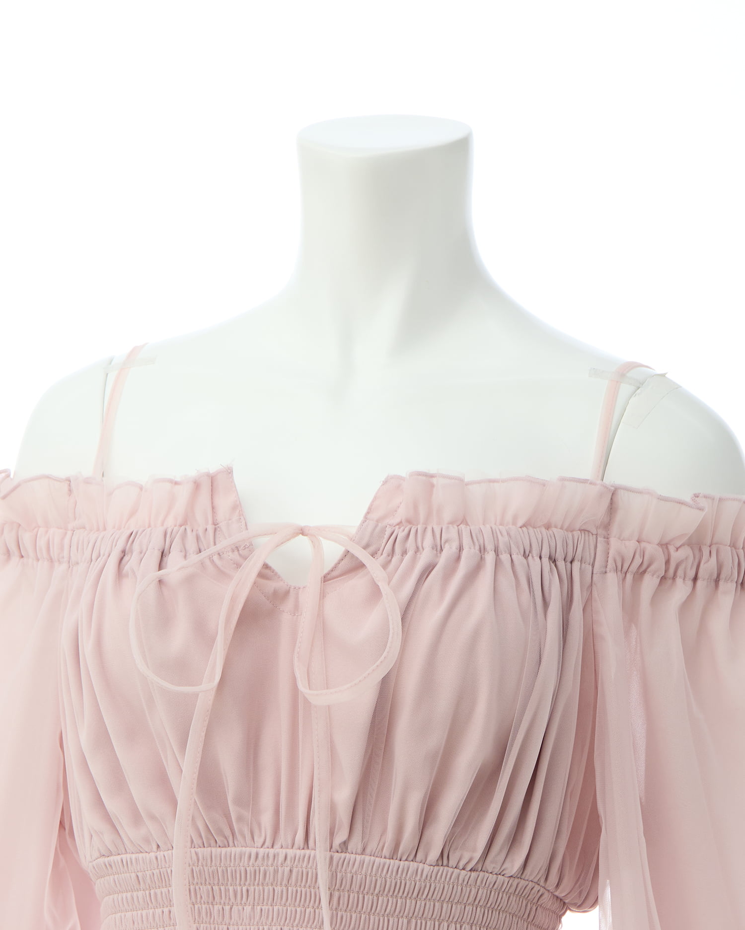 デコルテラインをキレイに見せ、ヘルシーな肌見せを叶えるオフショルデザイン。