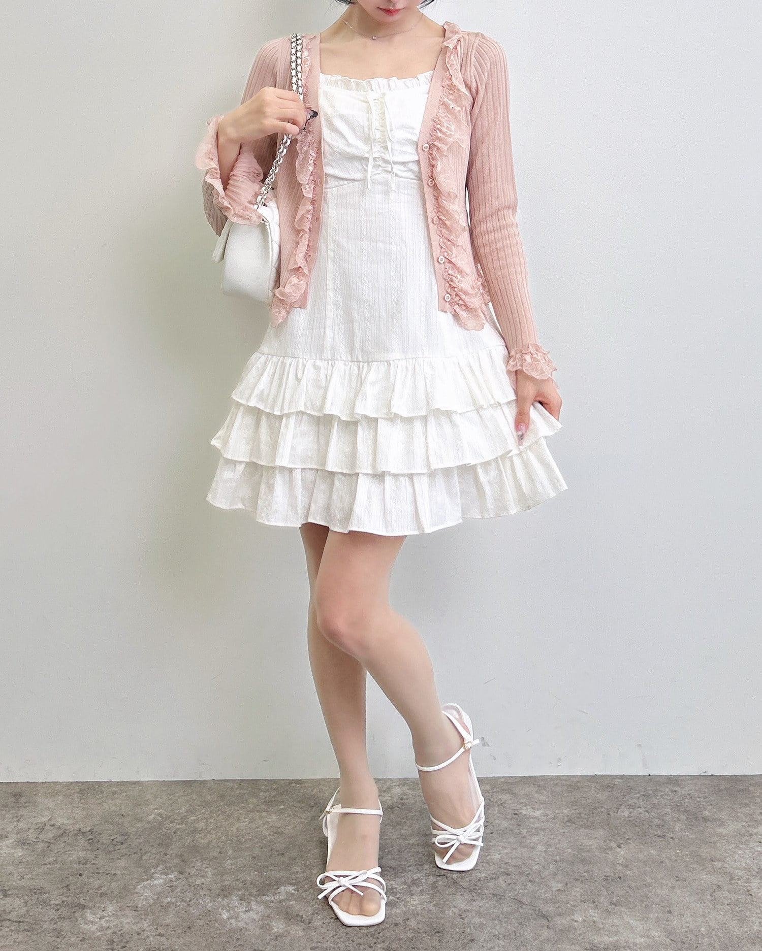 ふんわり広がるフリルデザインが華やかなキャミワンピース。