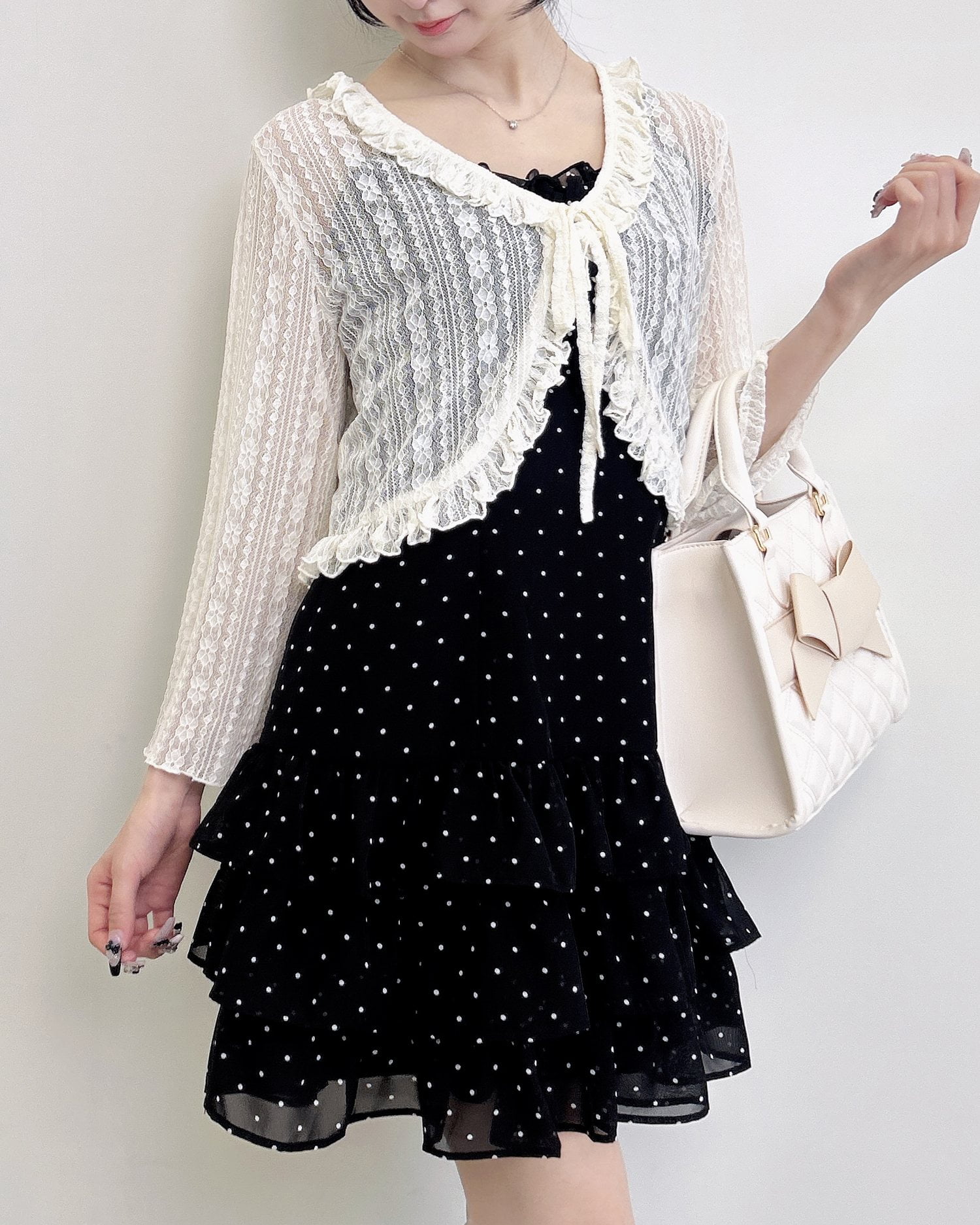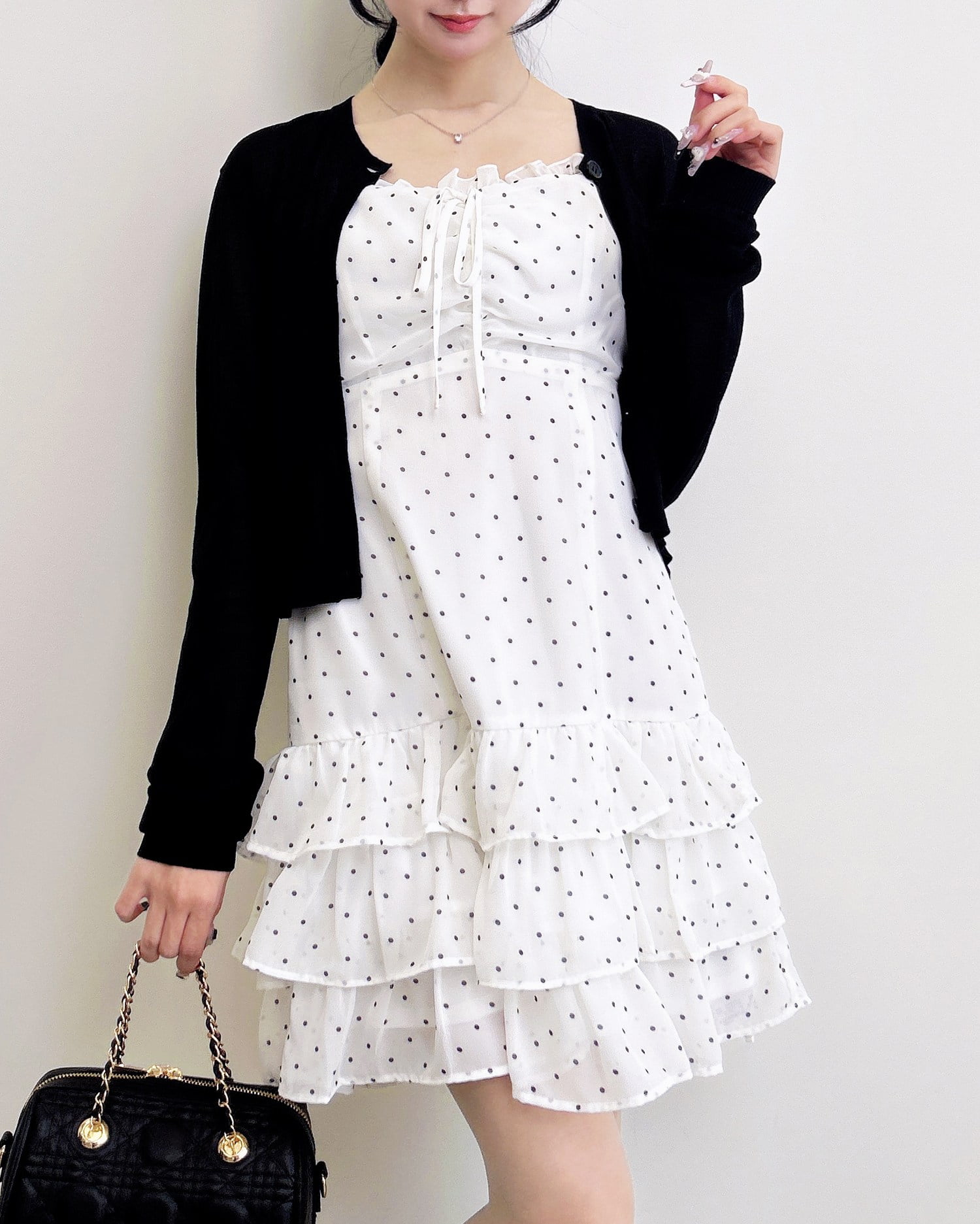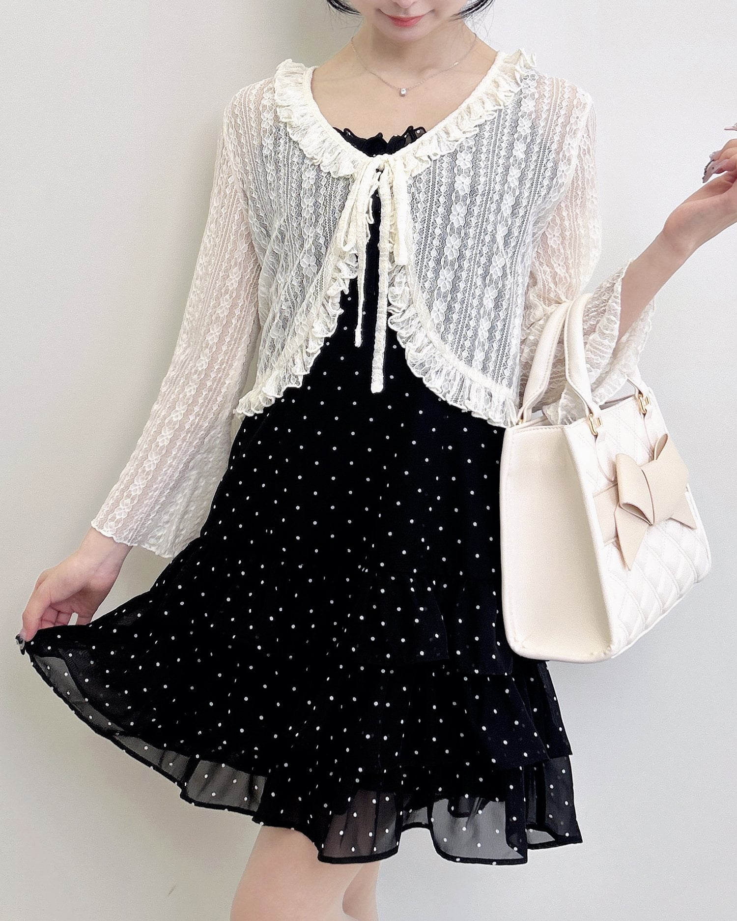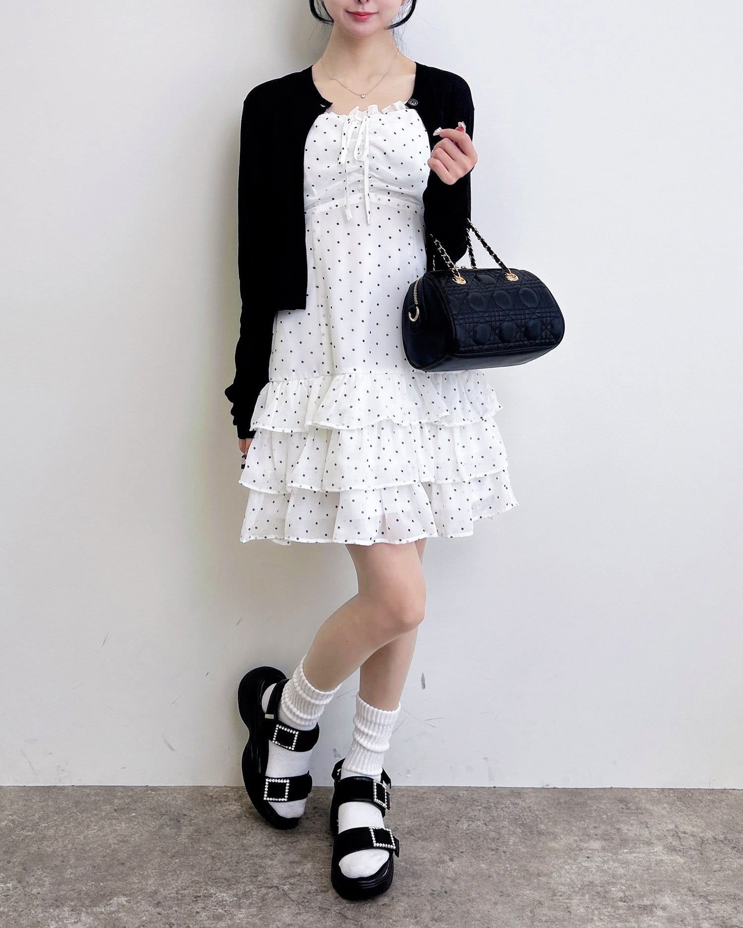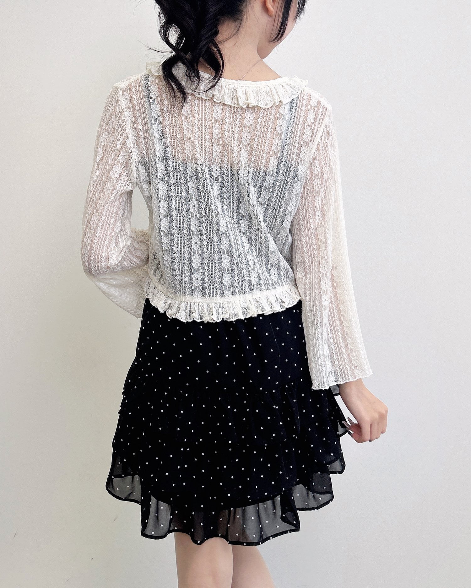動くたびに揺れるティアードシルエットが甘めな雰囲気を引き立てます。
