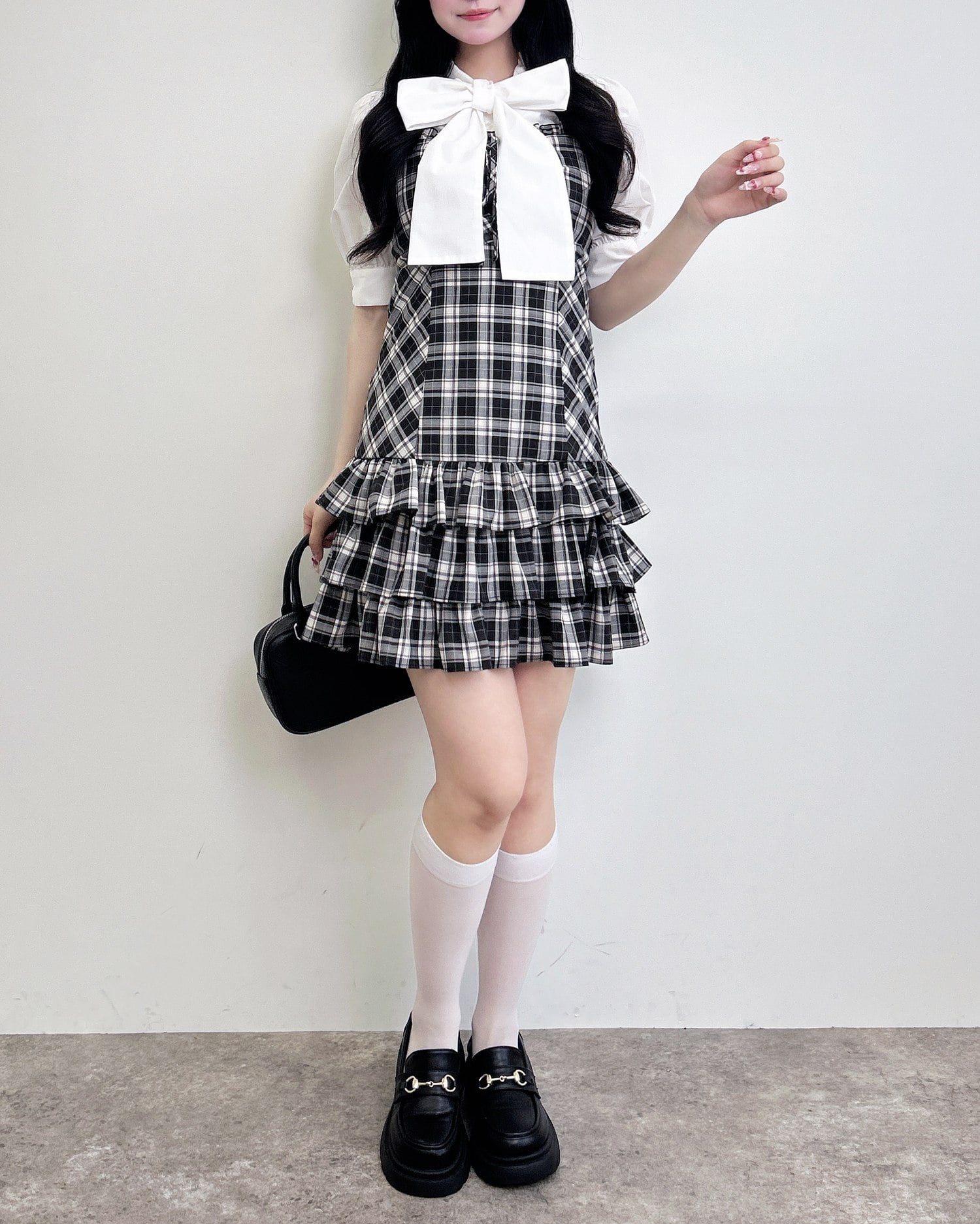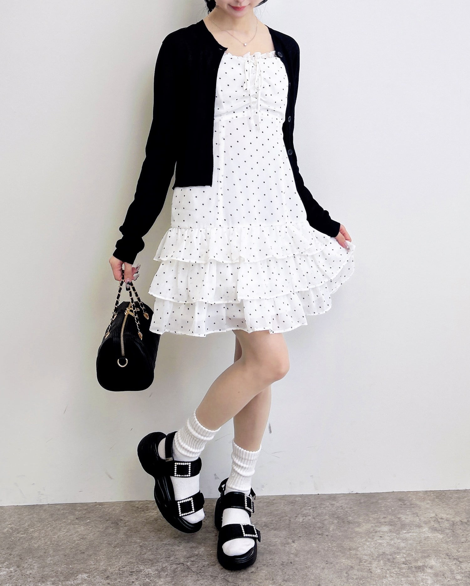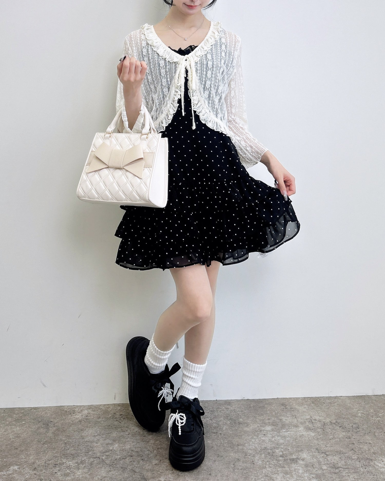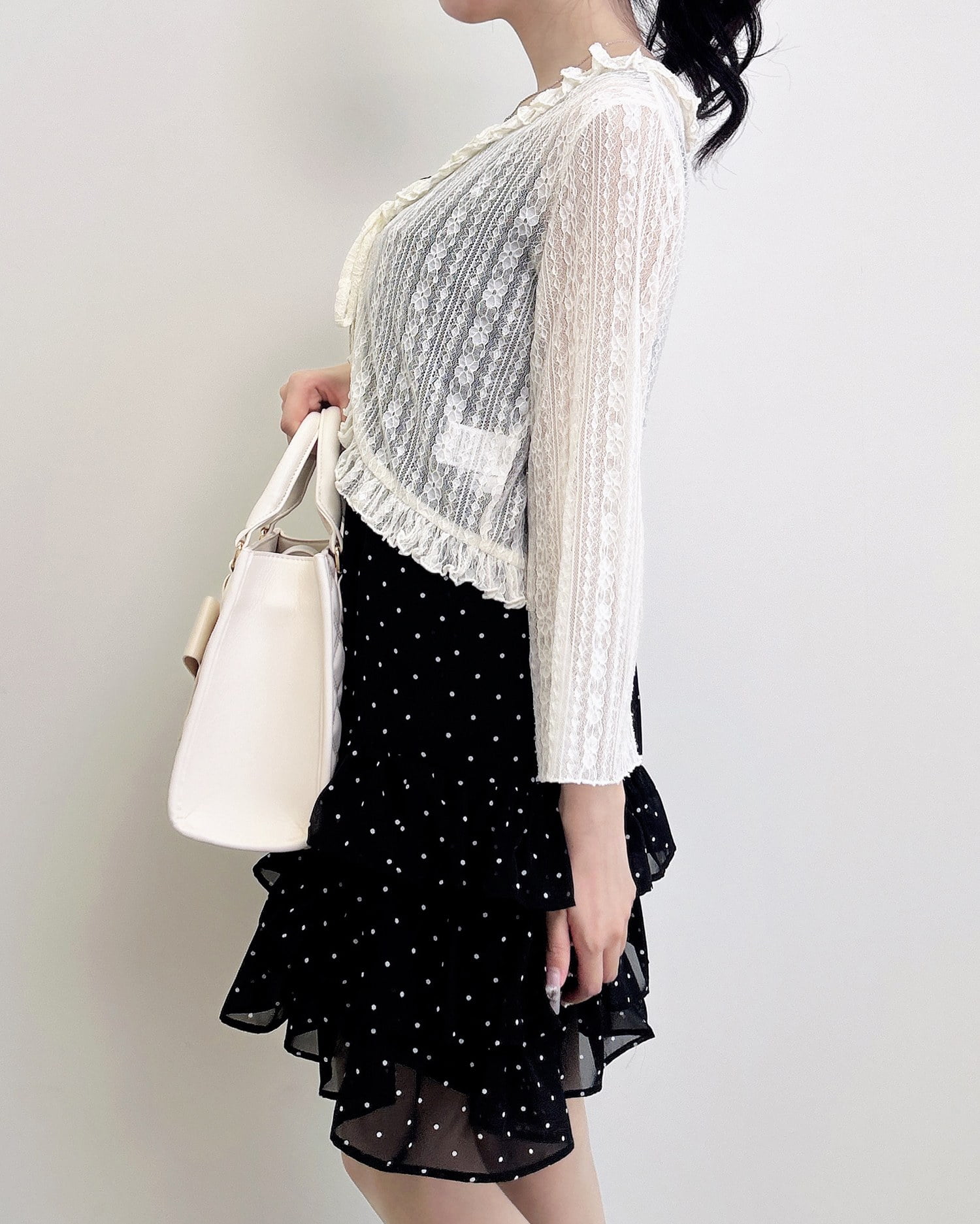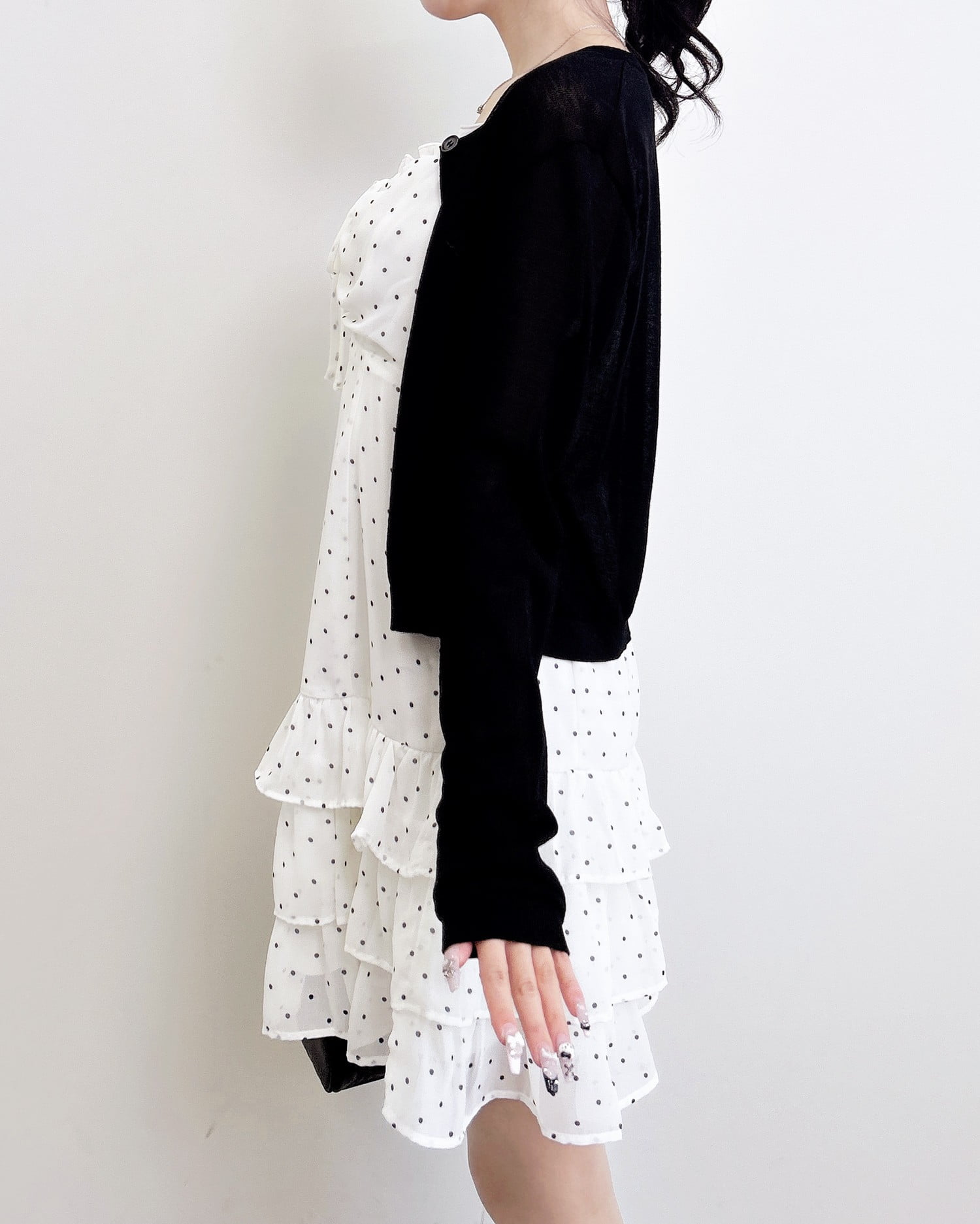 動くたびに揺れるティアードシルエットが甘めな雰囲気を引き立てます。