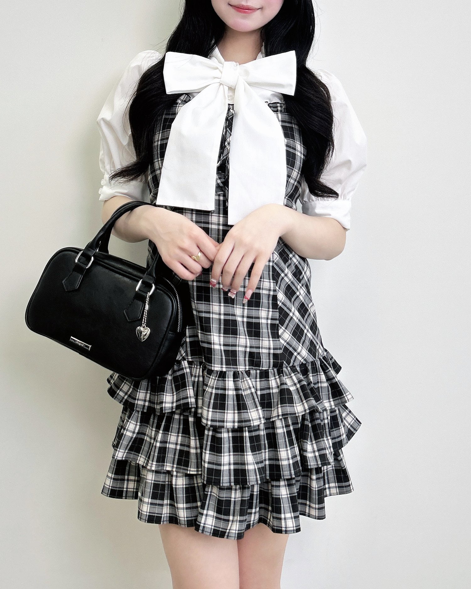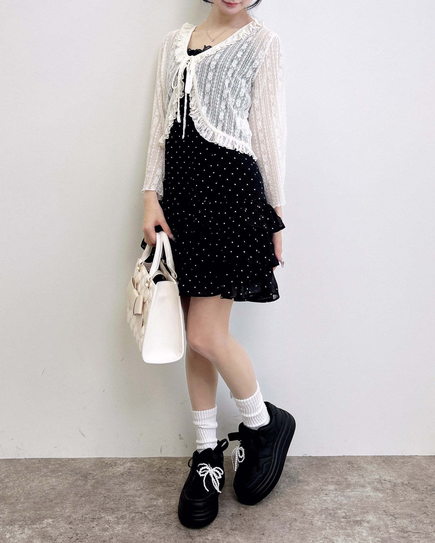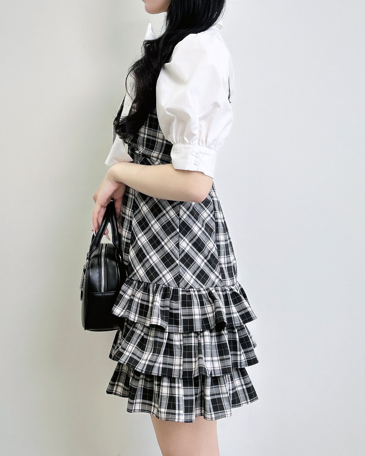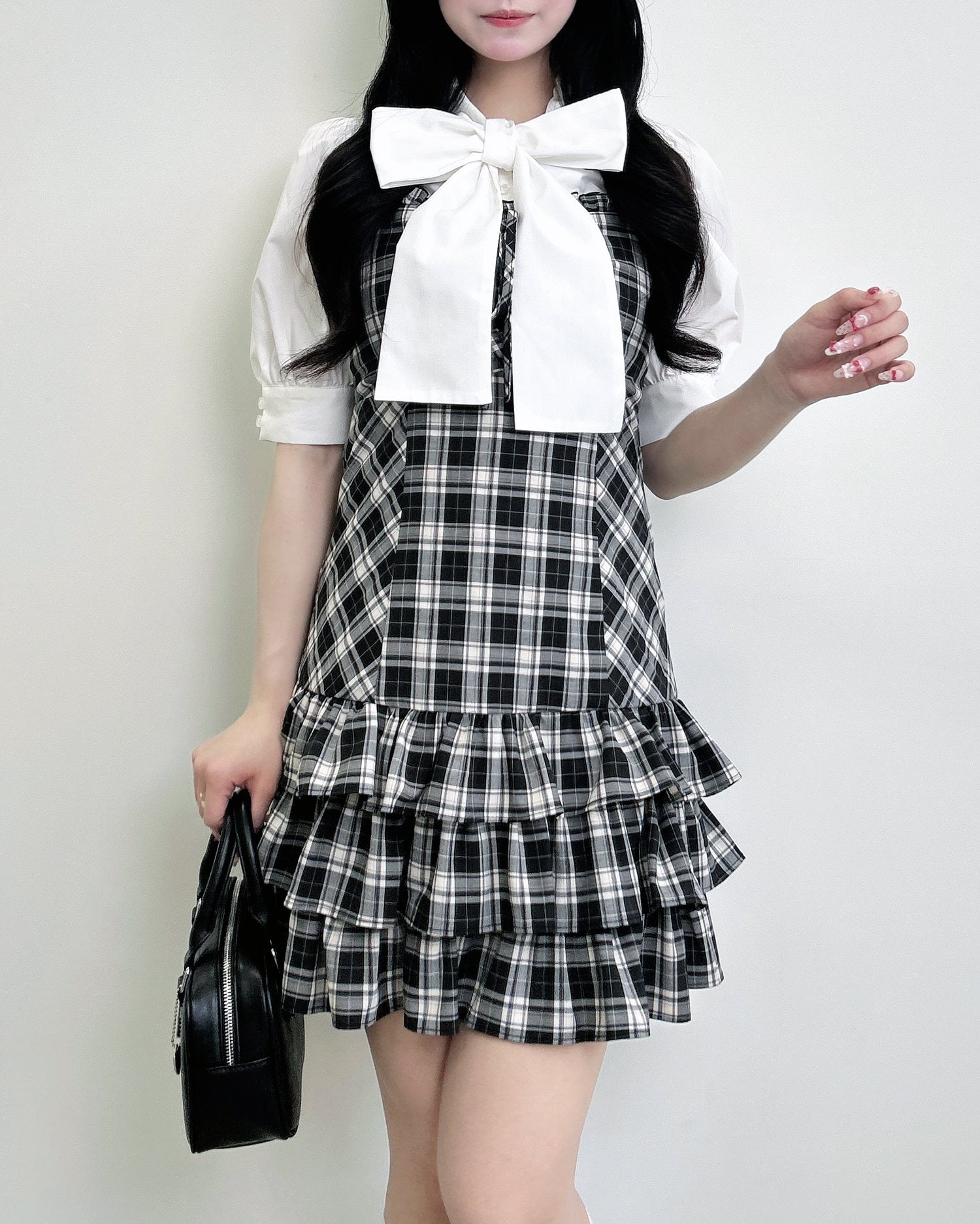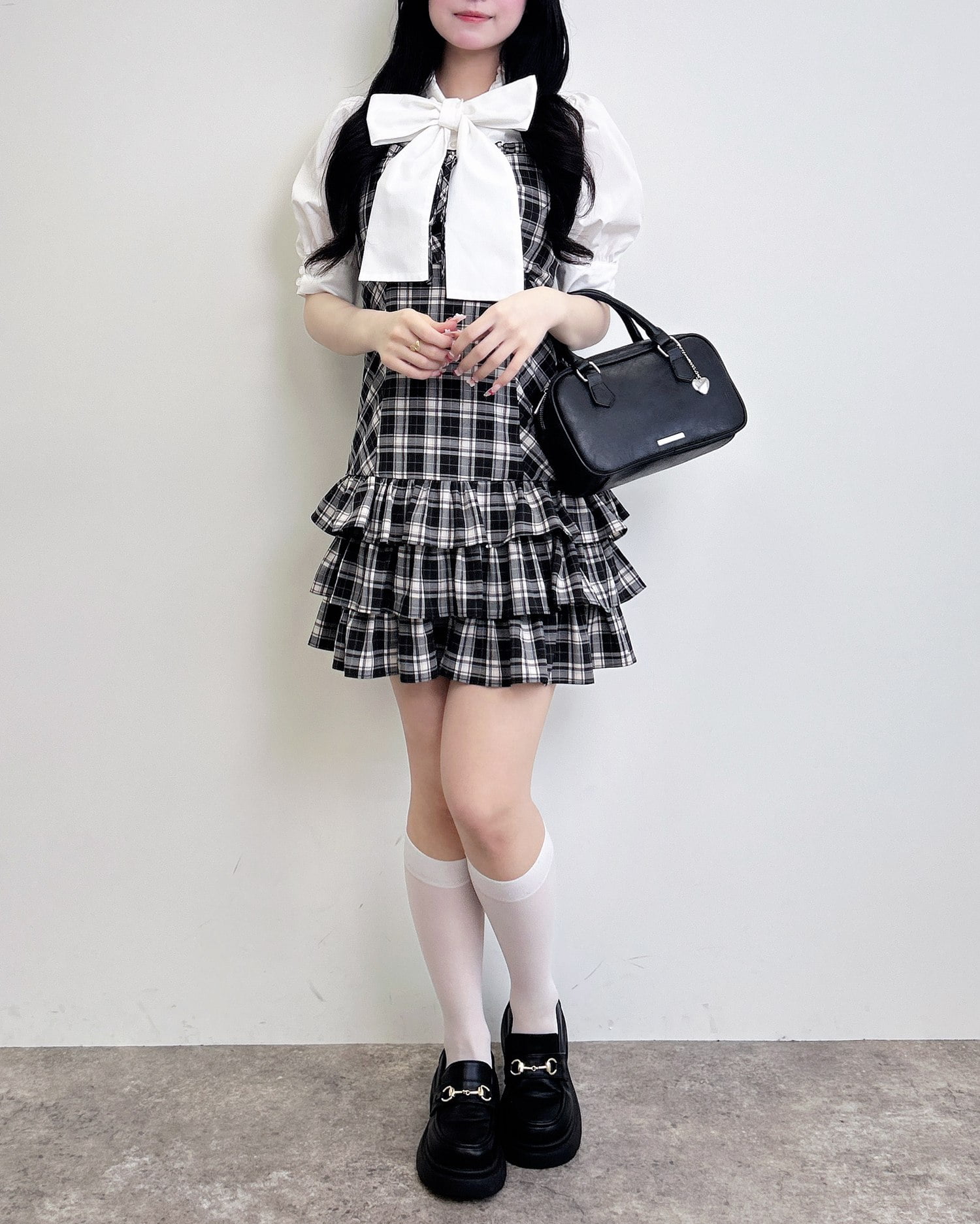 動くたびに揺れるティアードシルエットが甘めな雰囲気を引き立てます。
