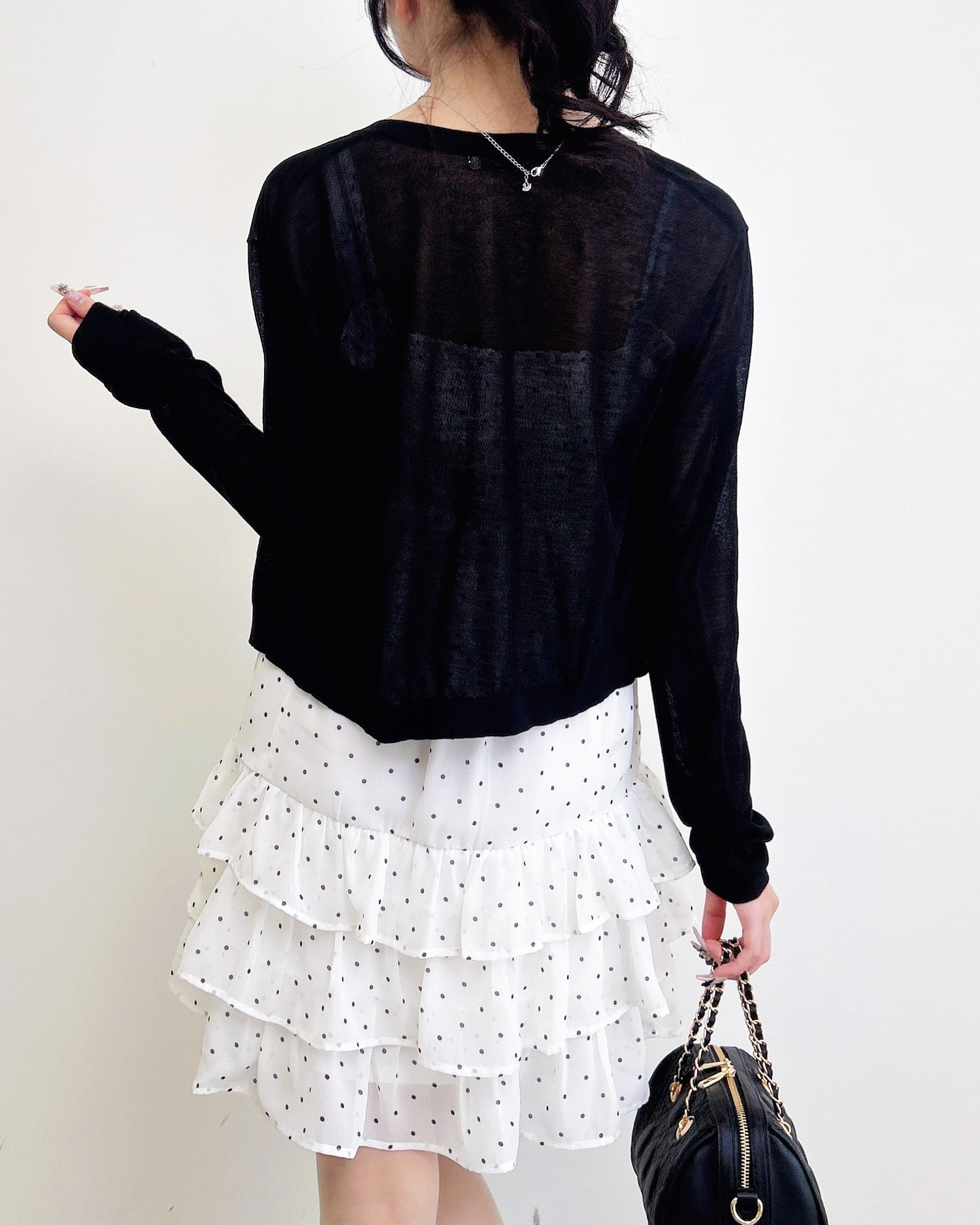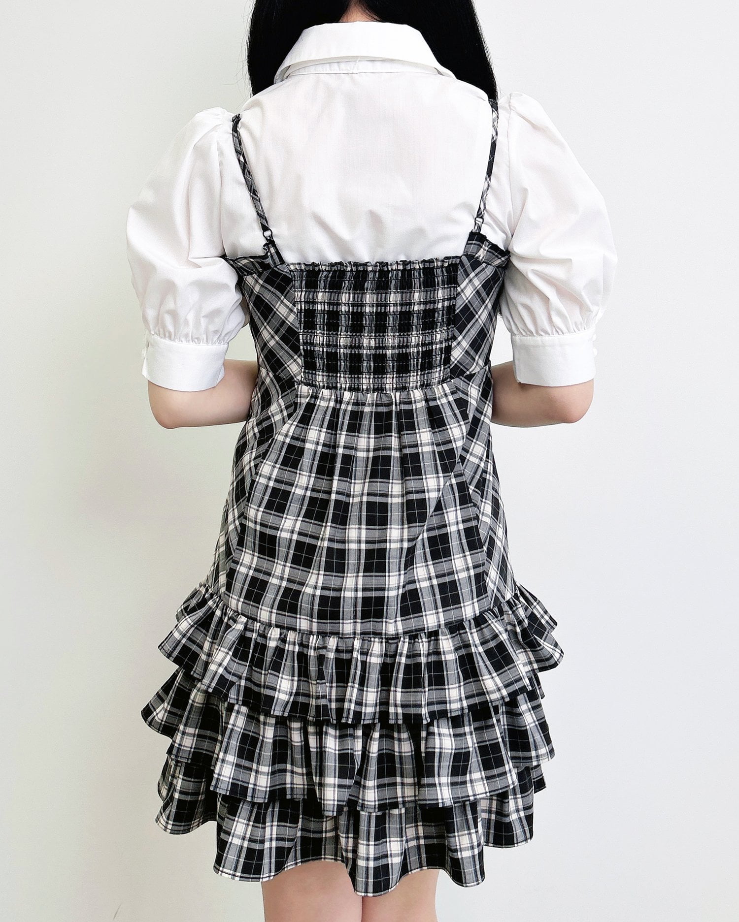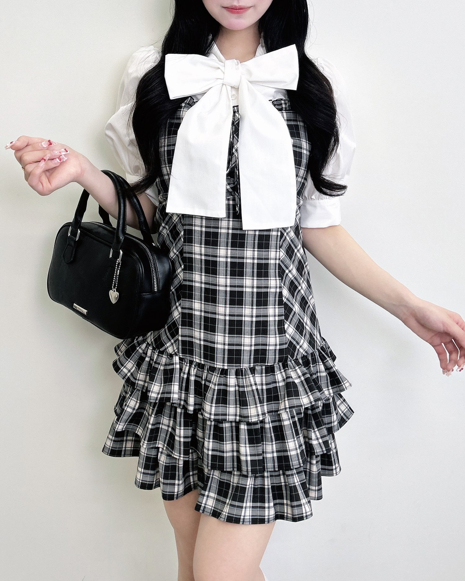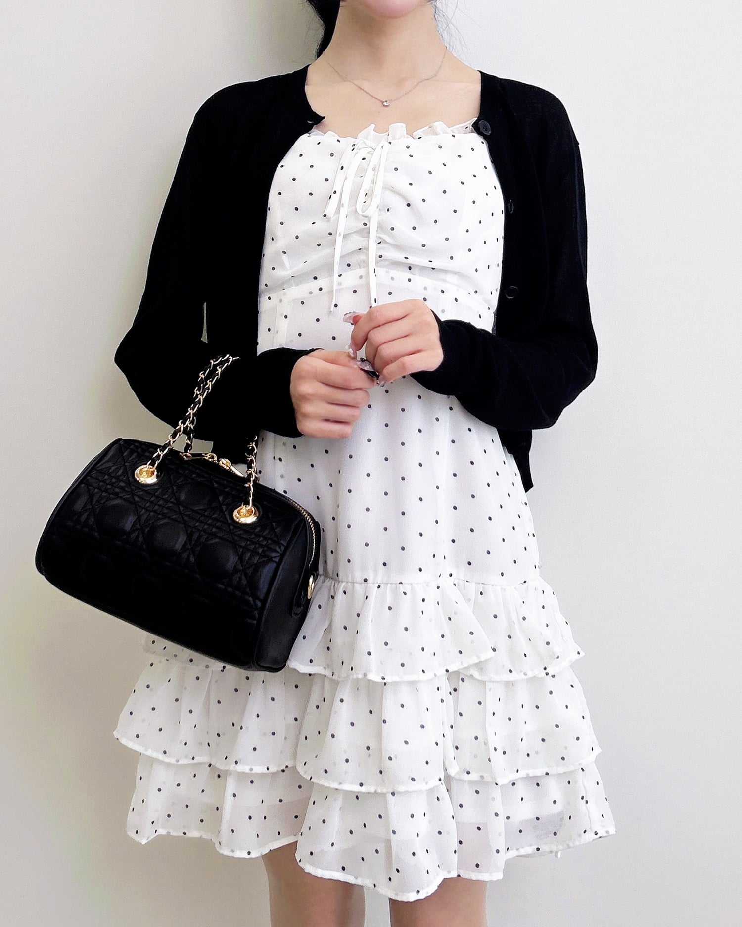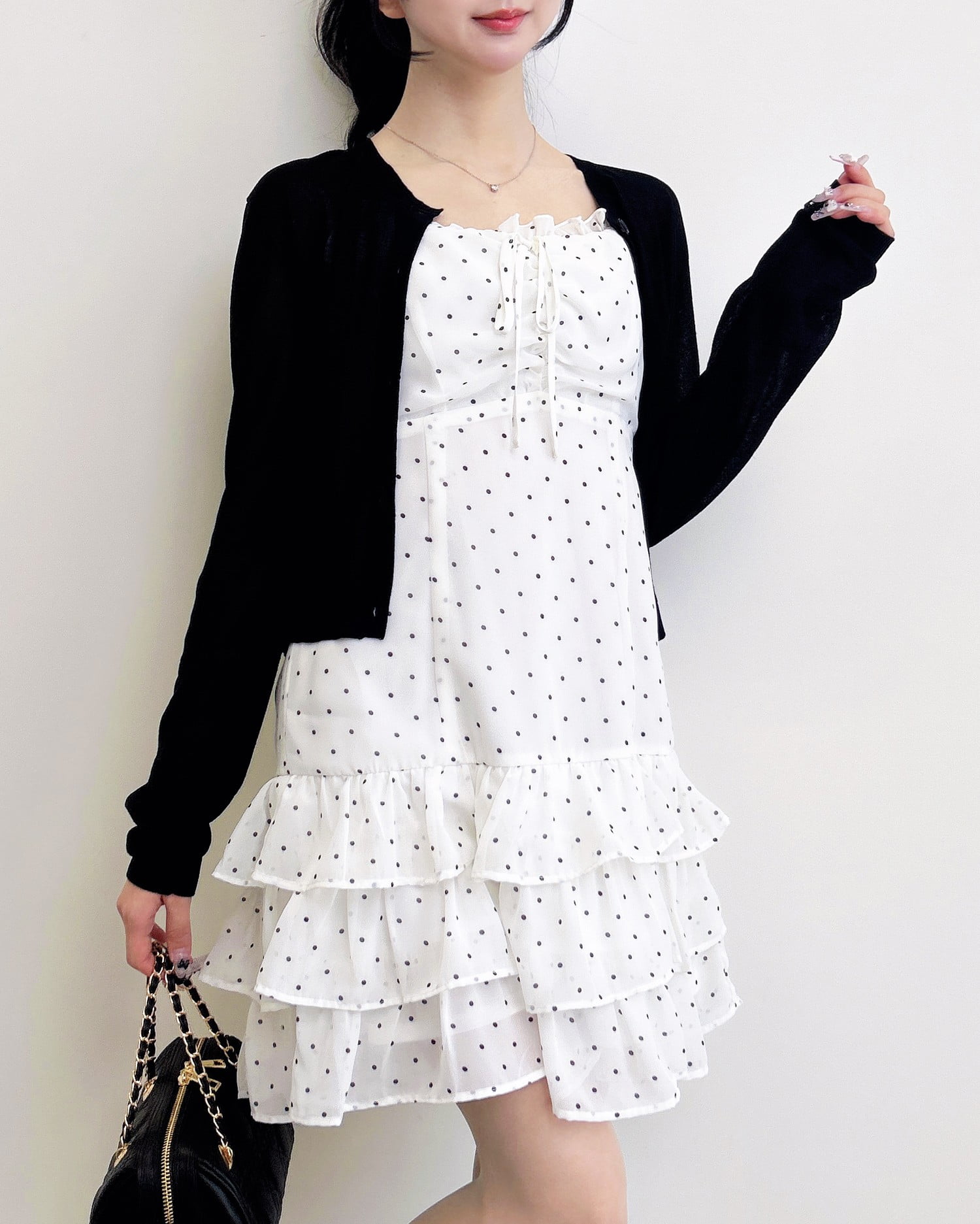 動くたびに揺れるティアードシルエットが甘めな雰囲気を引き立てます。