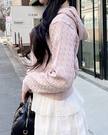 トレンドのケーブル編みがシンプルながらもおしゃれな印象を与えます。