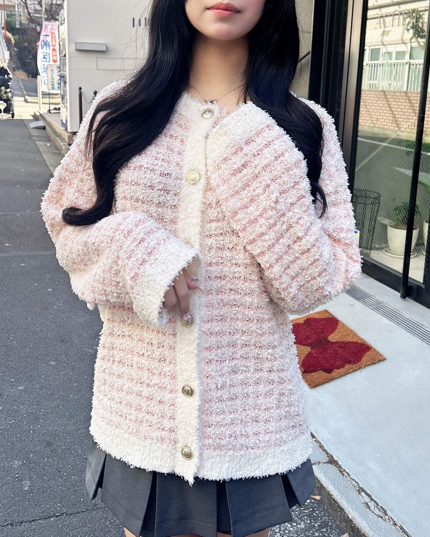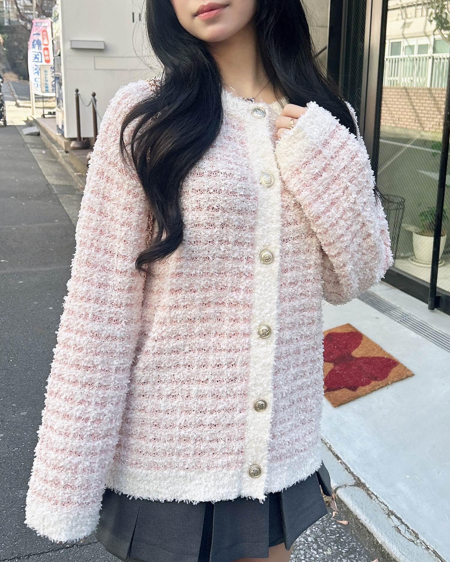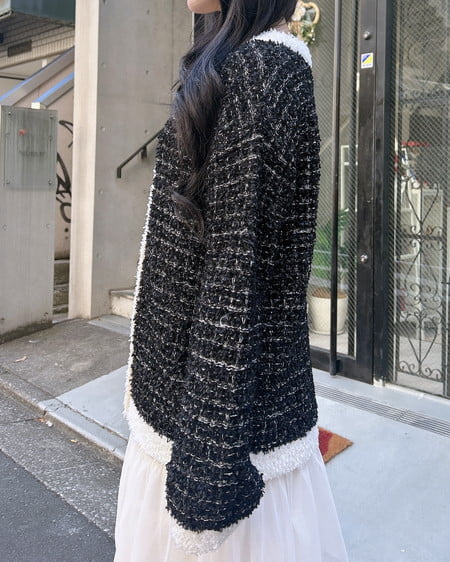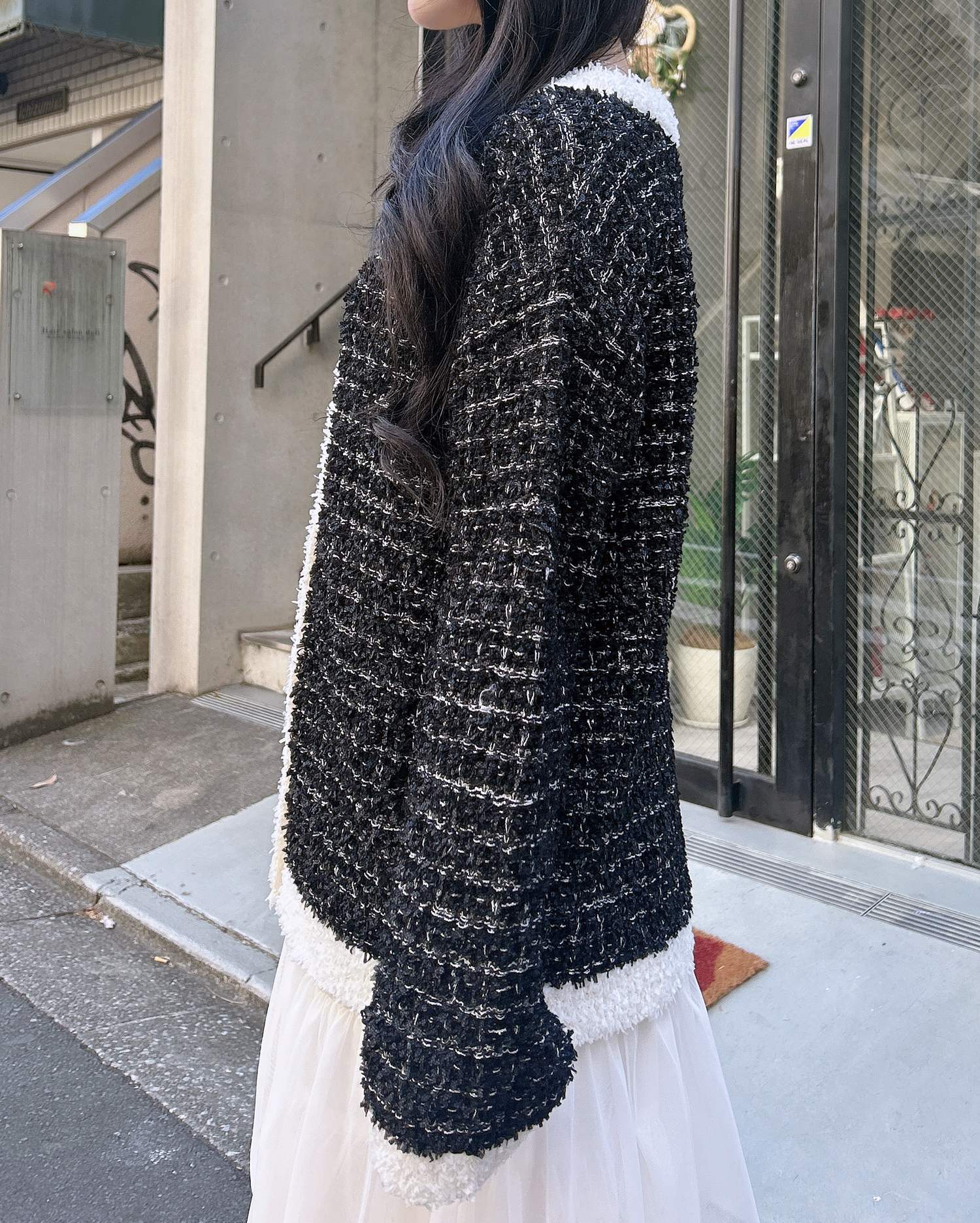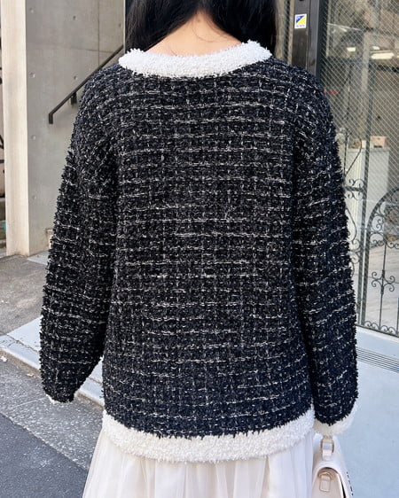 ラメ糸をミックスしてツイード調に仕上げた華やかな印象のカーディガンです。