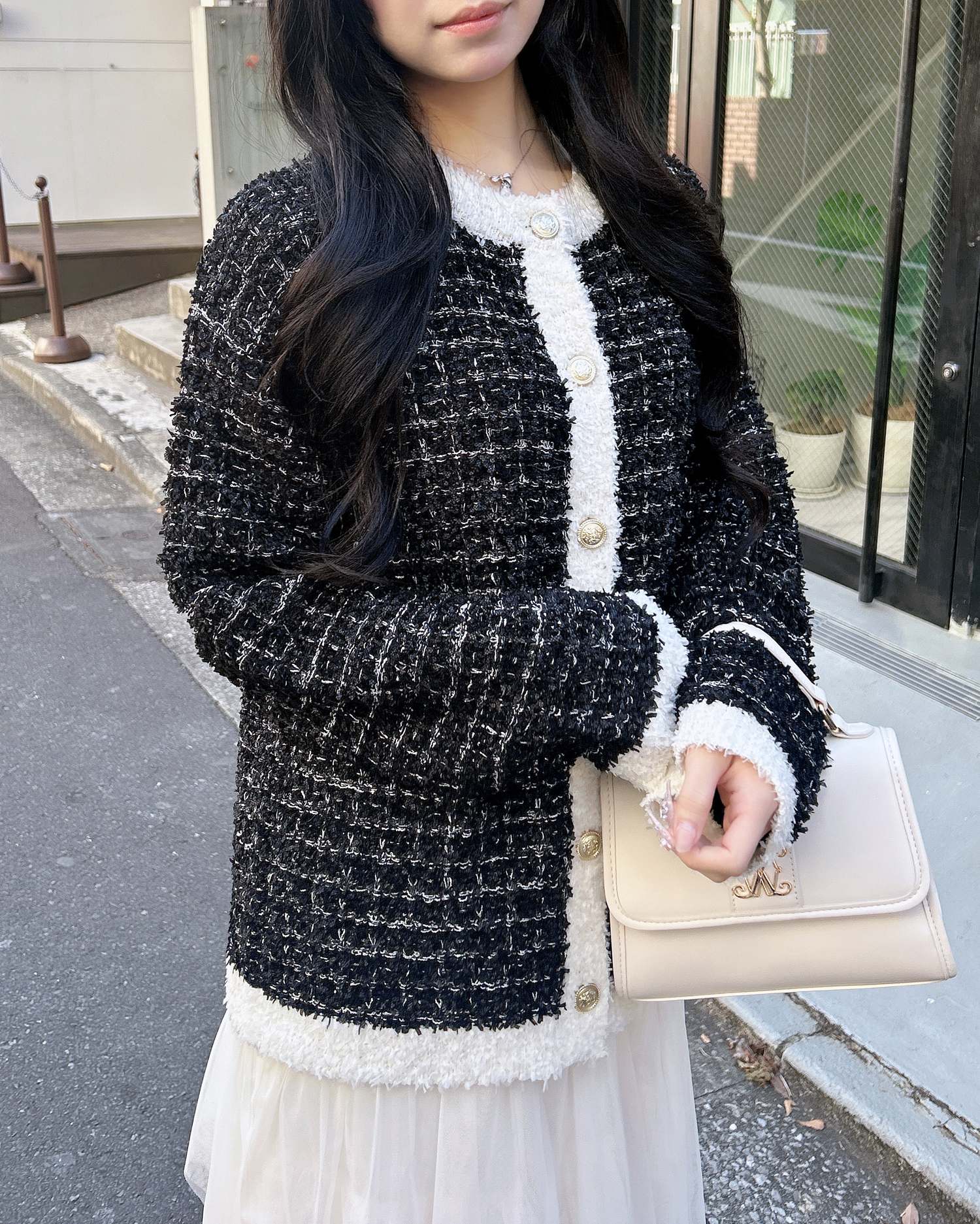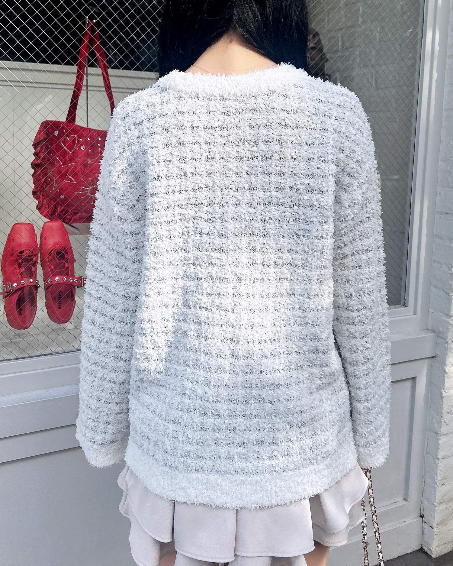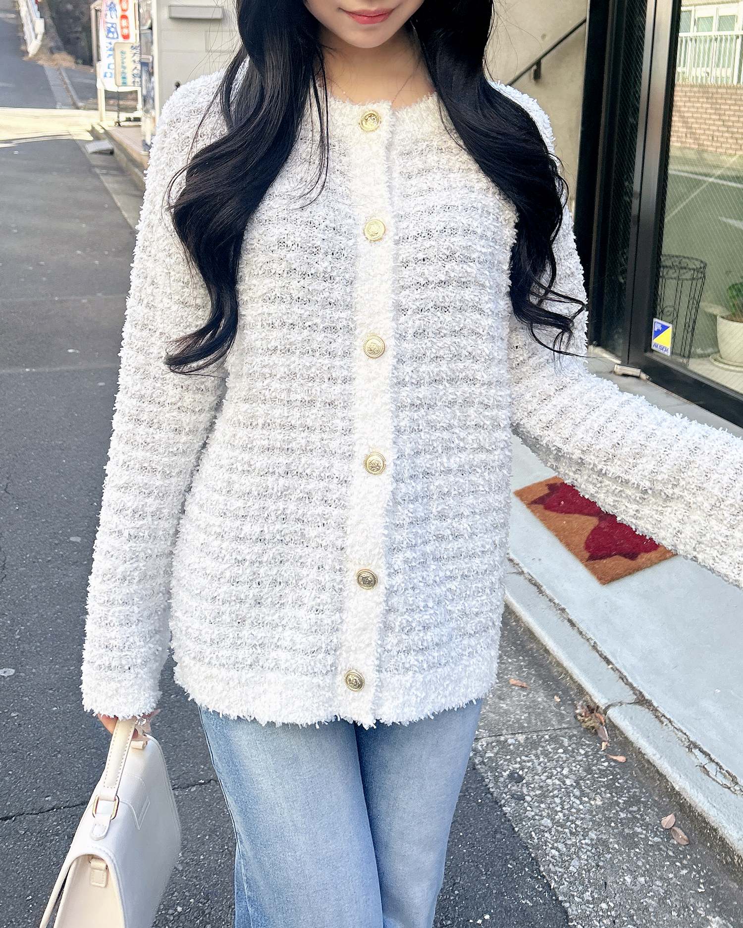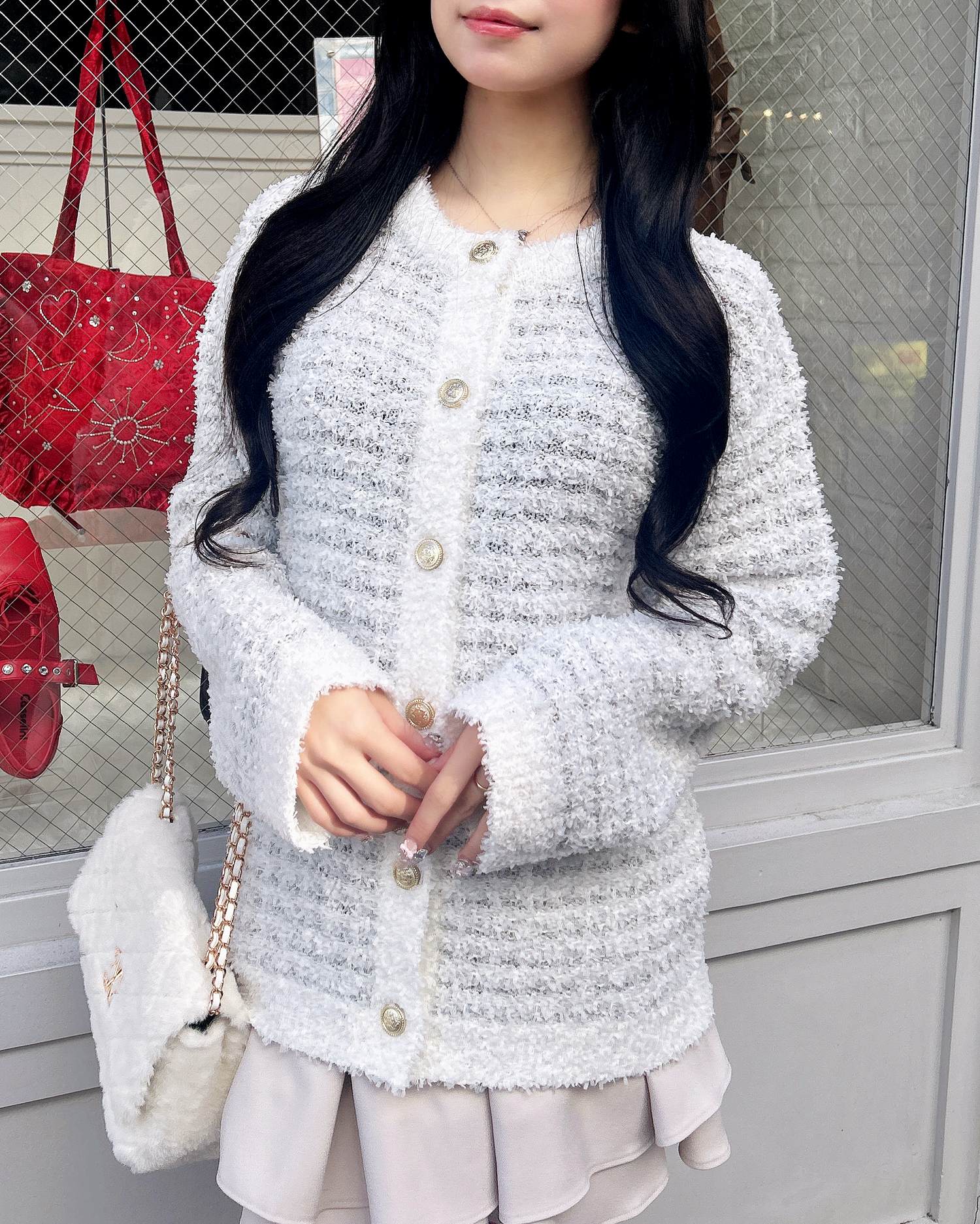 ラメ糸をミックスしてツイード調に仕上げた華やかな印象のカーディガンです。
