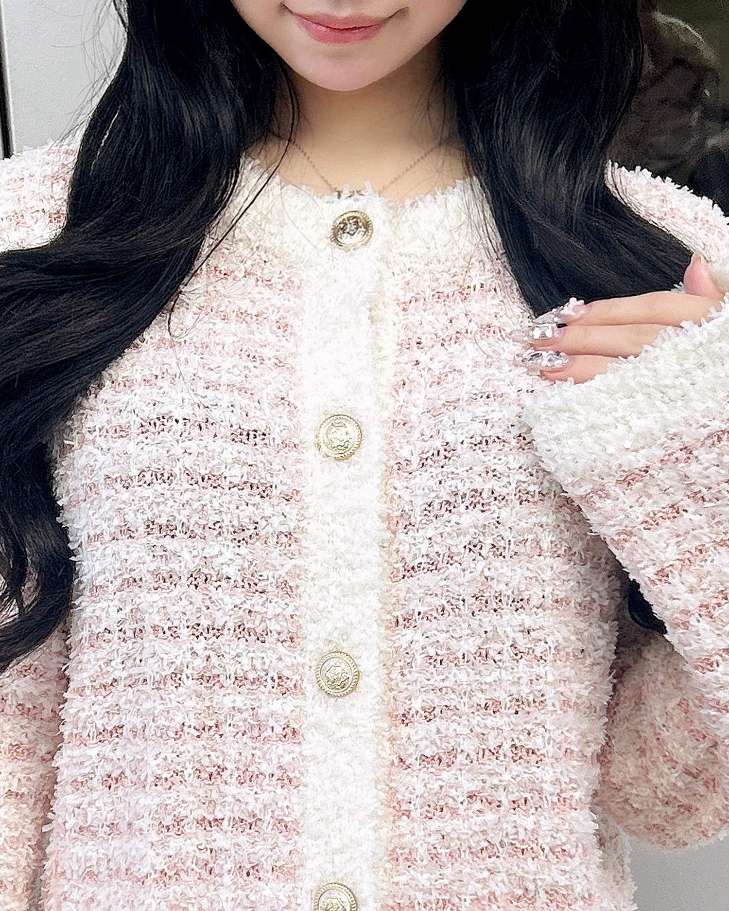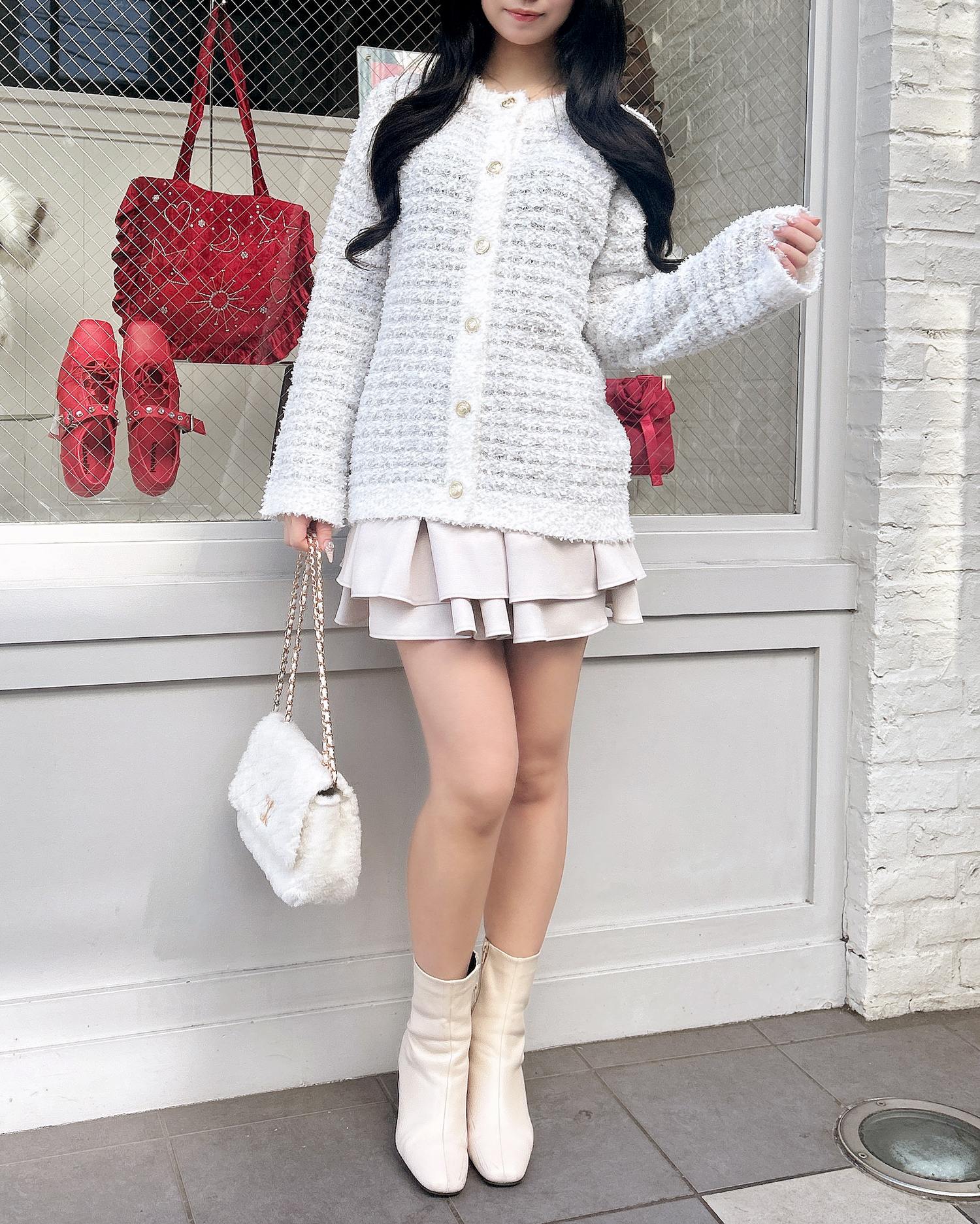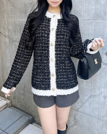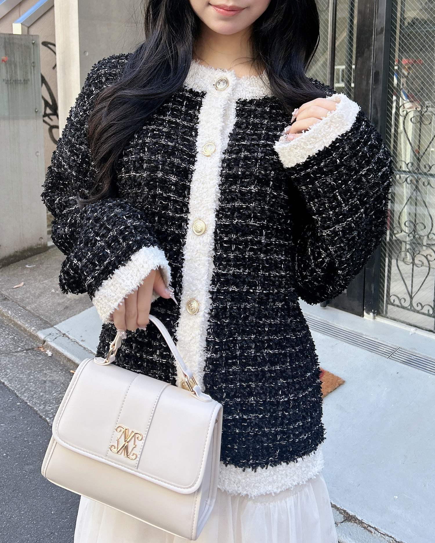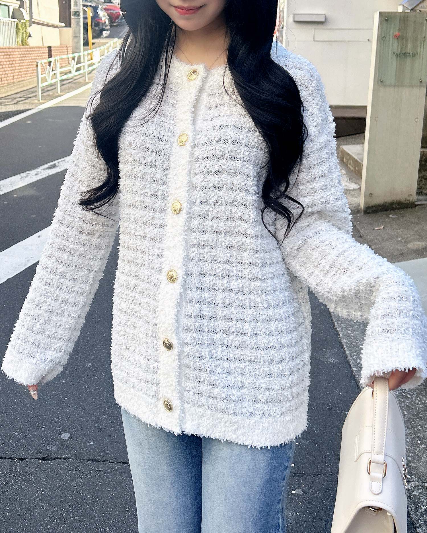 ラメ糸をミックスしてツイード調に仕上げた華やかな印象のカーディガンです。