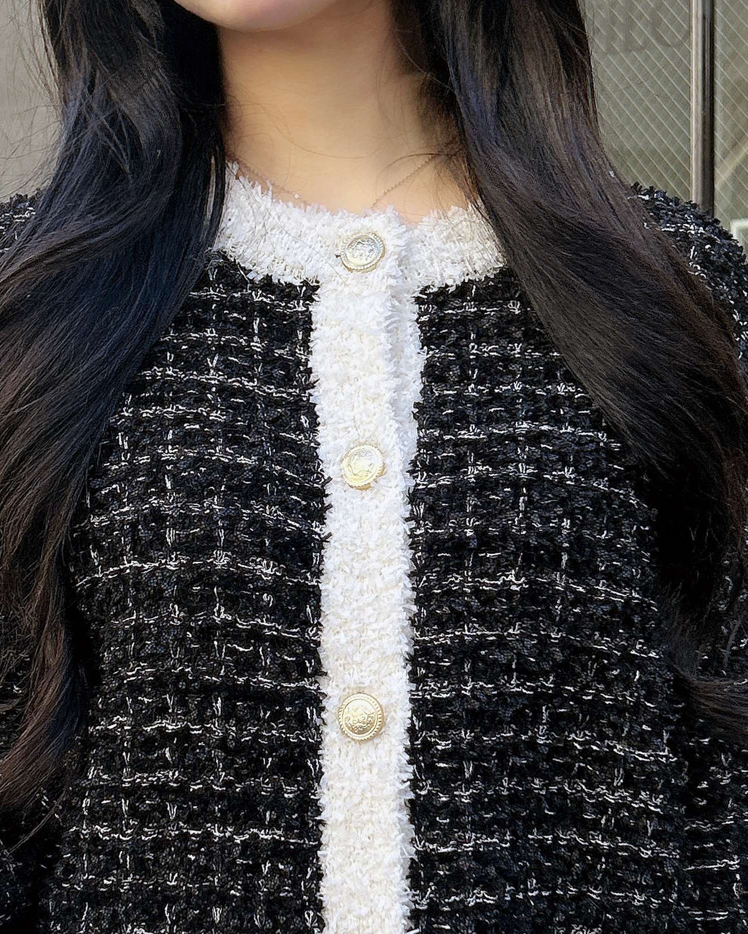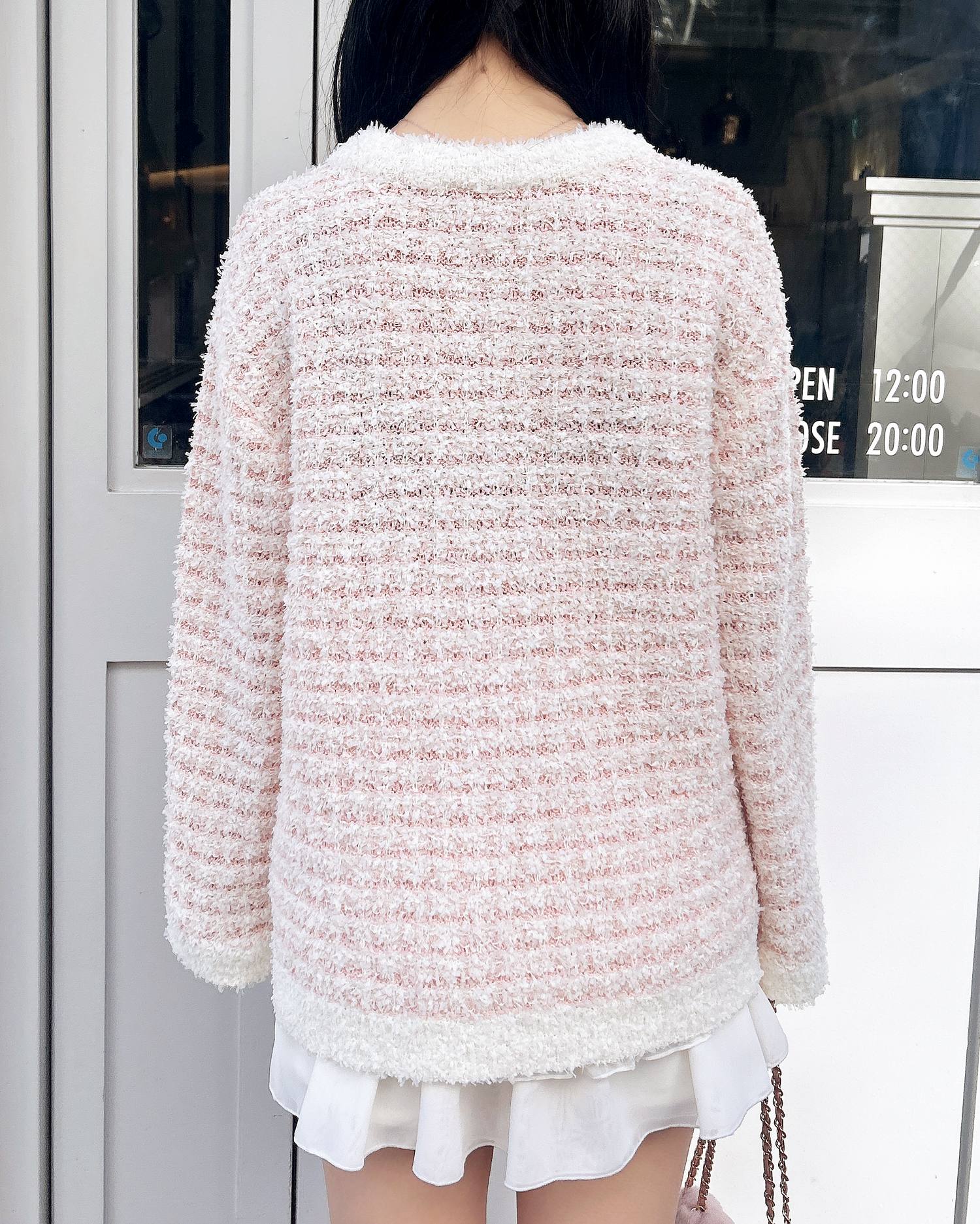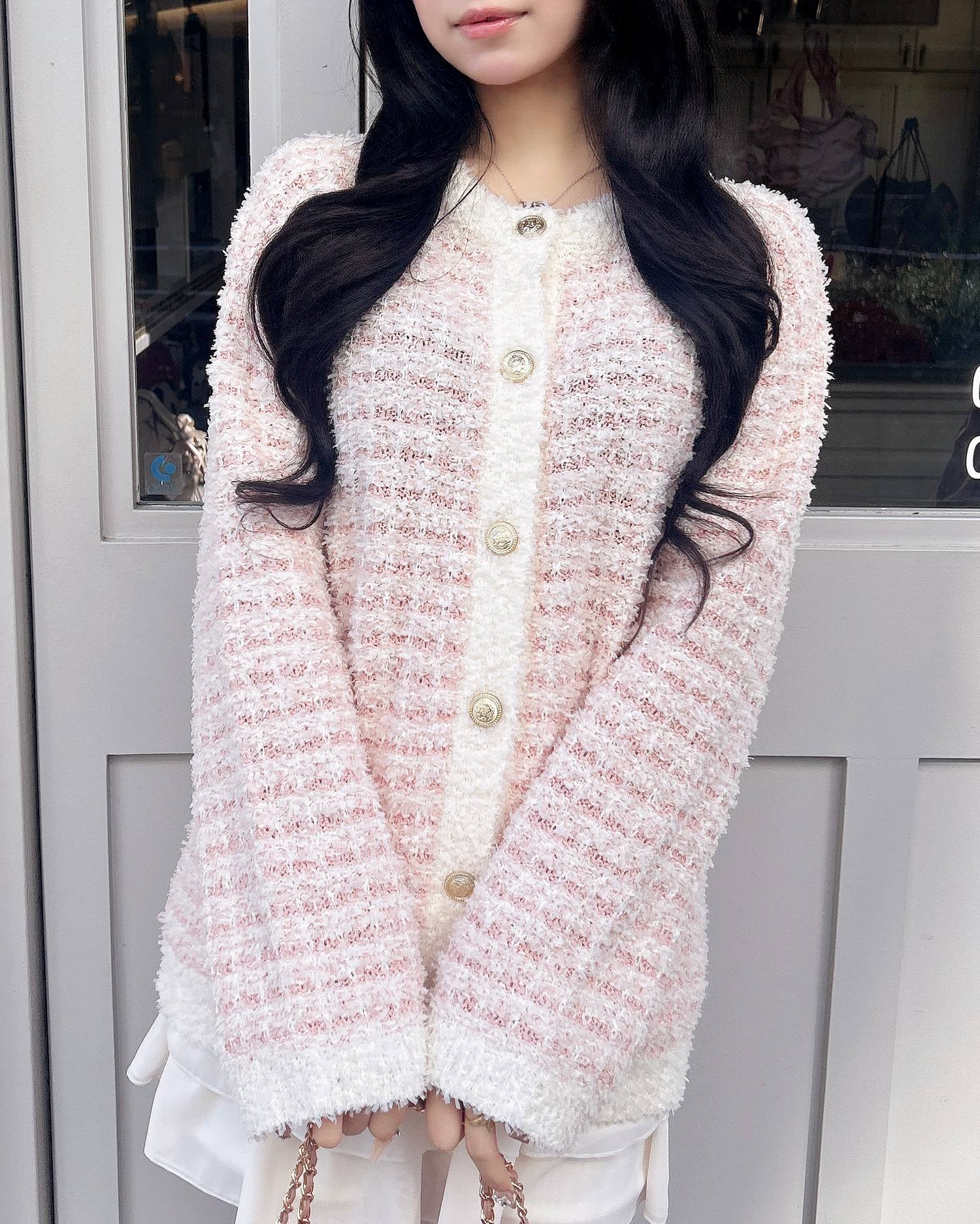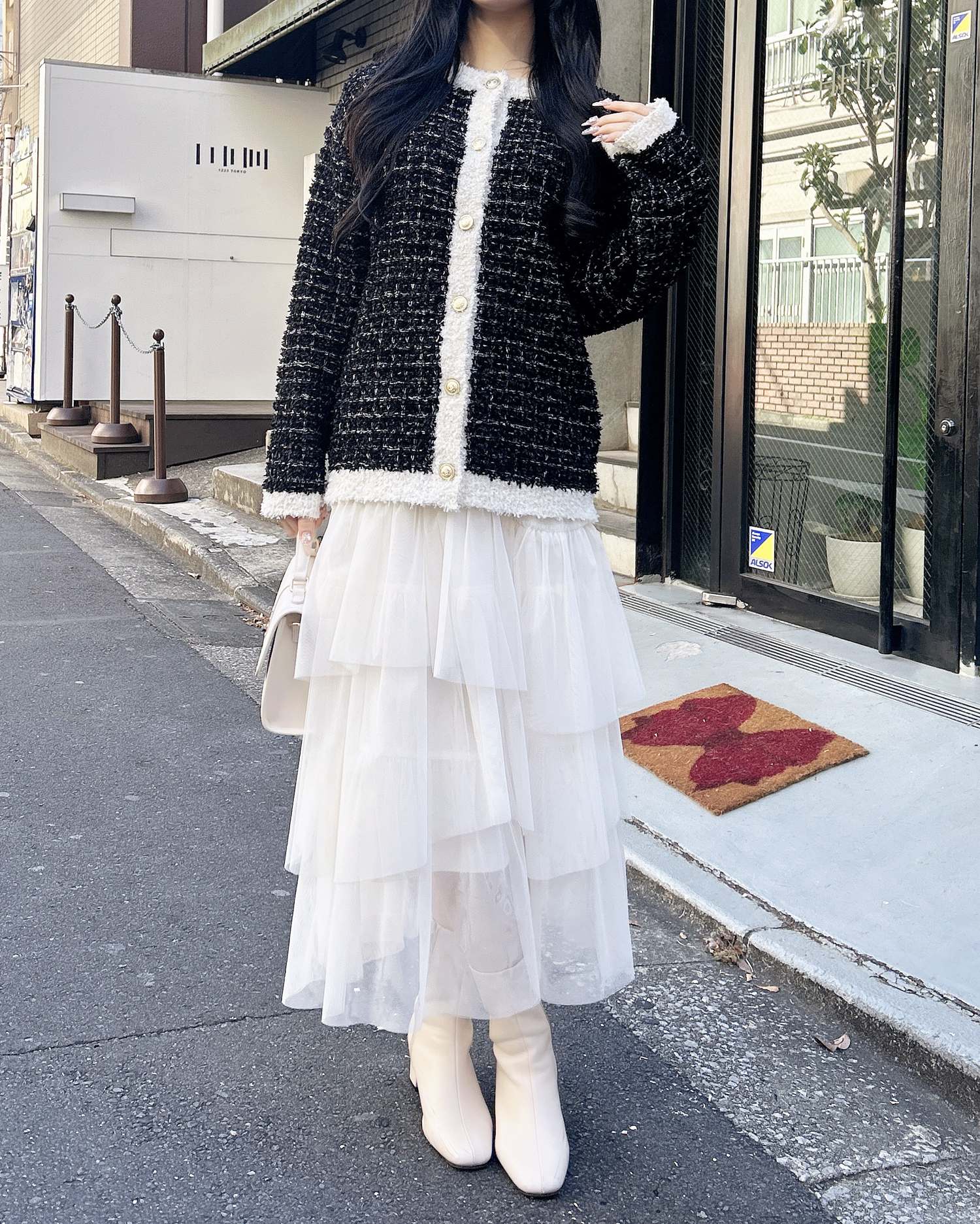 ラメ糸をミックスしてツイード調に仕上げた華やかな印象のカーディガンです。