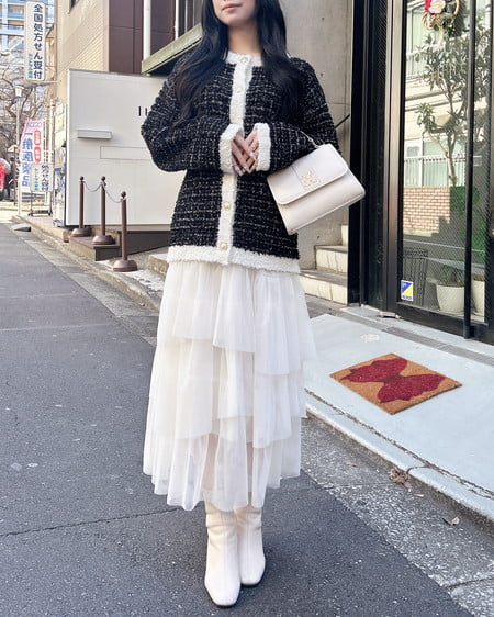 ミニ丈のボトムスを合わせるとバランスの良いコーディネートに仕上がります。