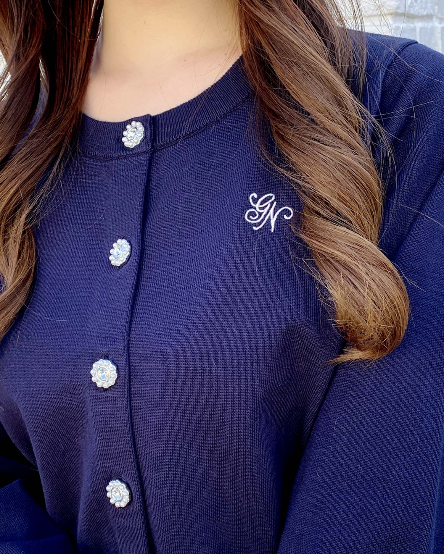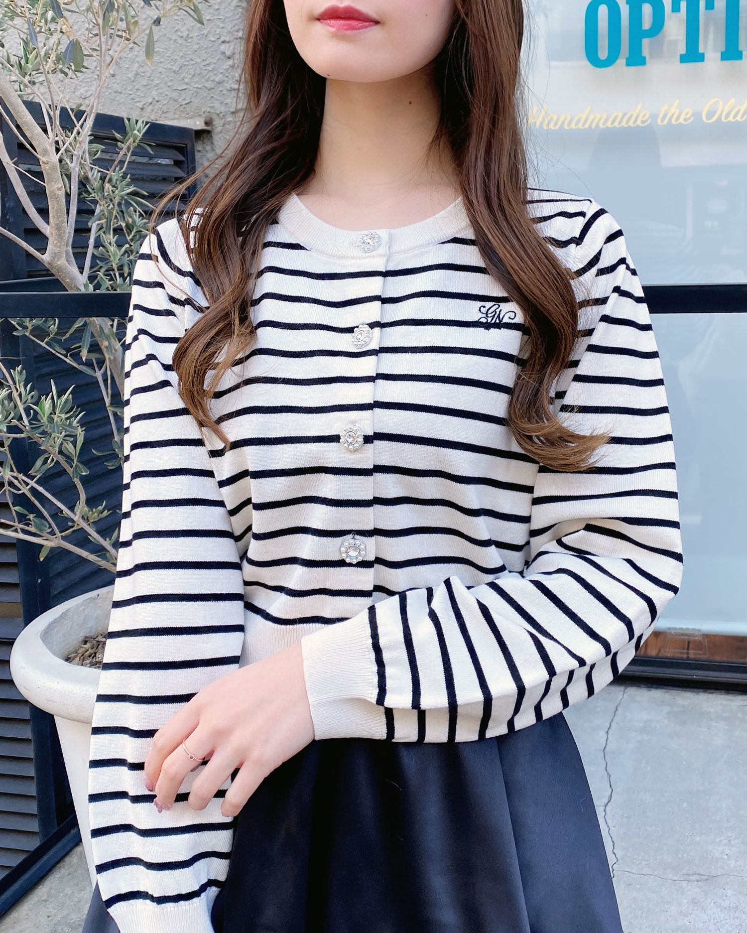 シンプルなニットにキラッと光るビジューボタンがアクセントに◎