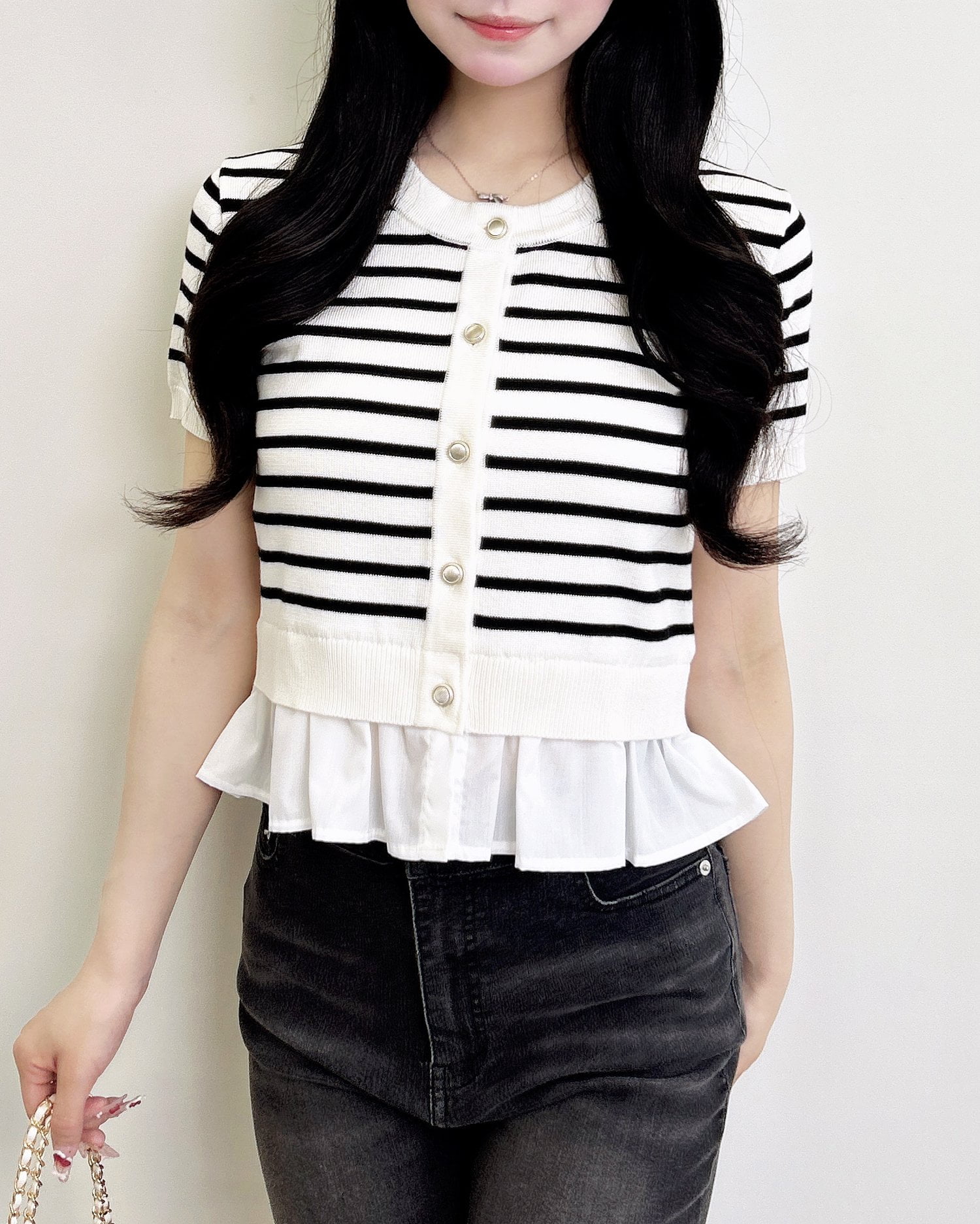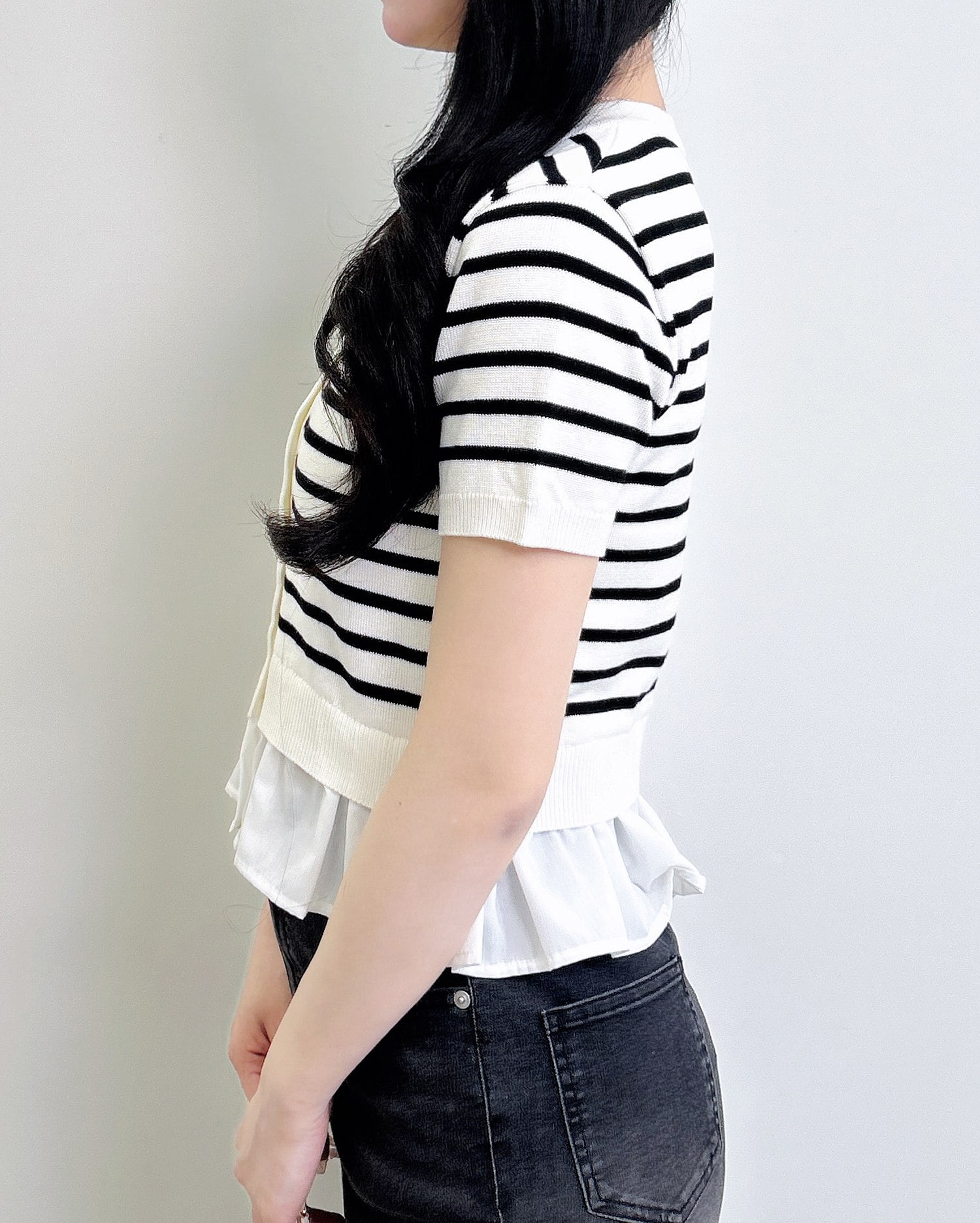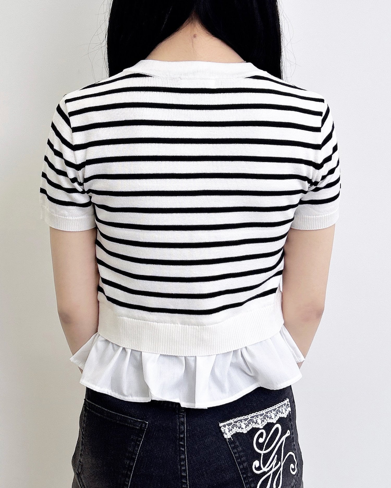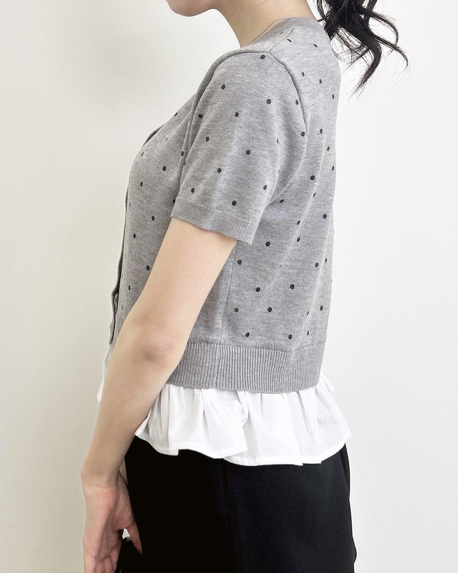 裾のフリルシャツデザインが、コーデに動きと華やかさをプラス。