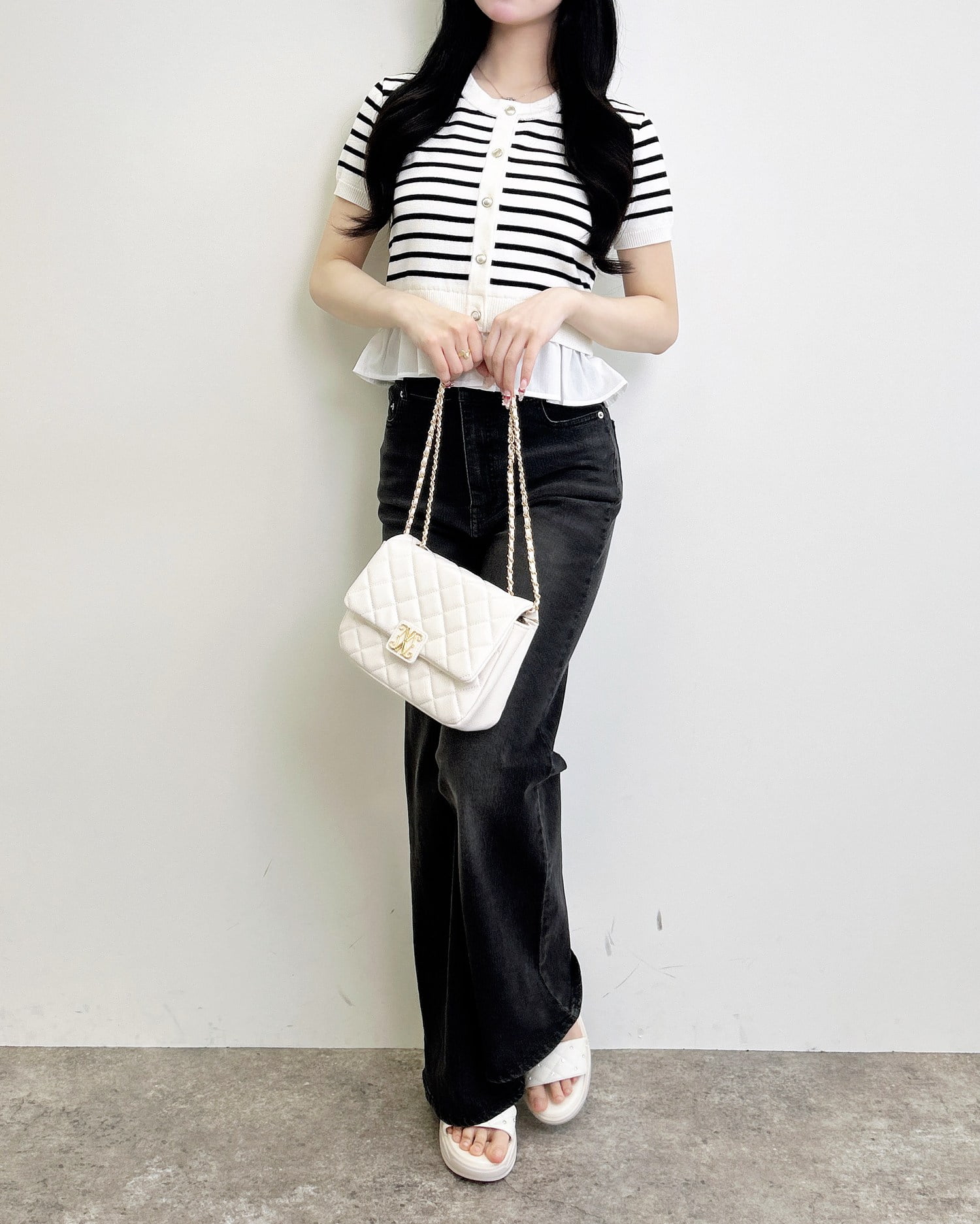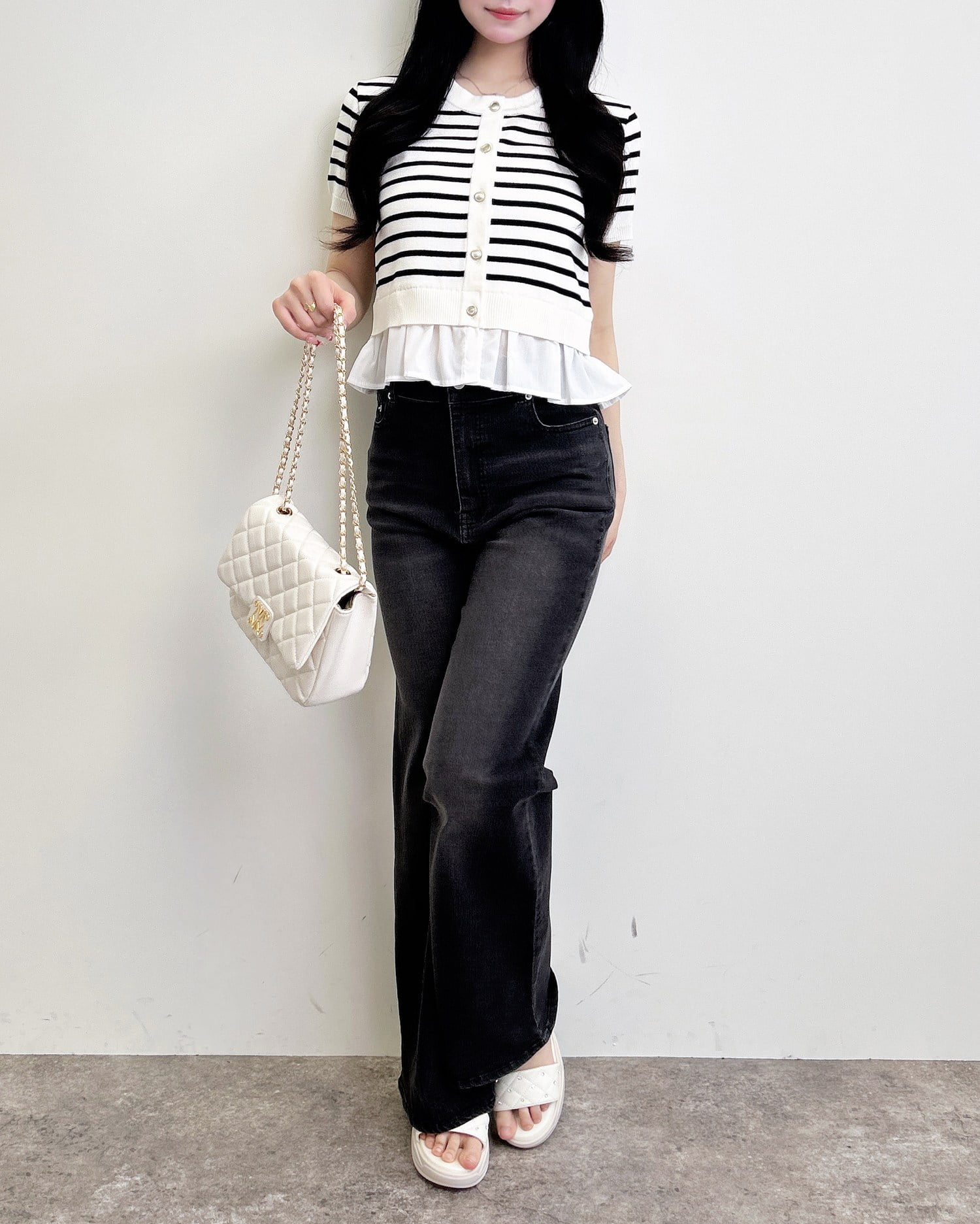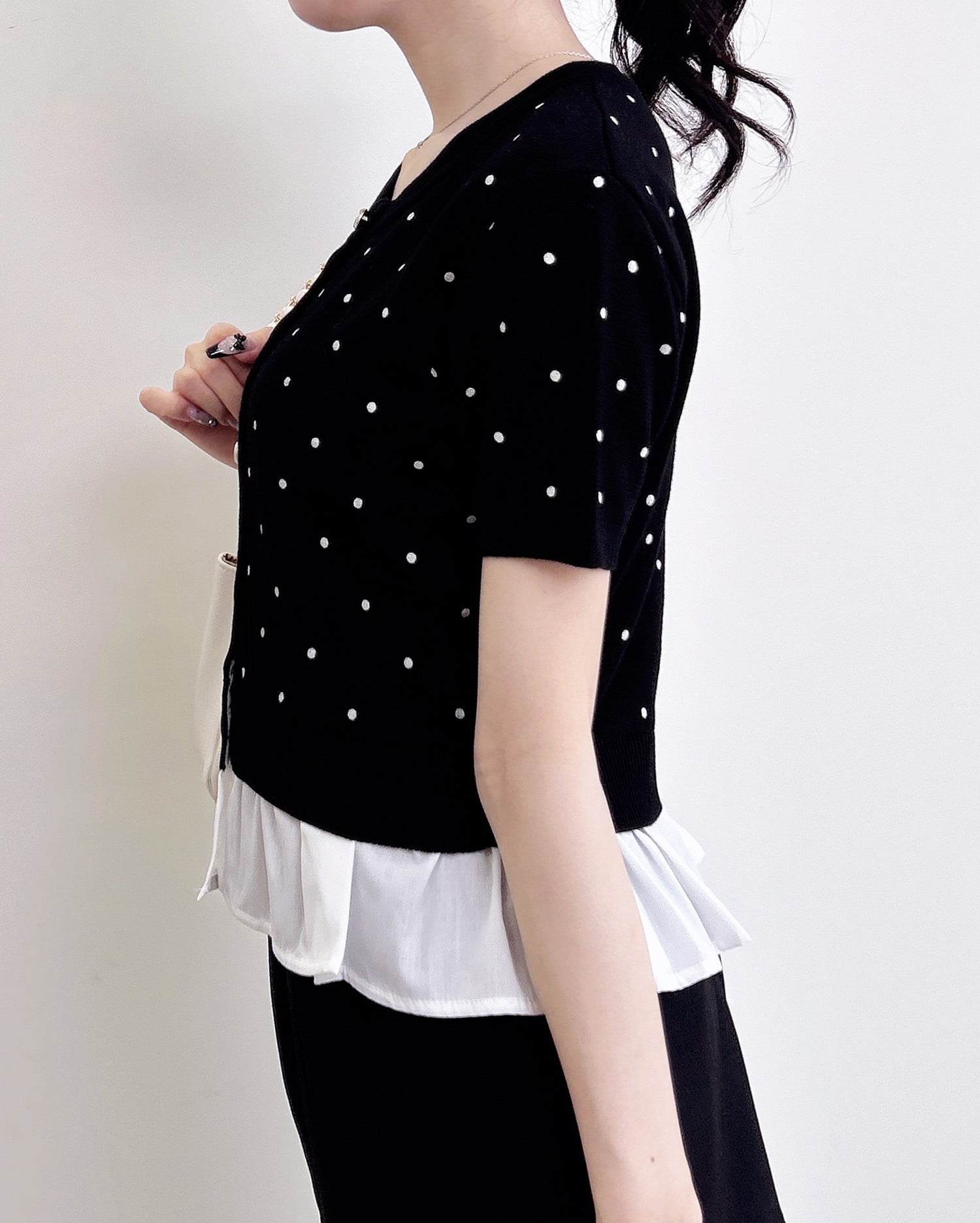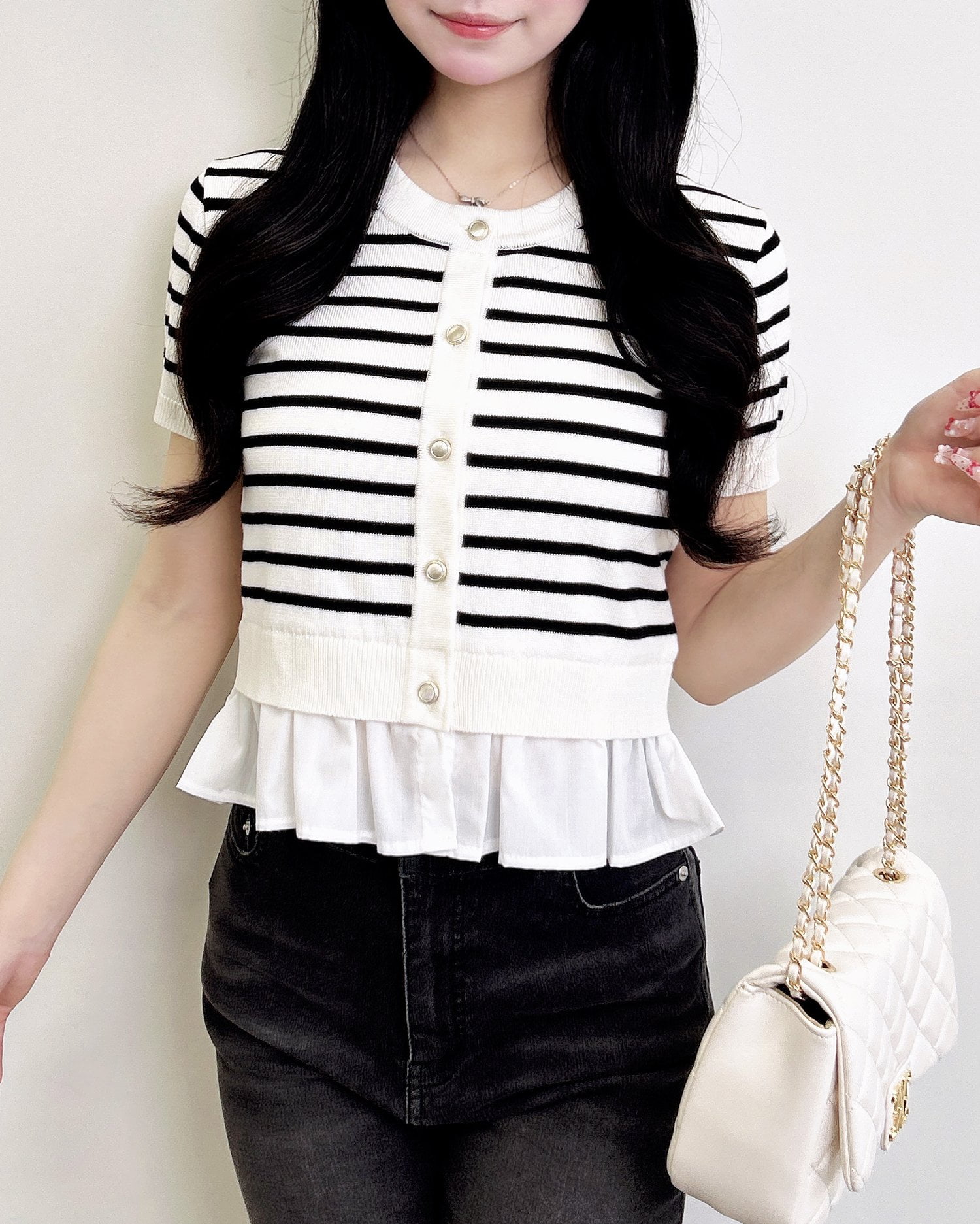 裾のフリルシャツデザインが、コーデに動きと華やかさをプラス。