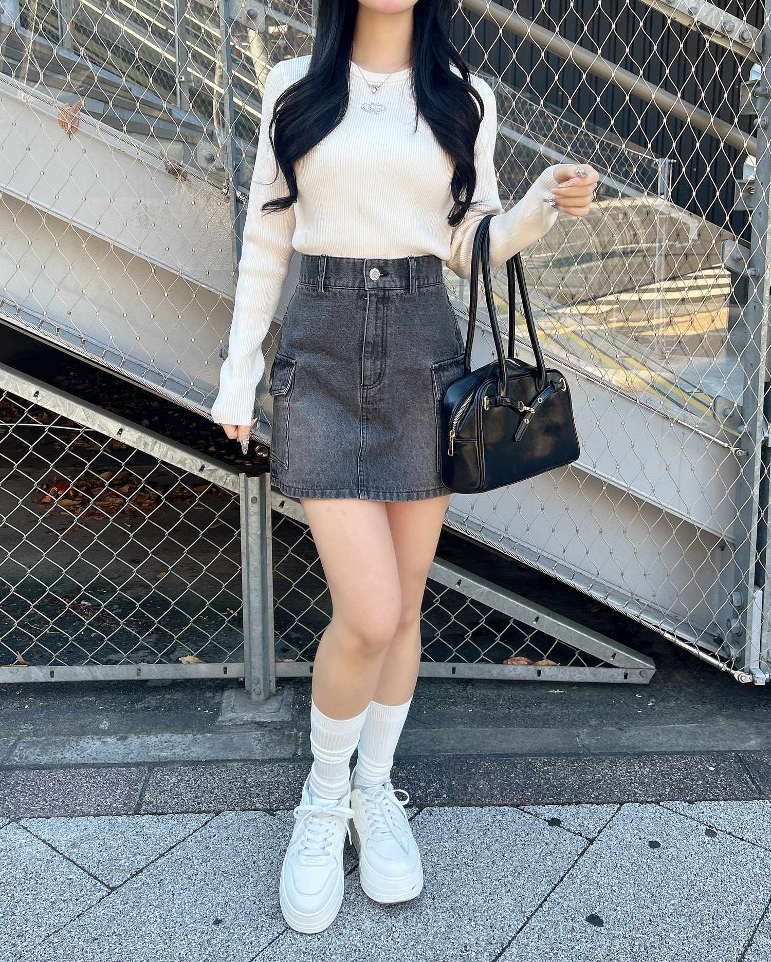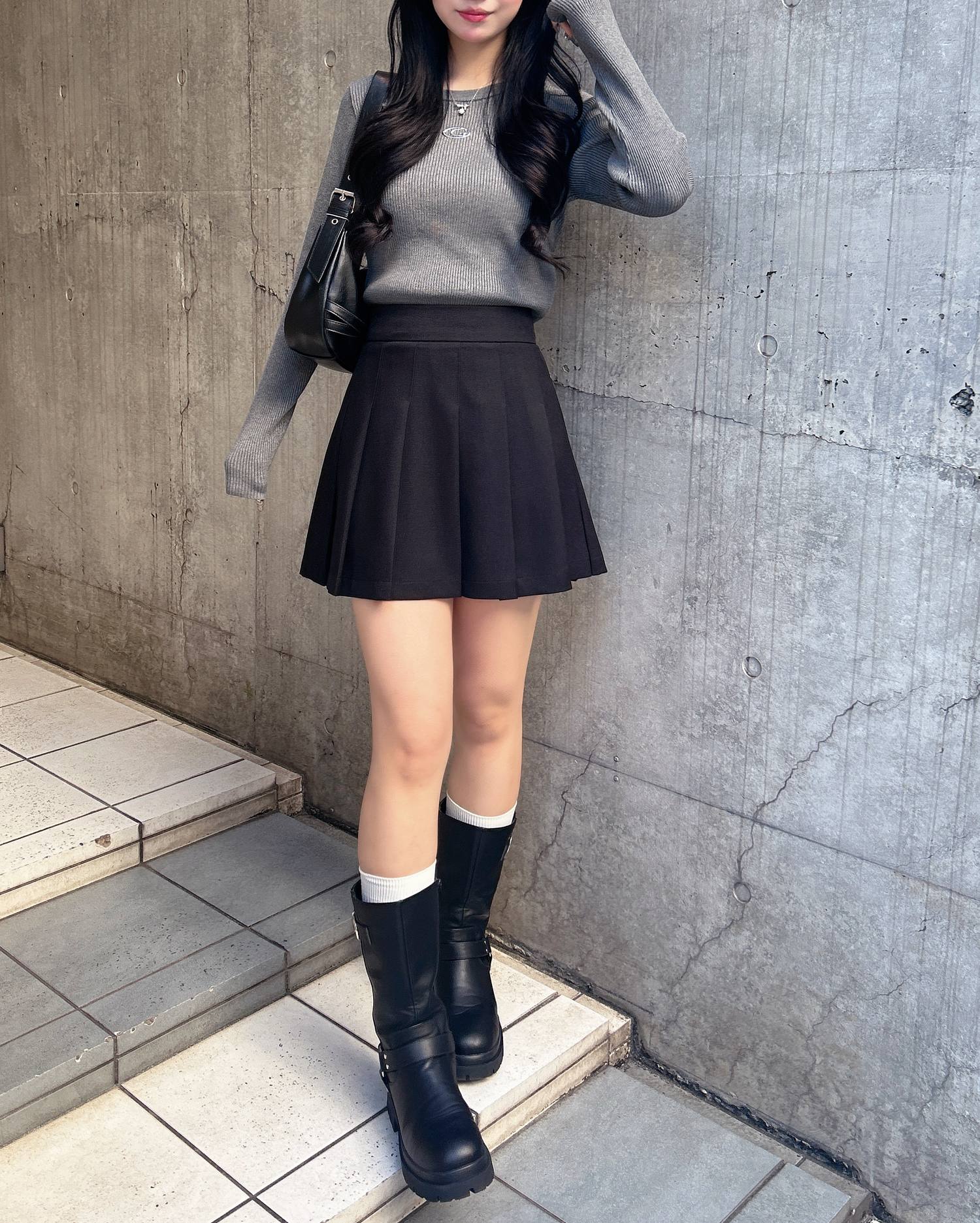 プリーツスカート×ロングブーツで韓国系のコーデに!