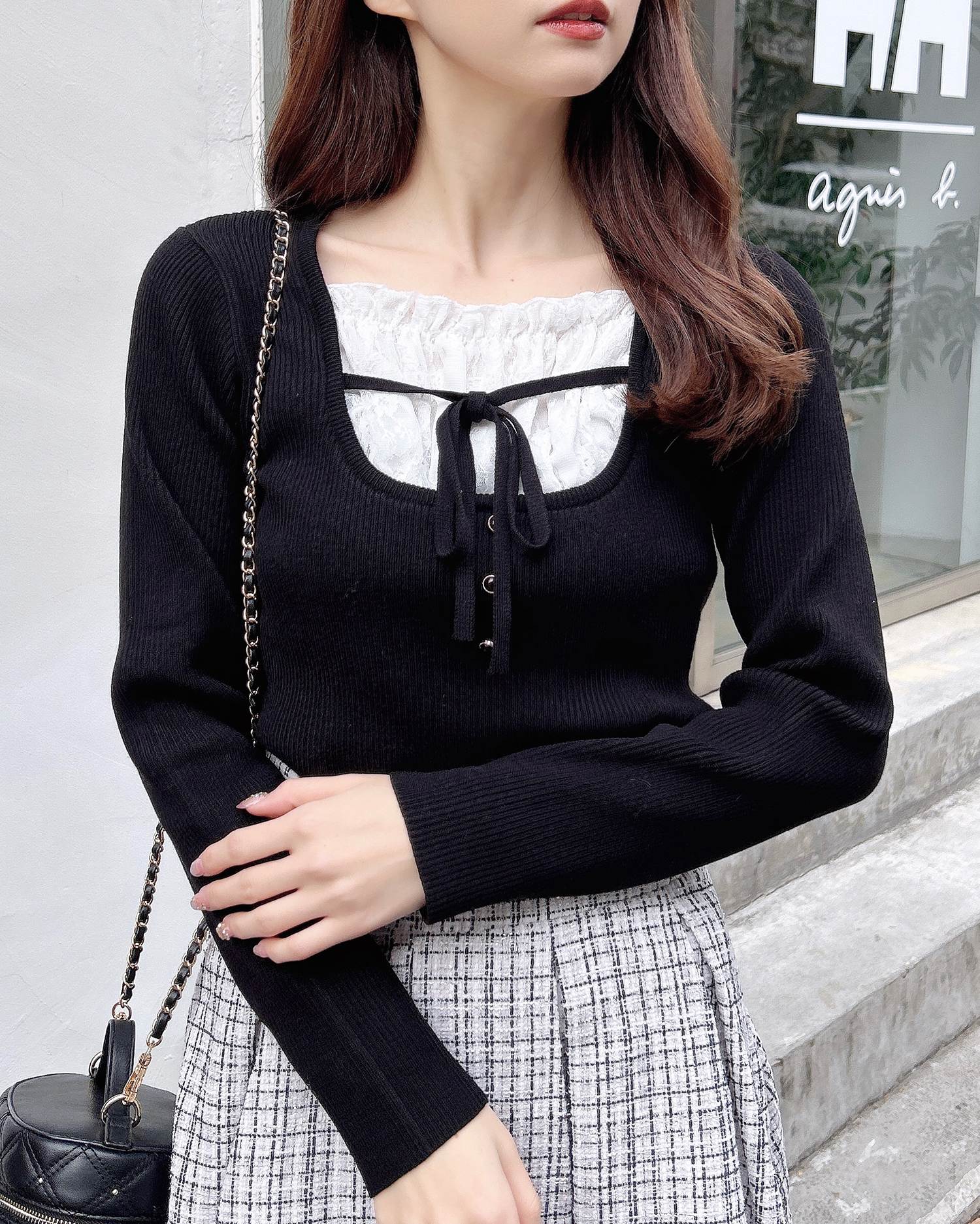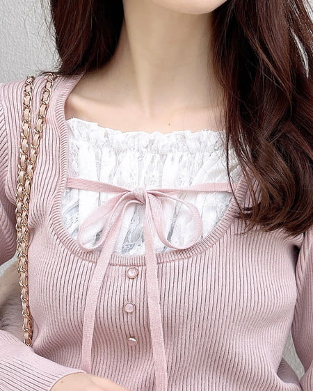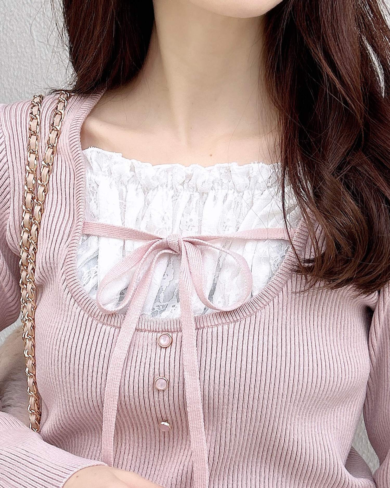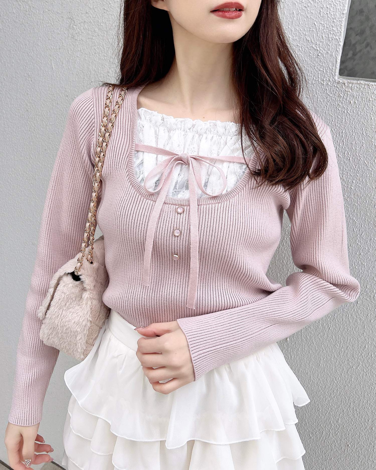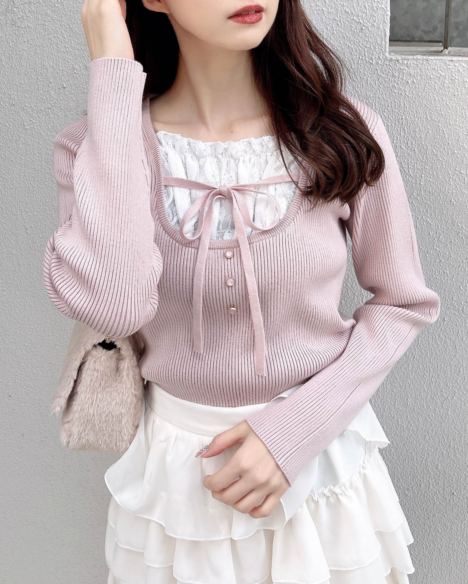 【胸元のレース×リボンがかわいい♡ドッキングニット】
