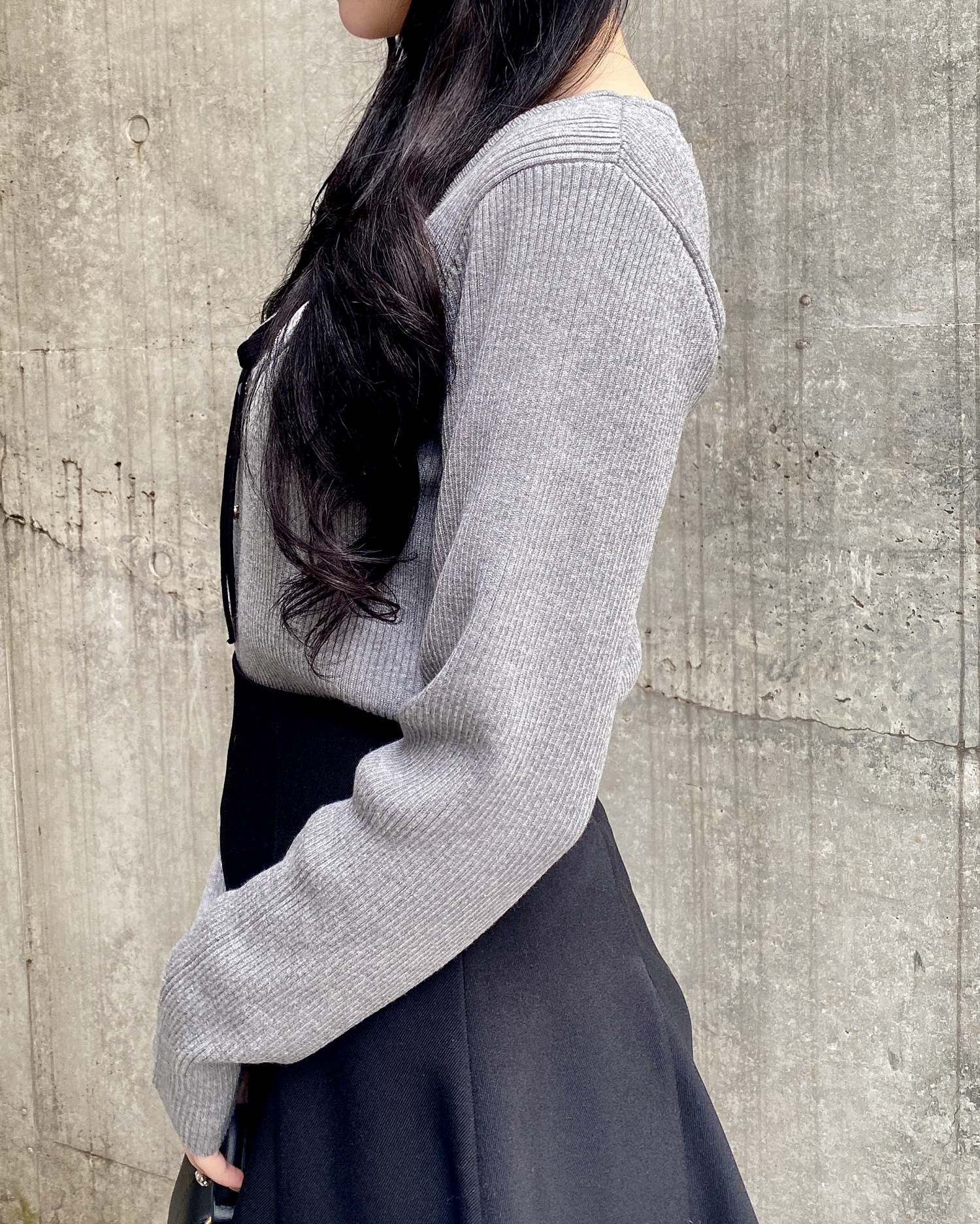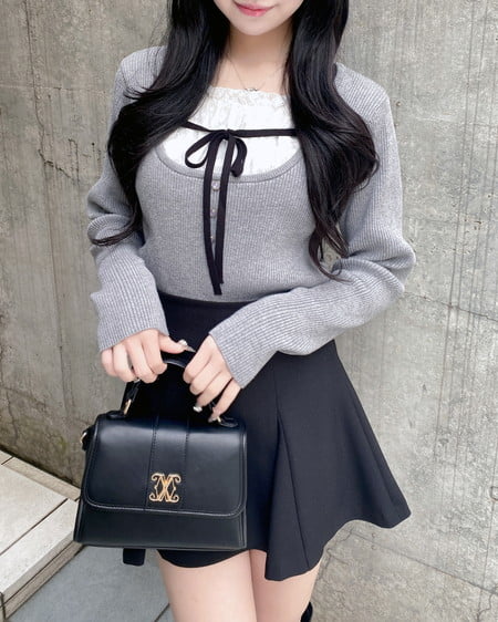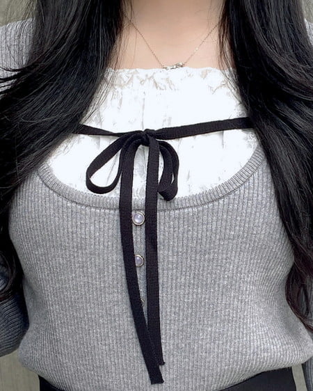甘い印象の胸元レースと、存在感ある少し長めのリボンがほどよくフェミニンで