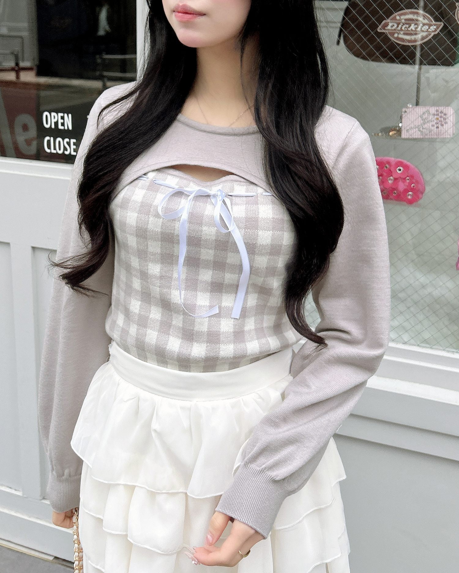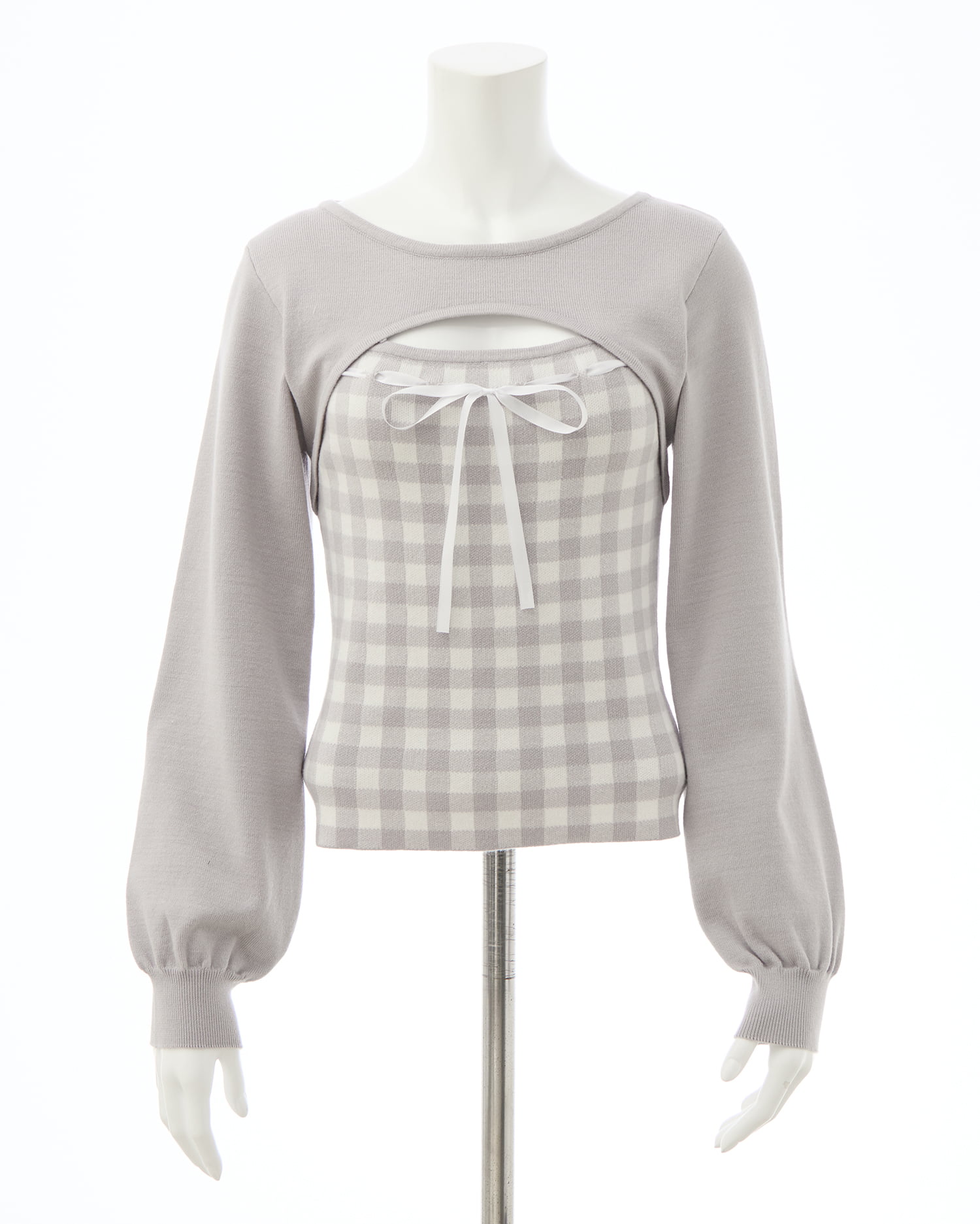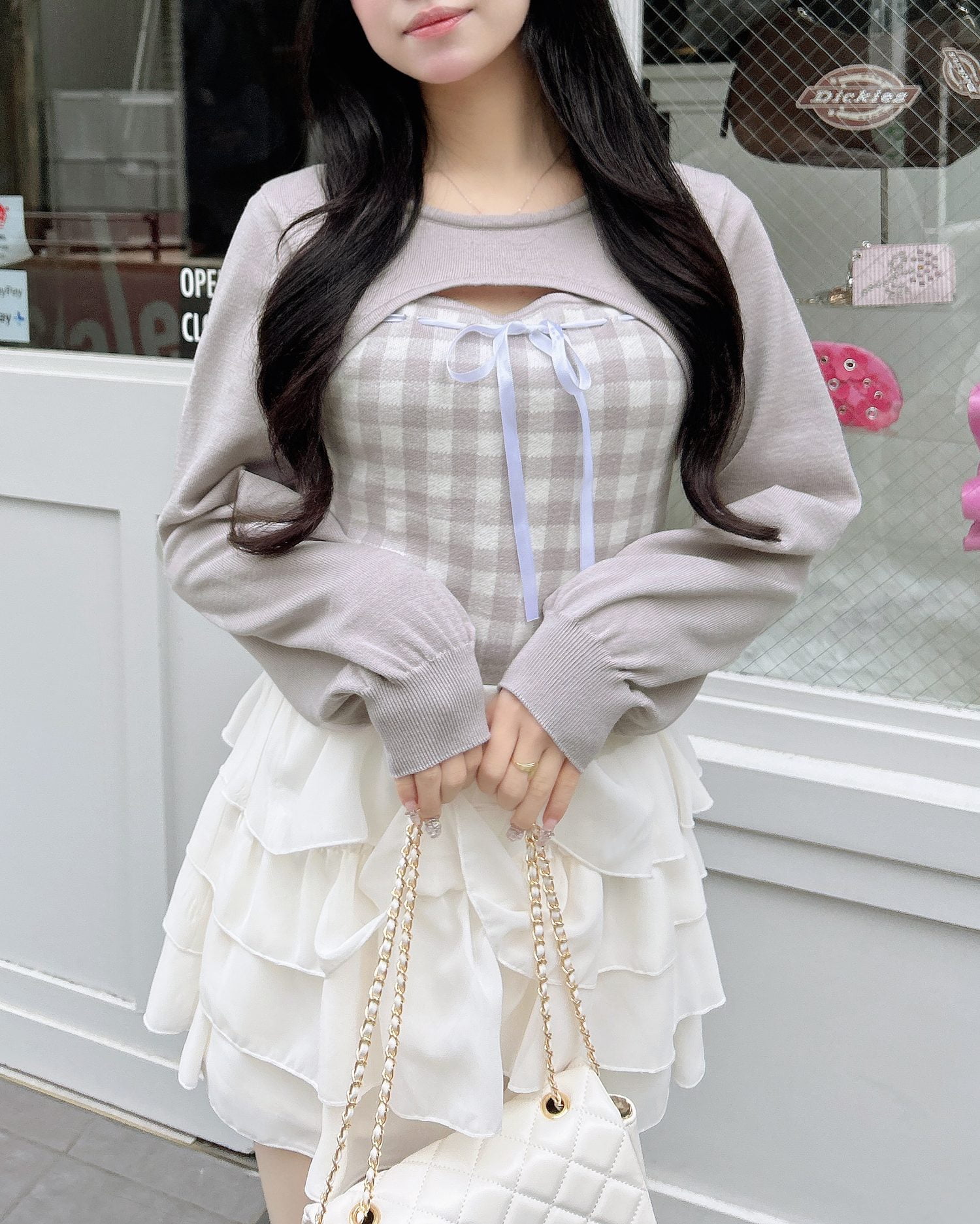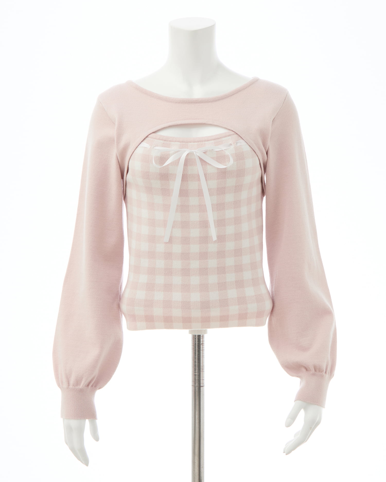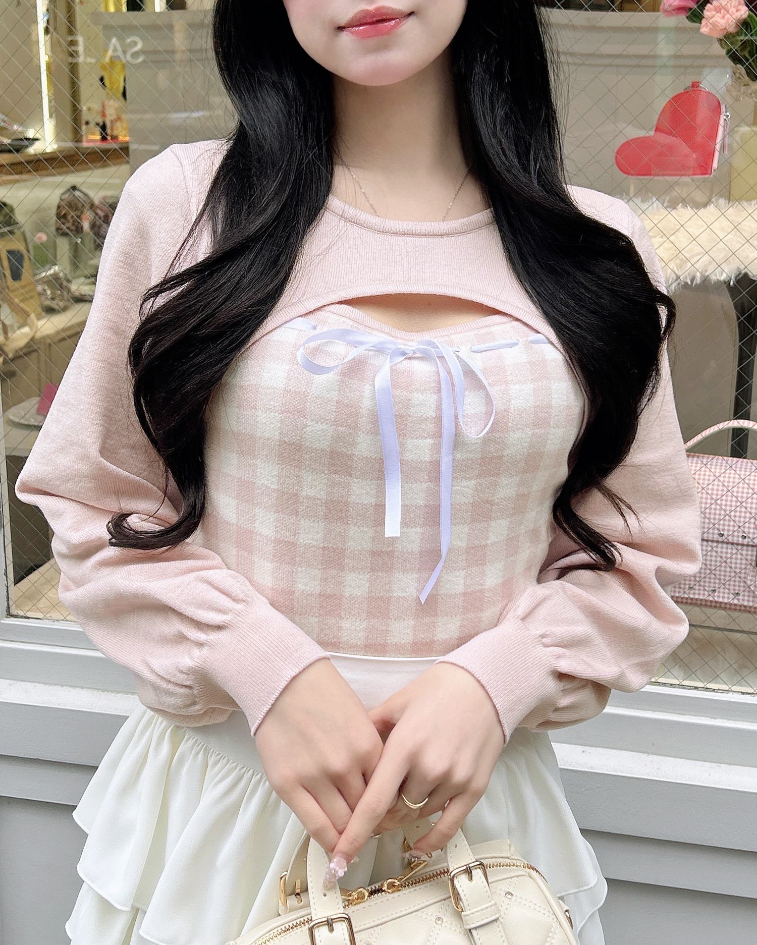 胸元のリボンとギンガムチェック柄がコーデのアクセントになります。