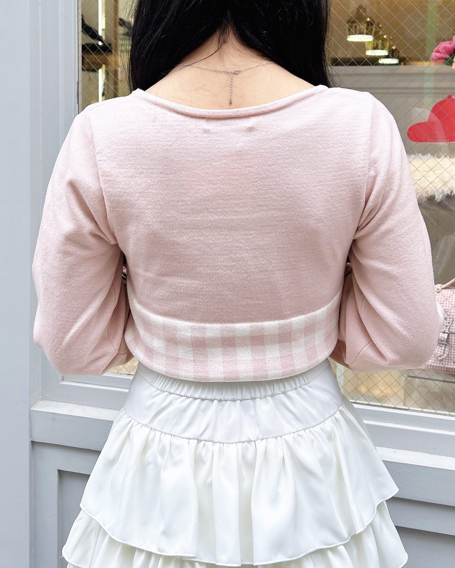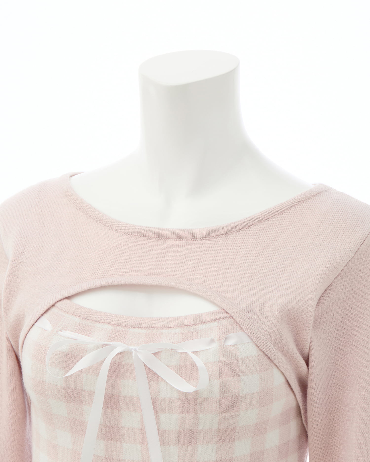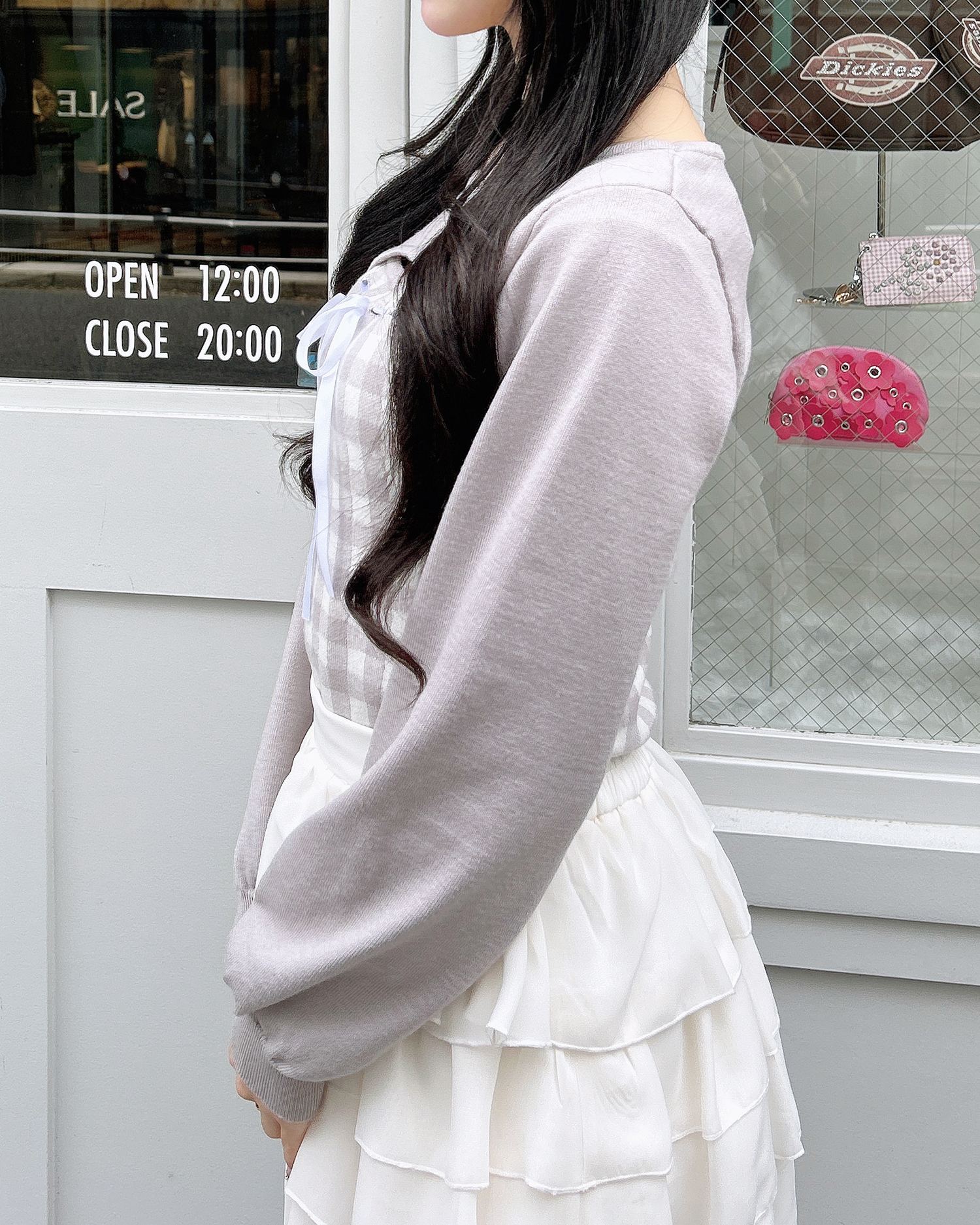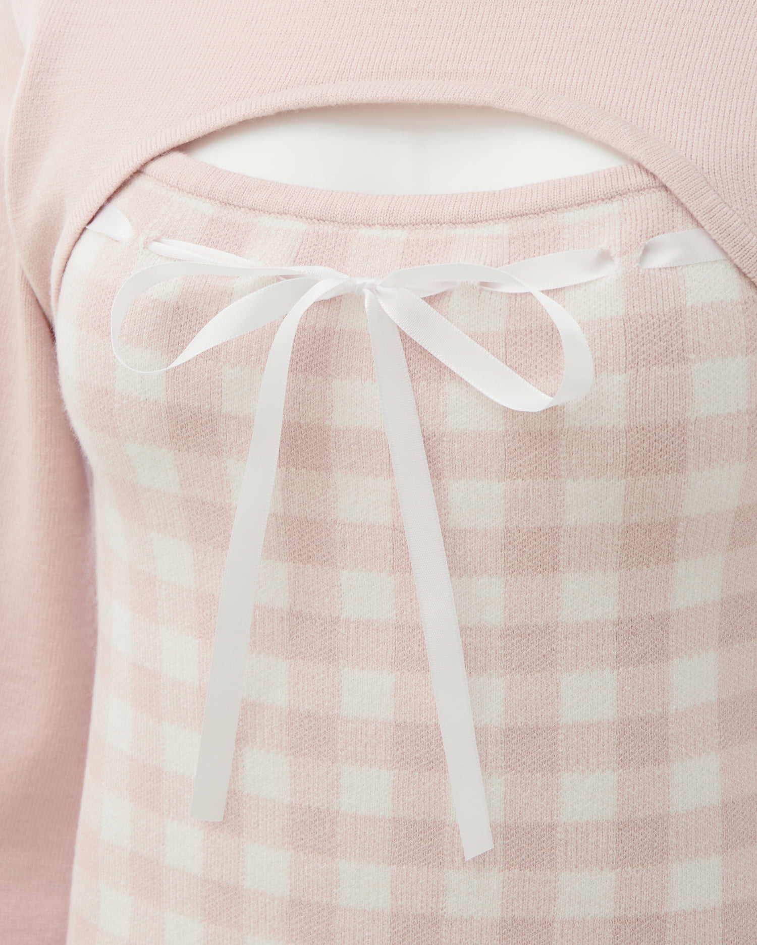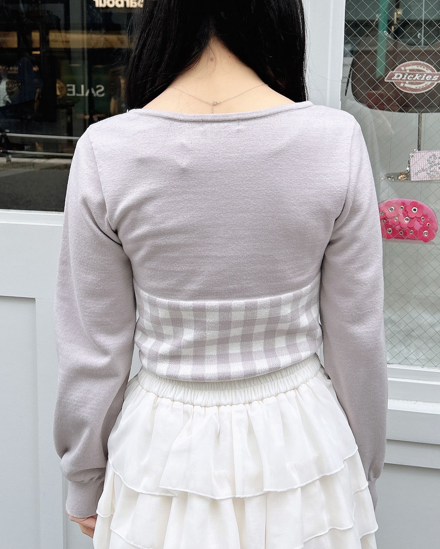 胸元のリボンとギンガムチェック柄がコーデのアクセントになります。
