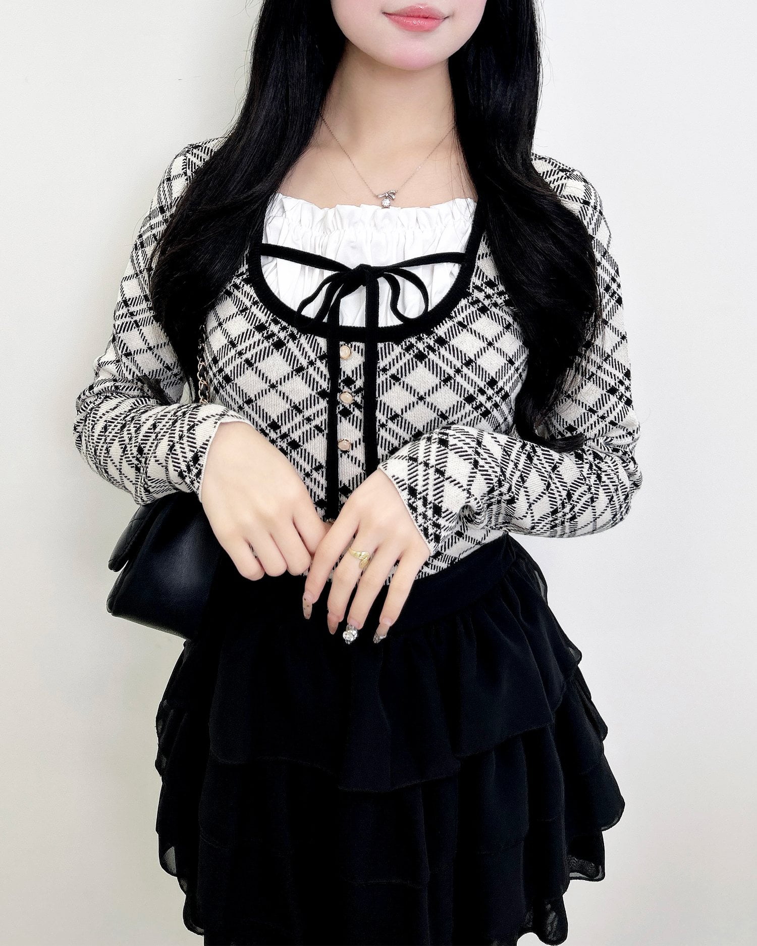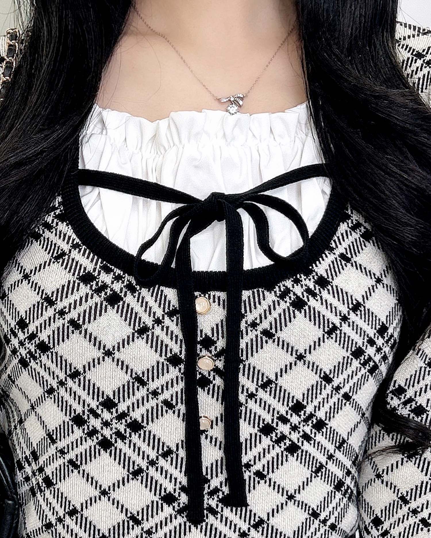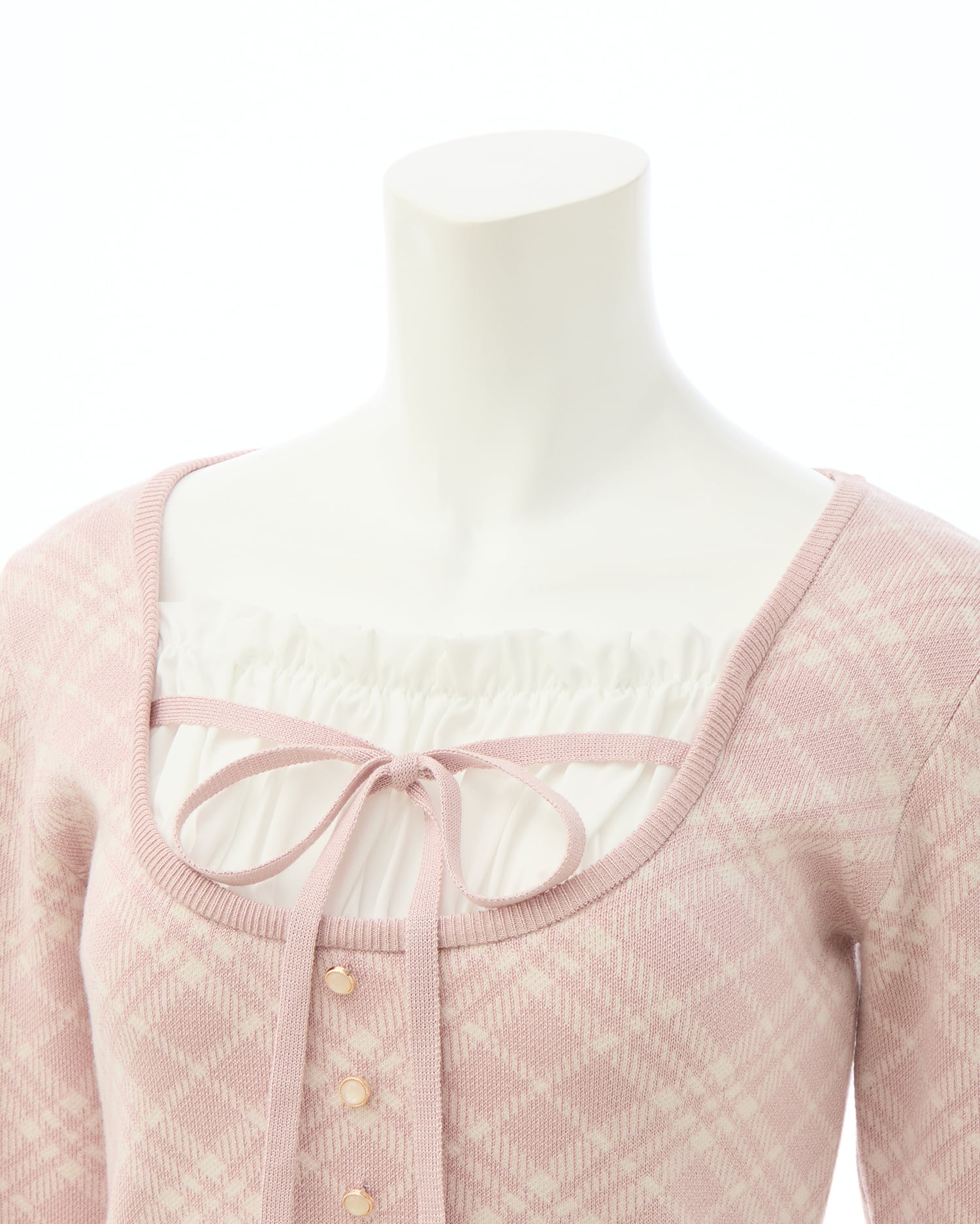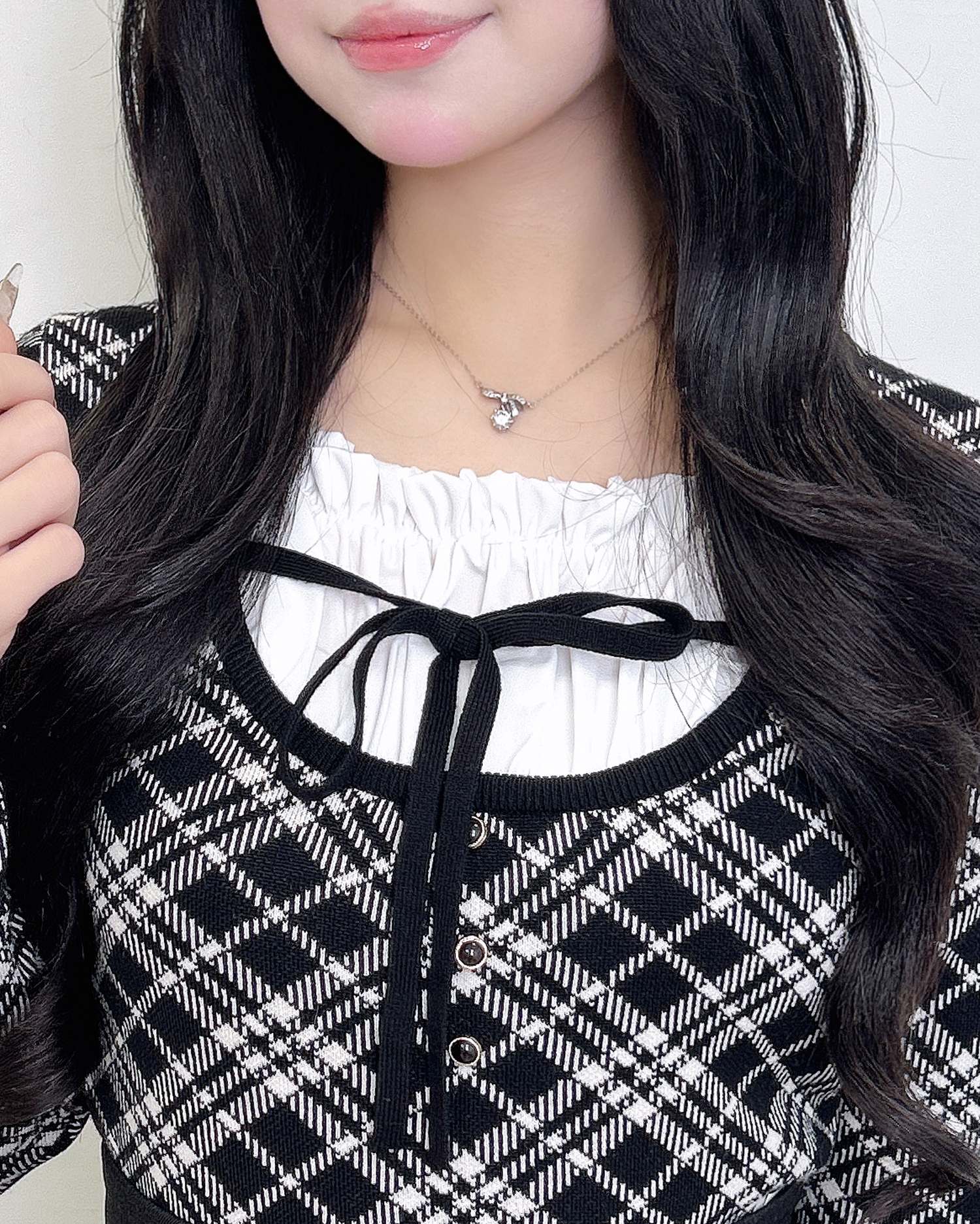 【胸元のフリル×リボンがかわいい♡ドッキングチェック柄ニット】