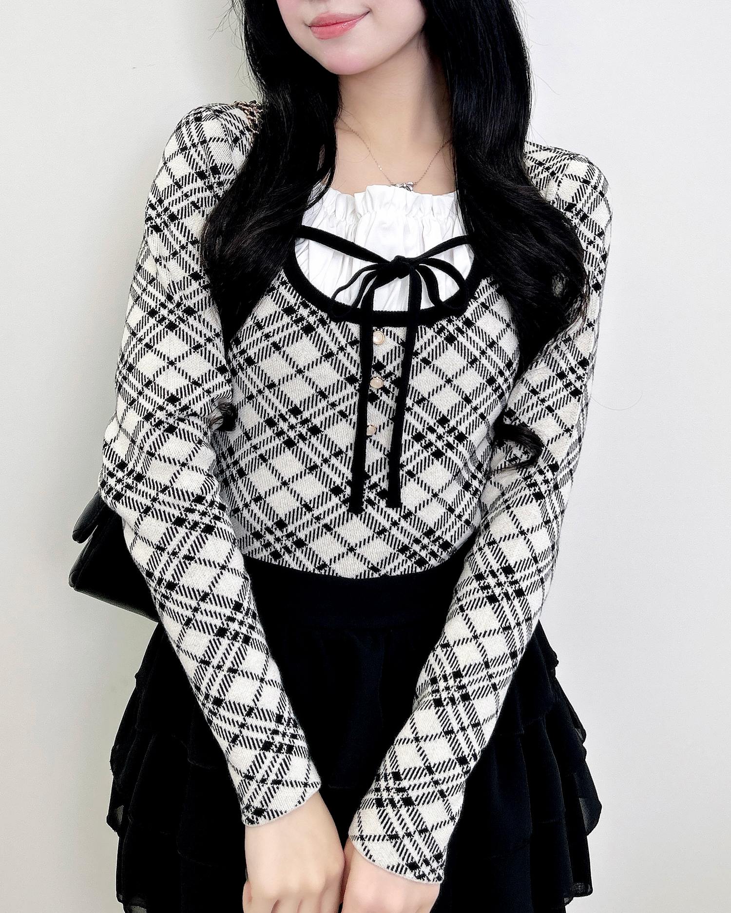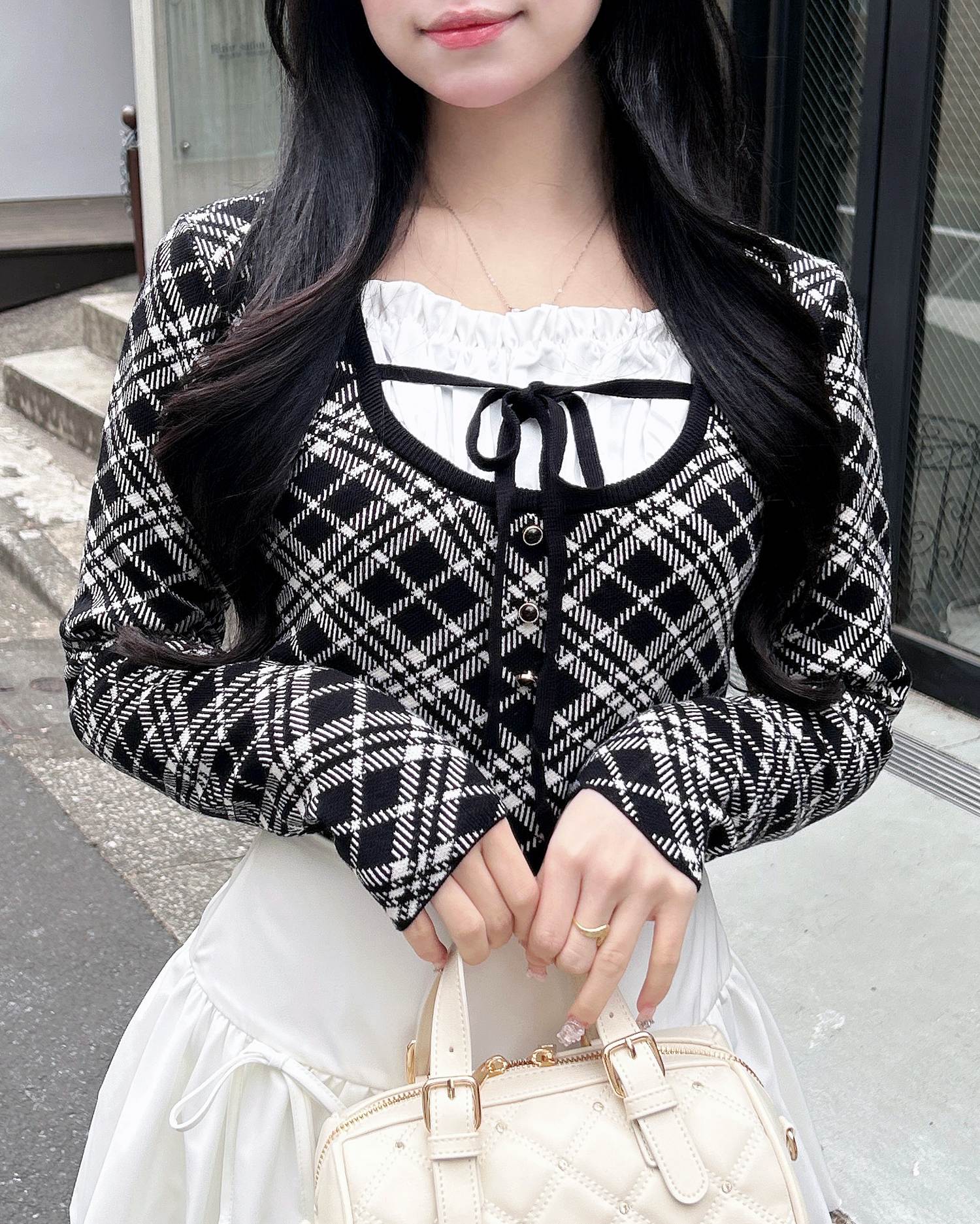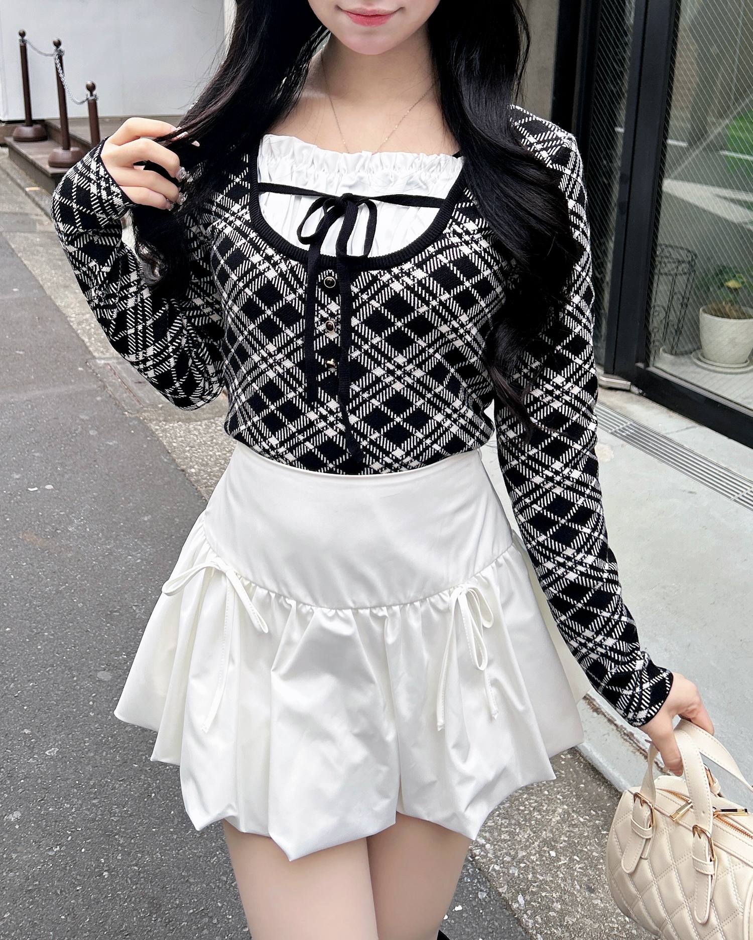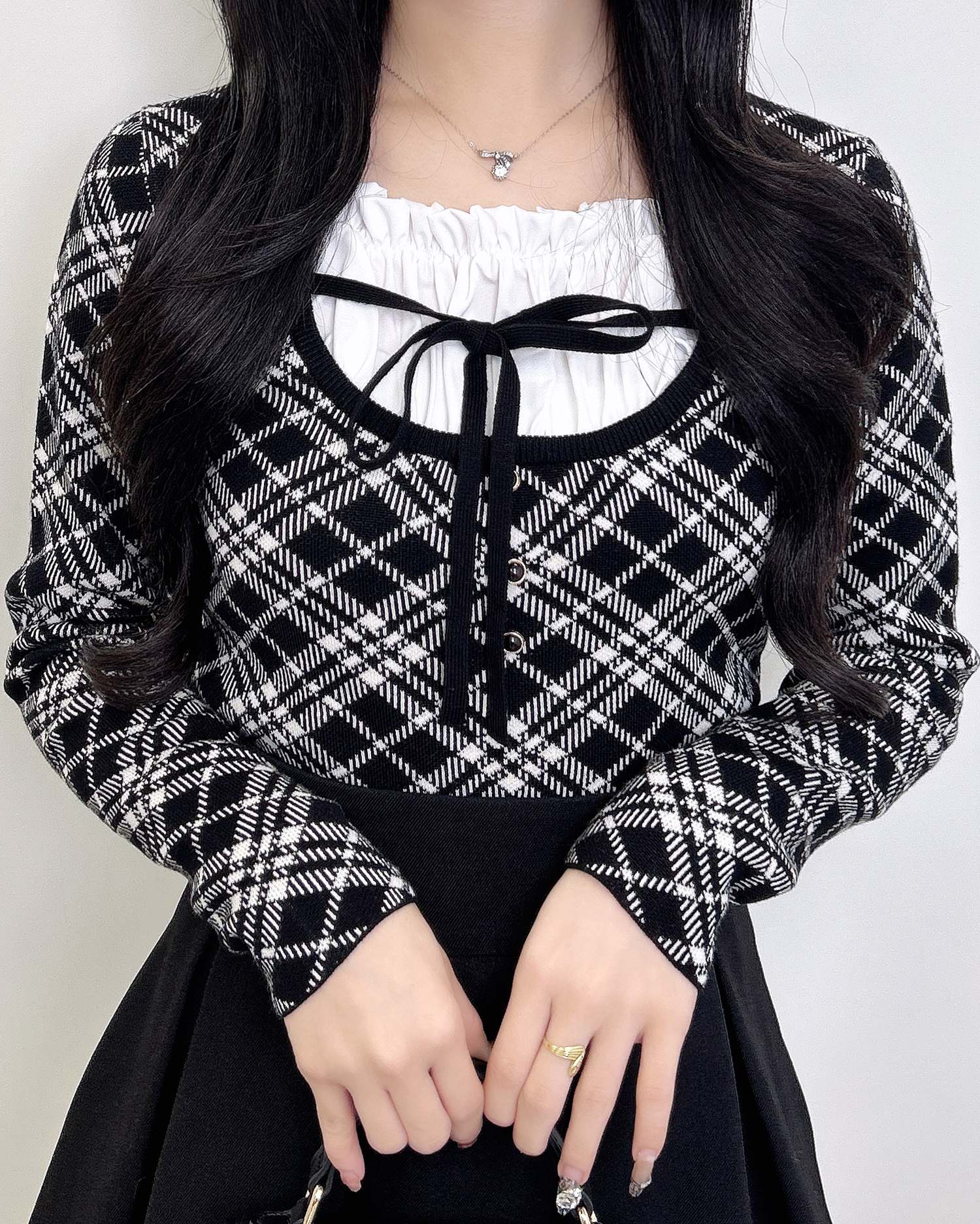 【胸元のフリル×リボンがかわいい♡ドッキングチェック柄ニット】