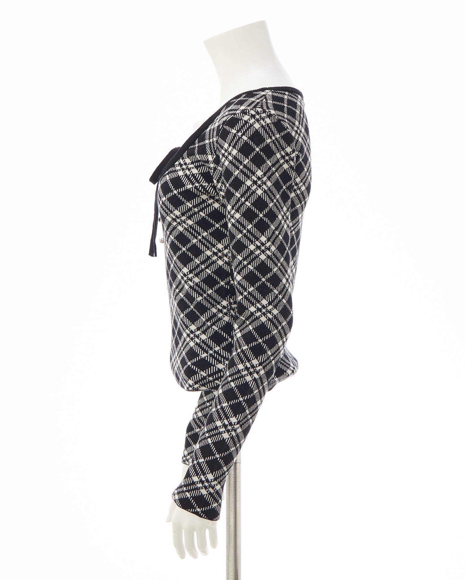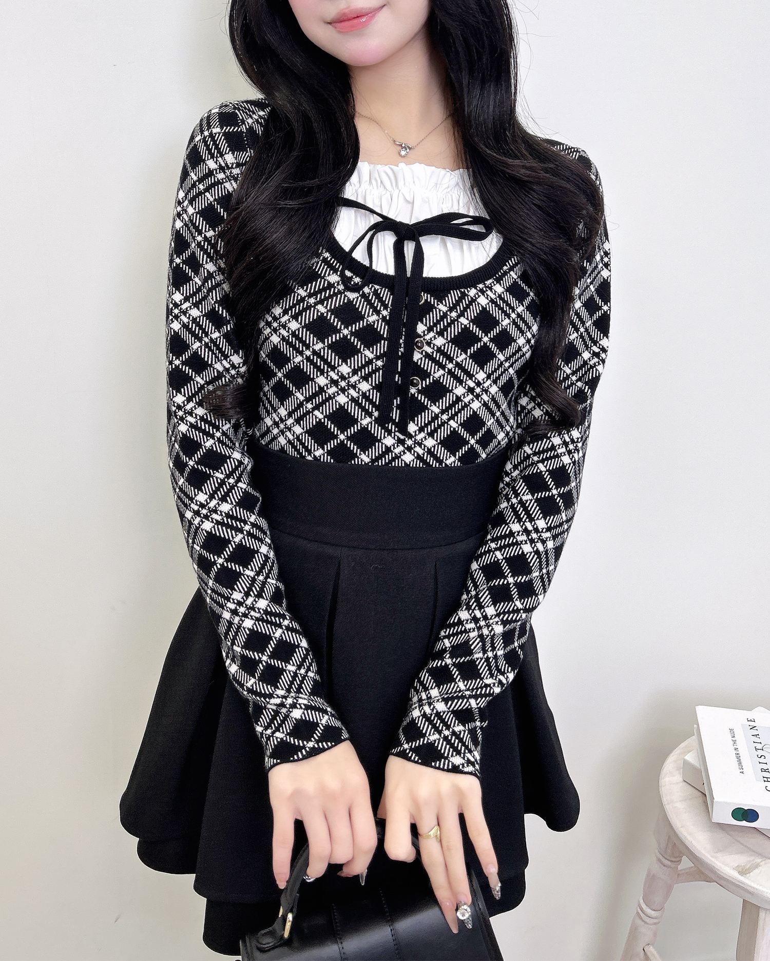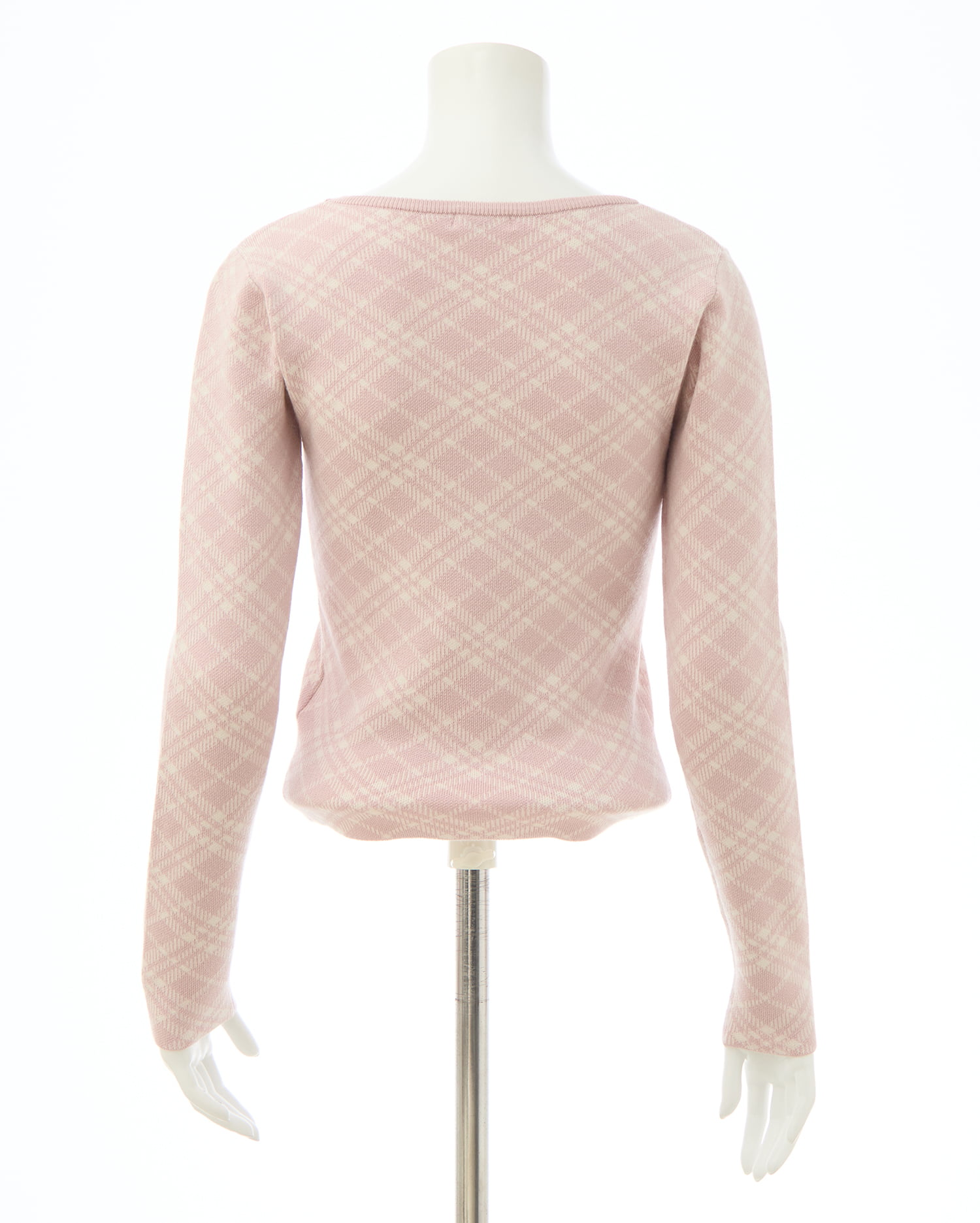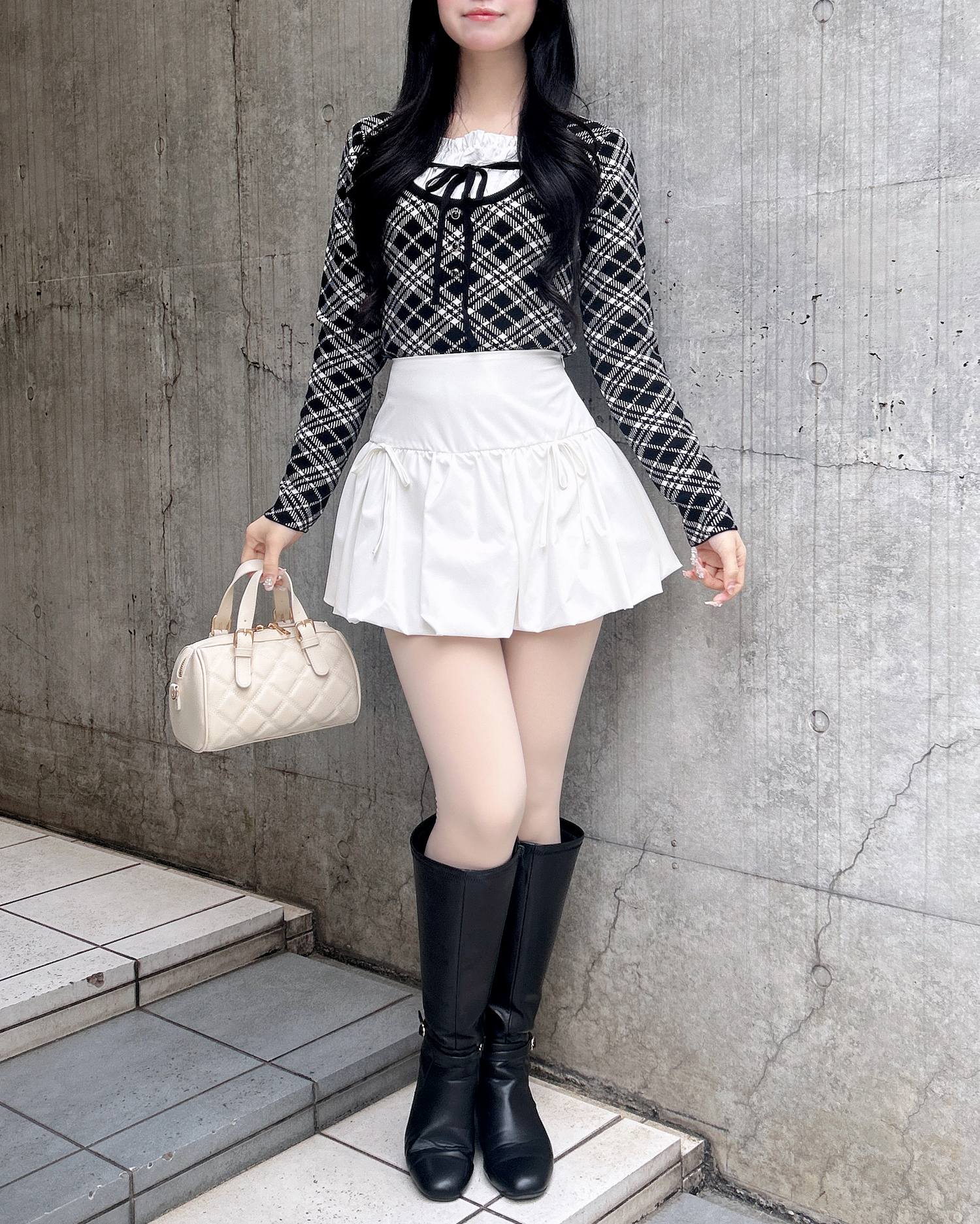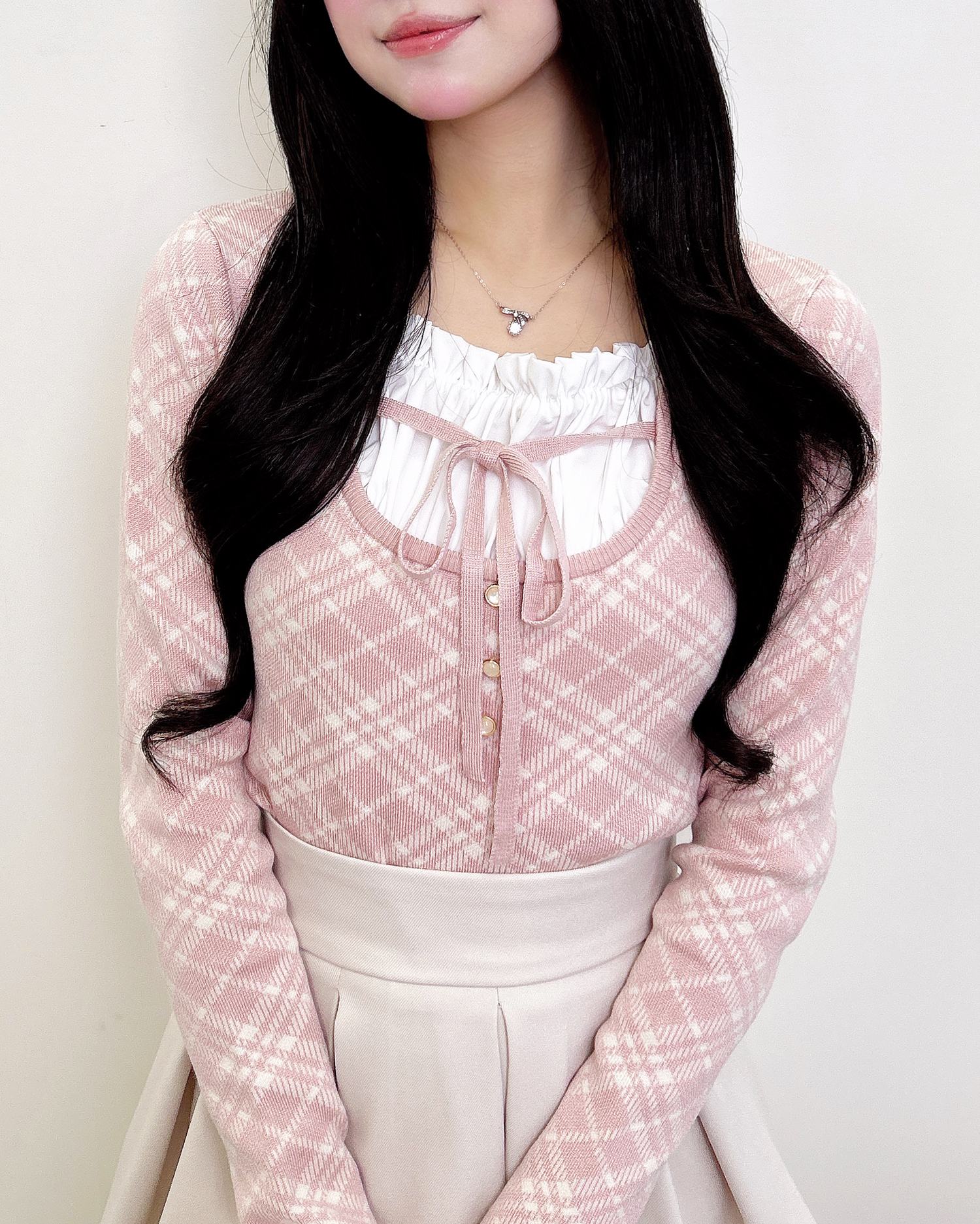 【胸元のフリル×リボンがかわいい♡ドッキングチェック柄ニット】