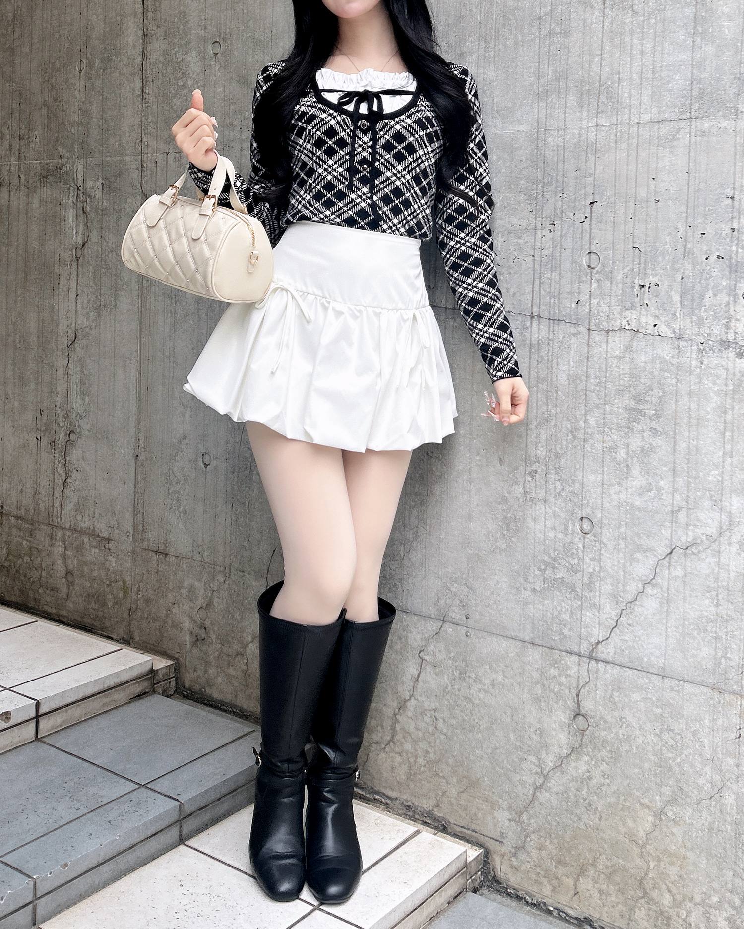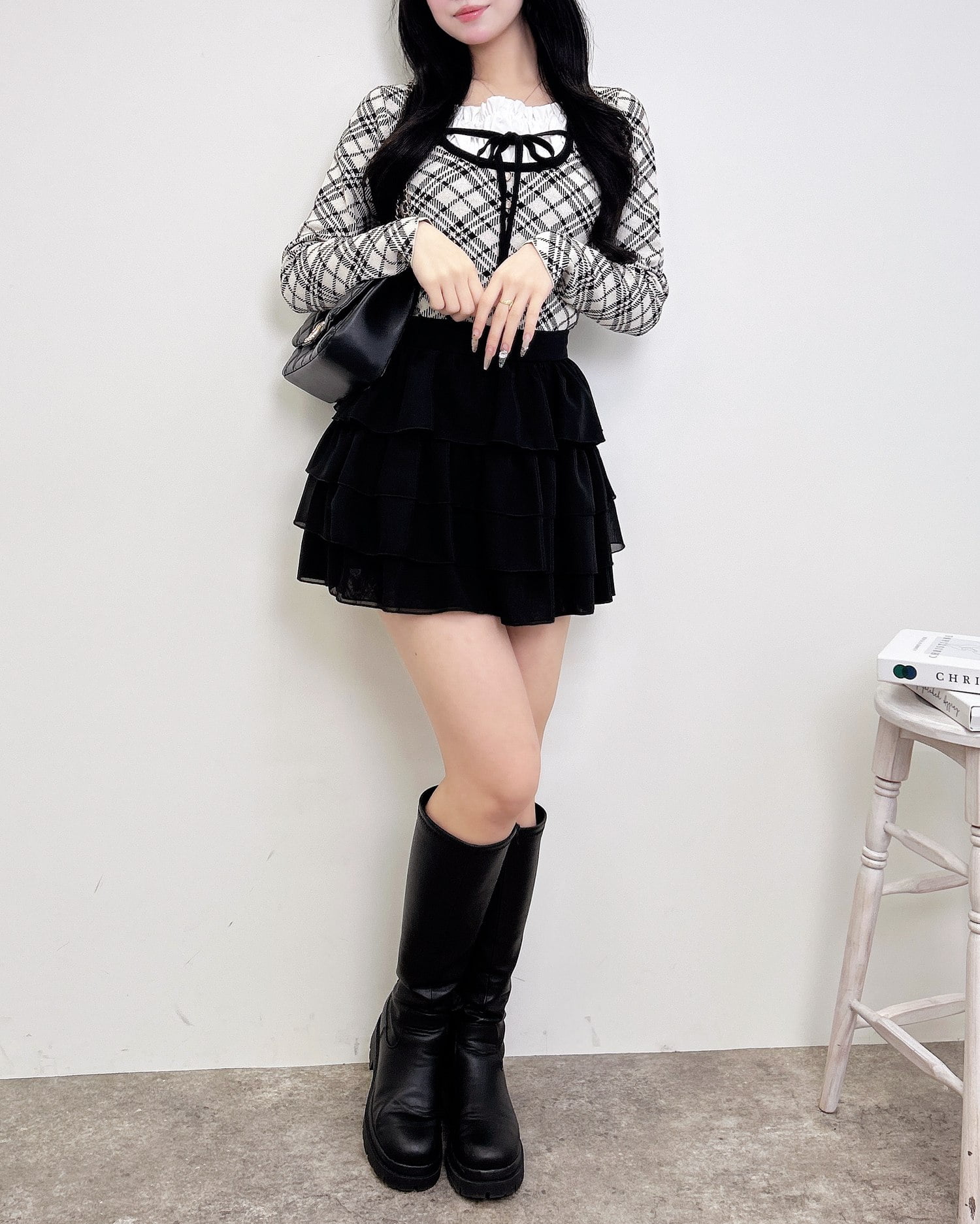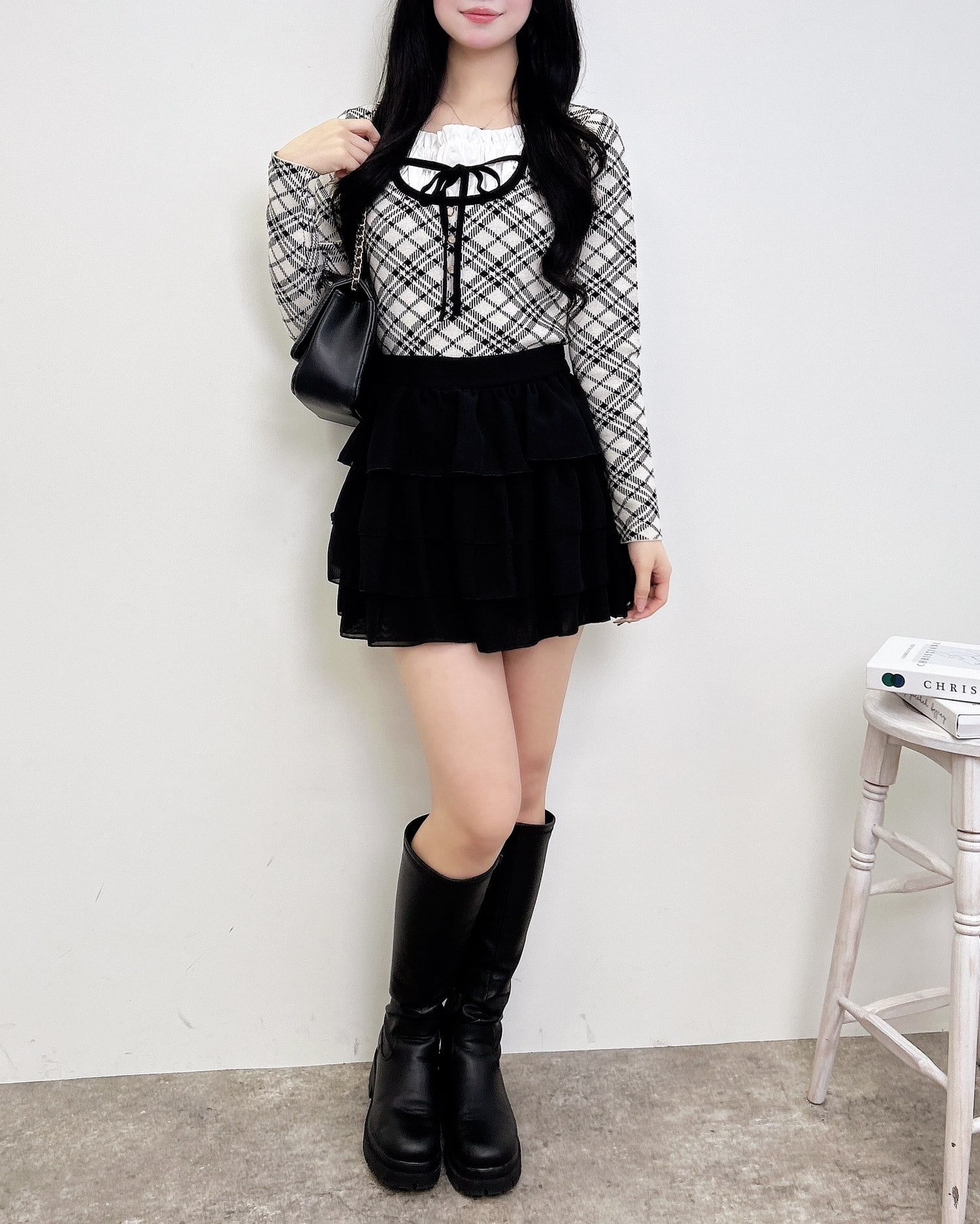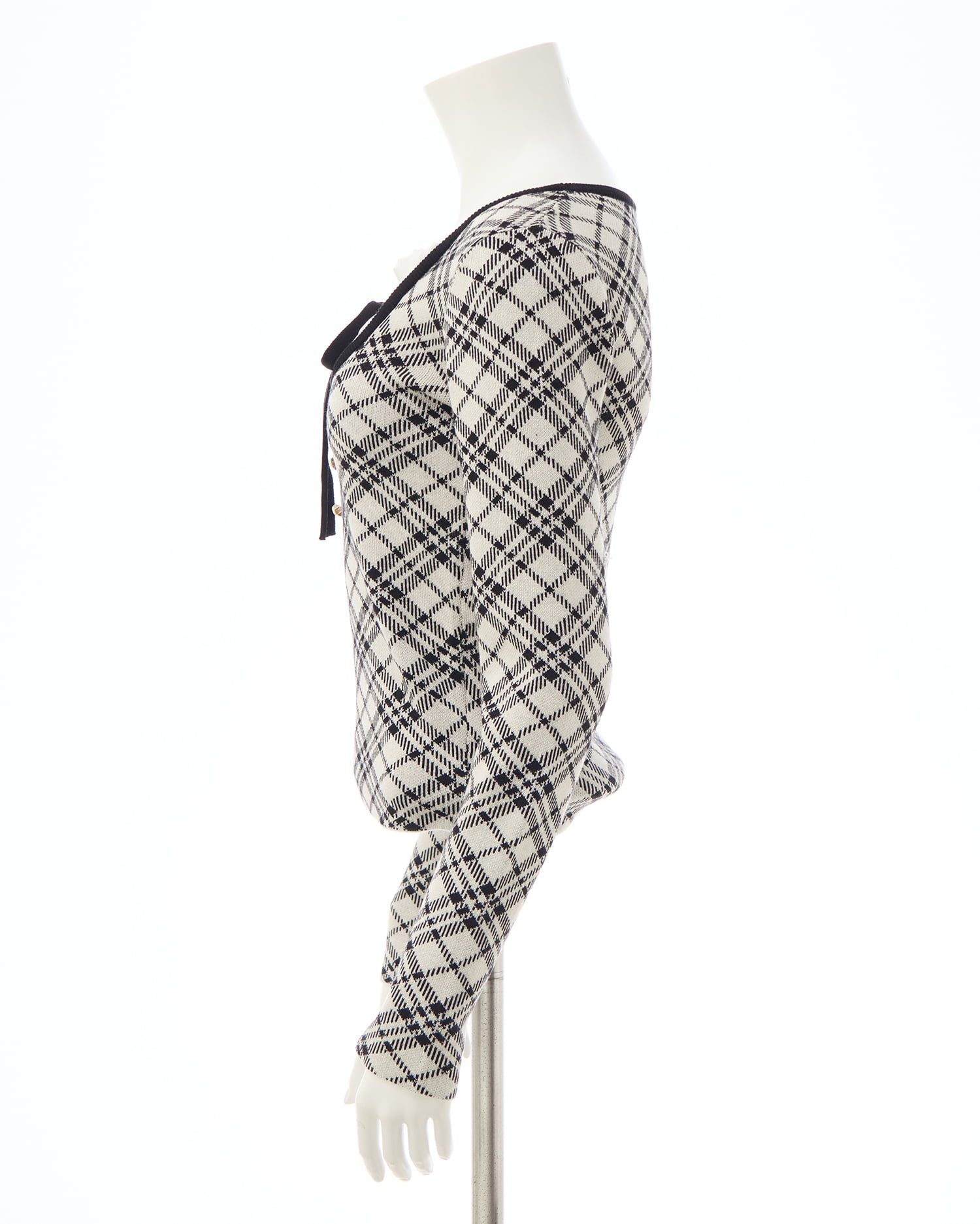 【胸元のフリル×リボンがかわいい♡ドッキングチェック柄ニット】