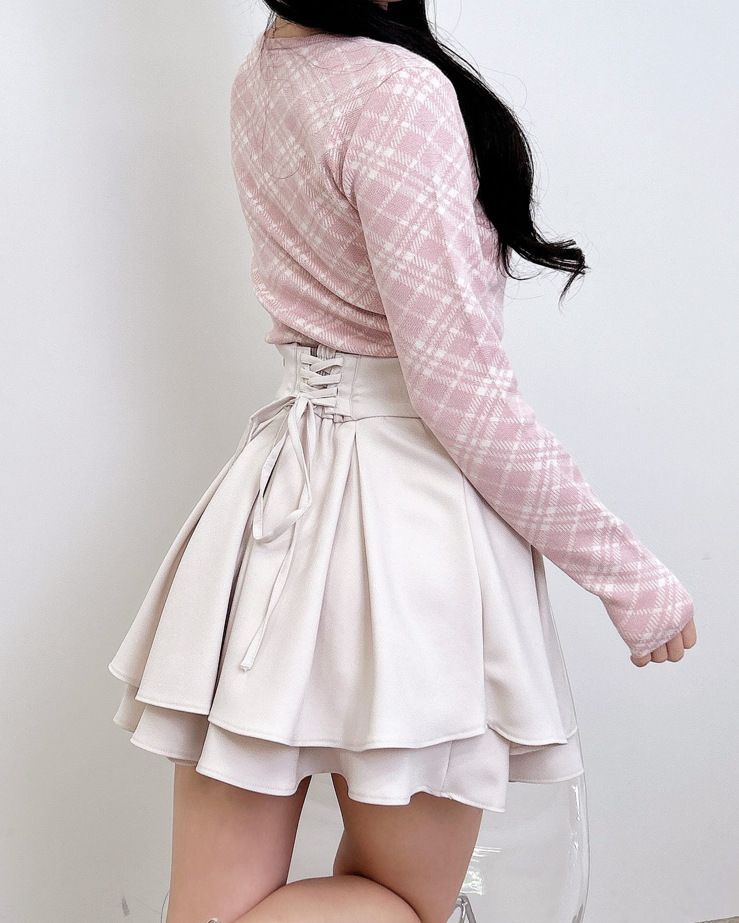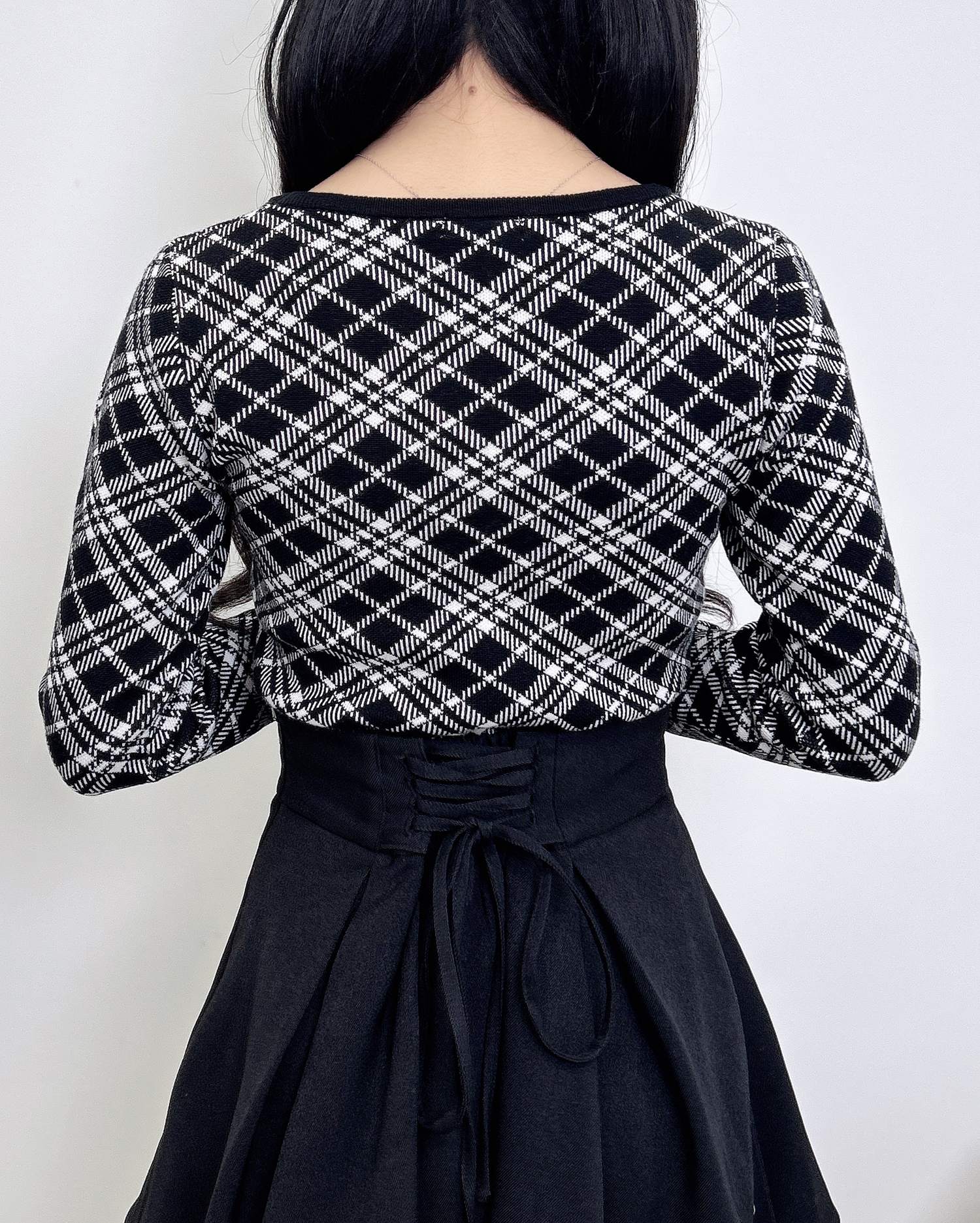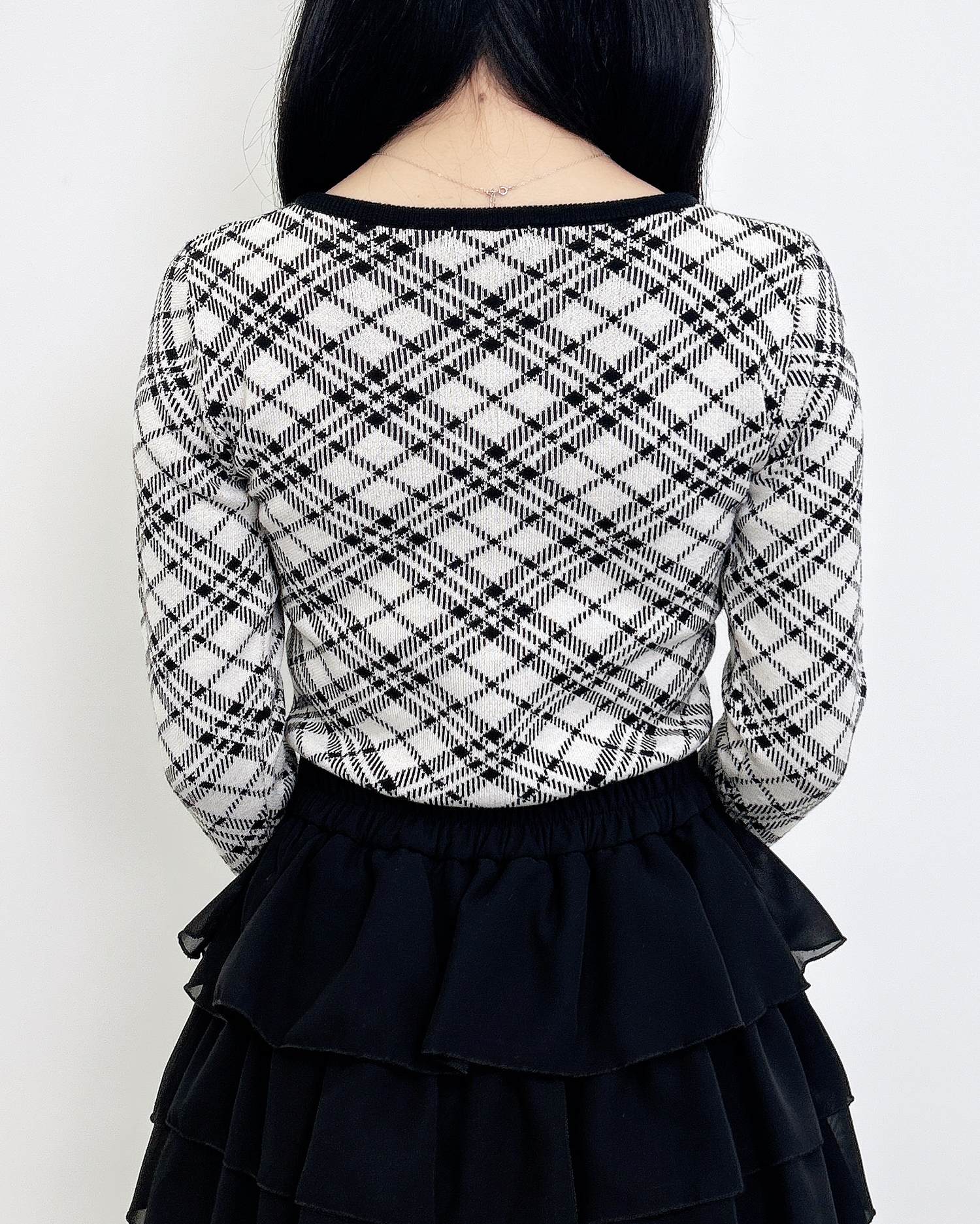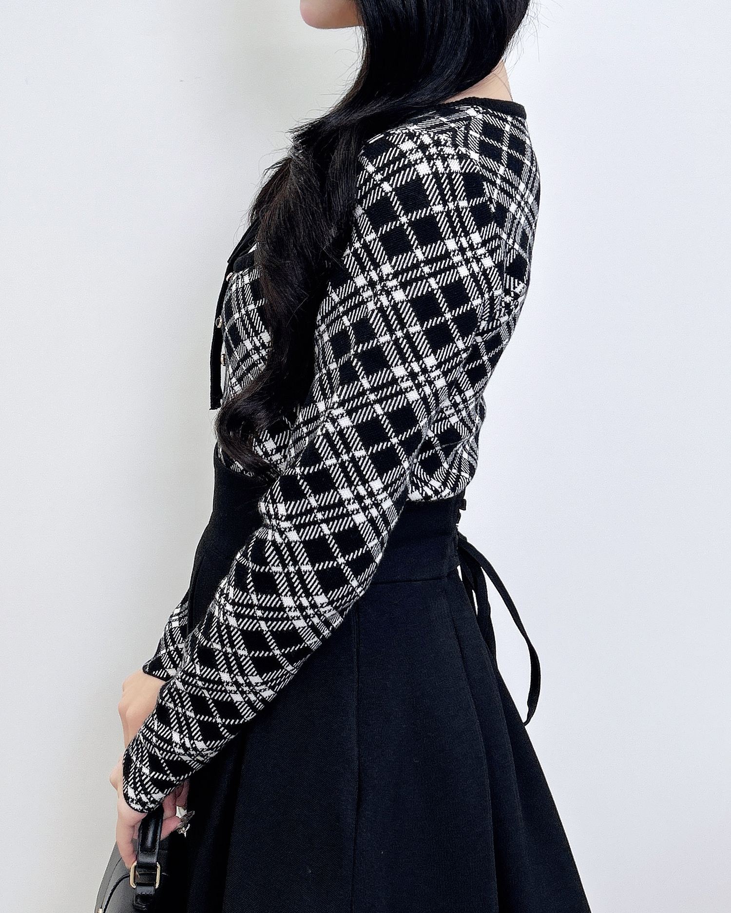 【胸元のフリル×リボンがかわいい♡ドッキングチェック柄ニット】