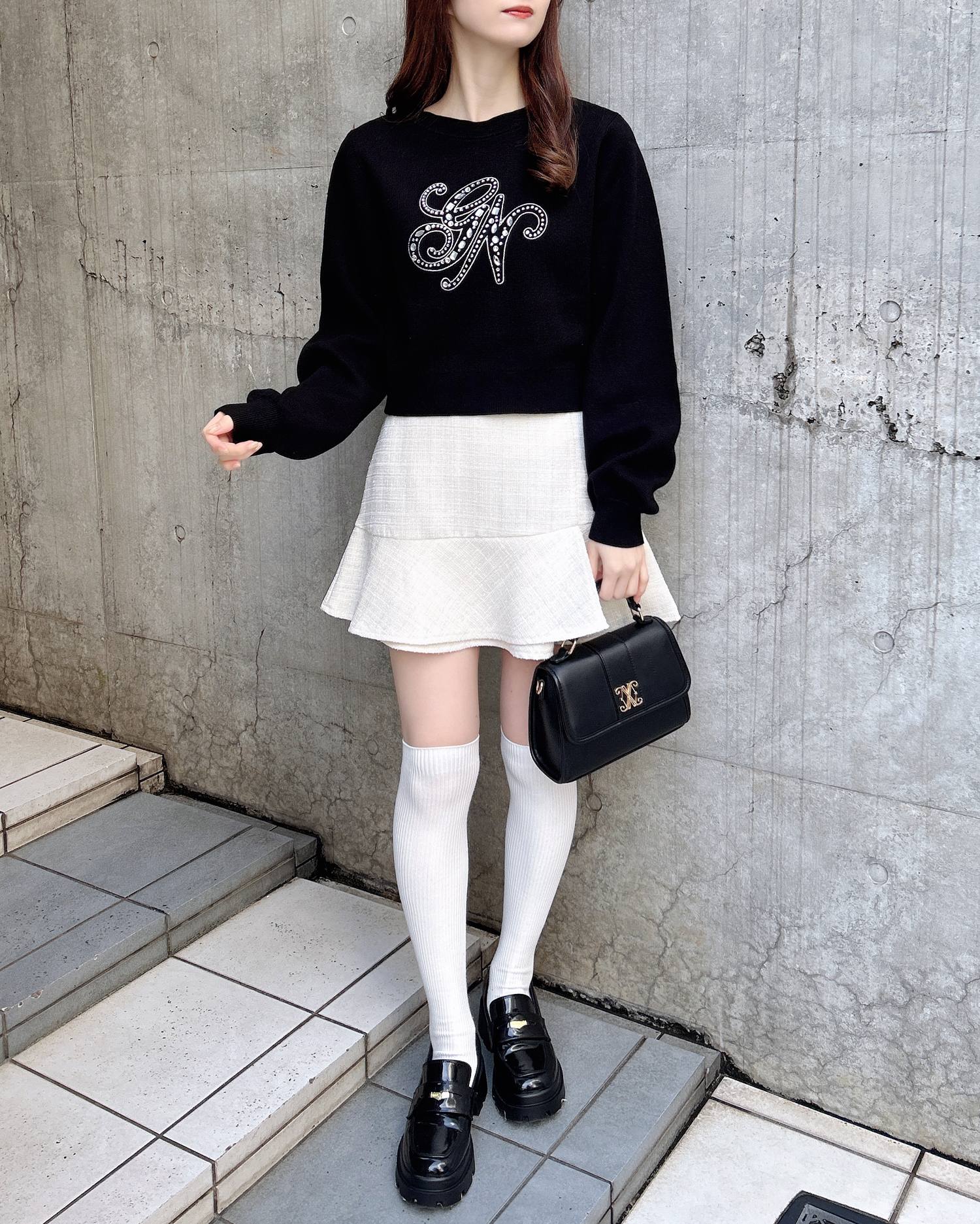 ツイードのボトムスを合わせると大人っぽい印象に仕上がります。
