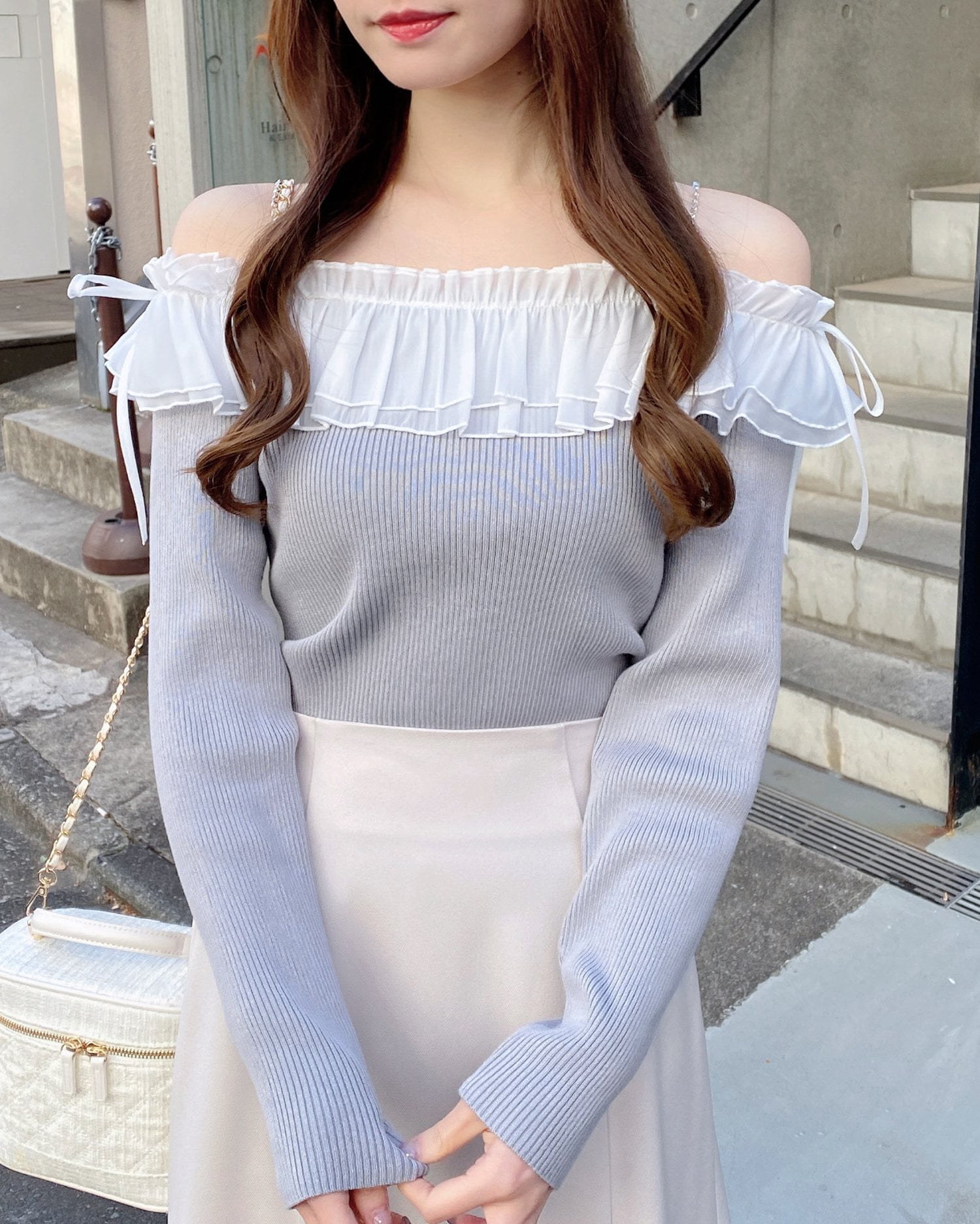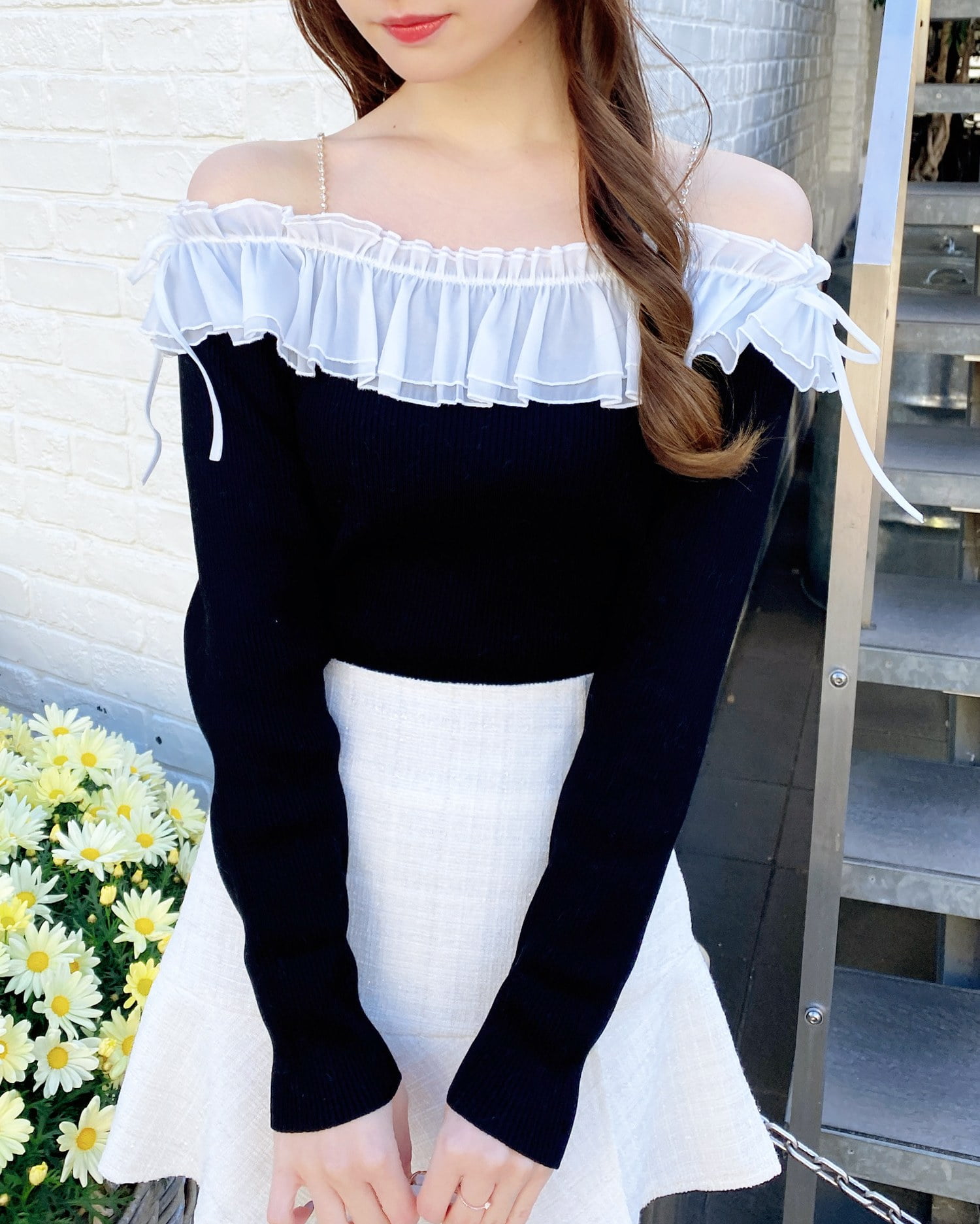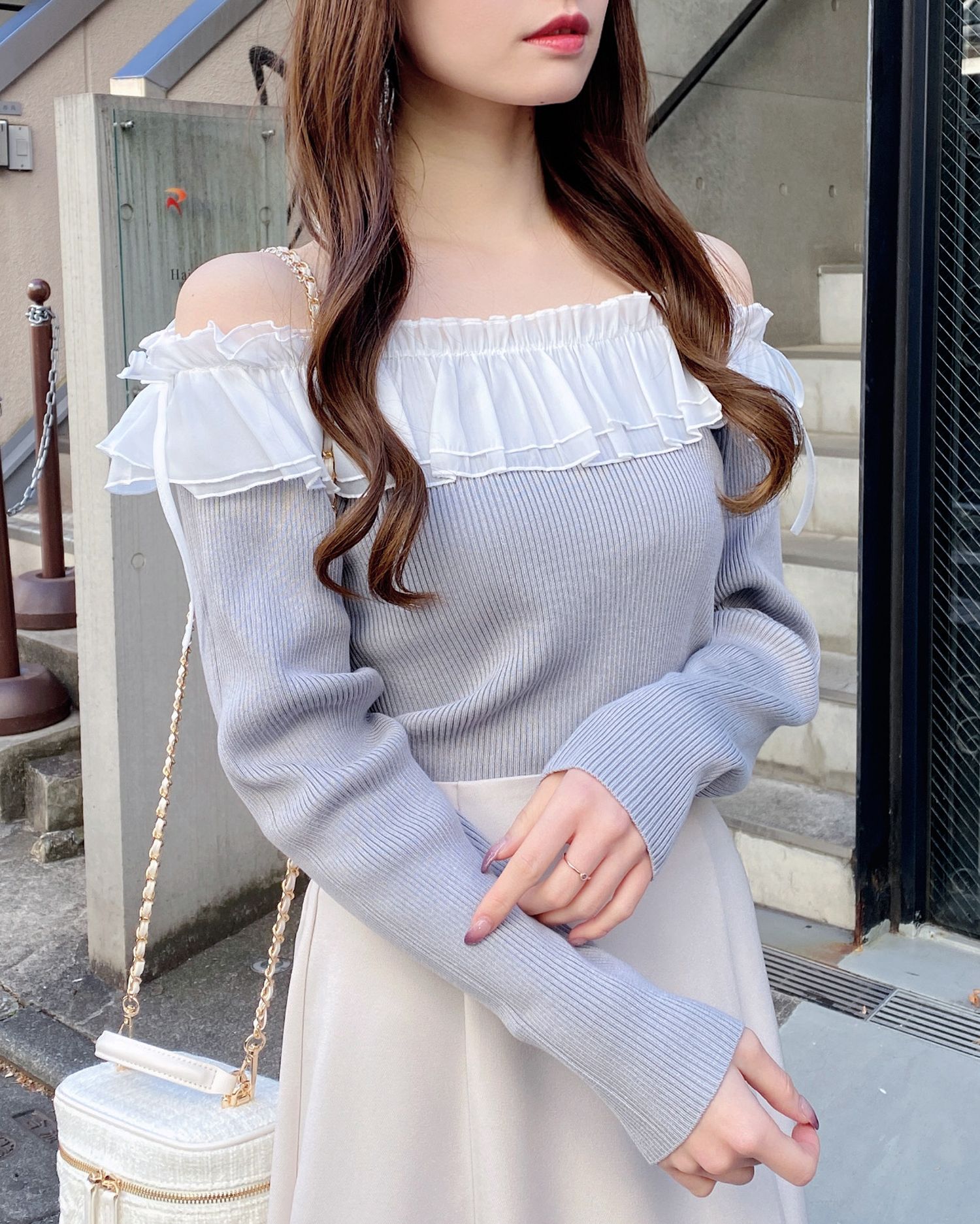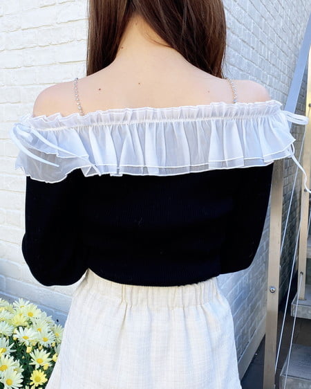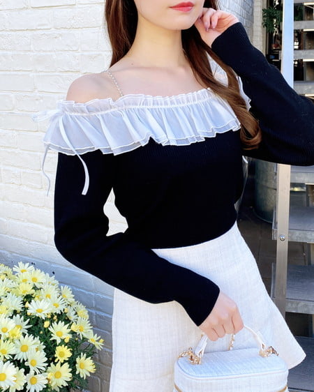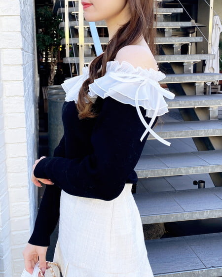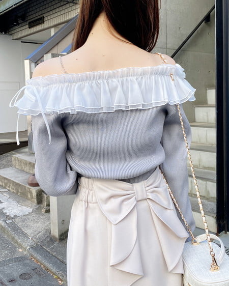 デコルテ部分にたっぷりとあしらったフリルが存在感抜群のオフショルニット。