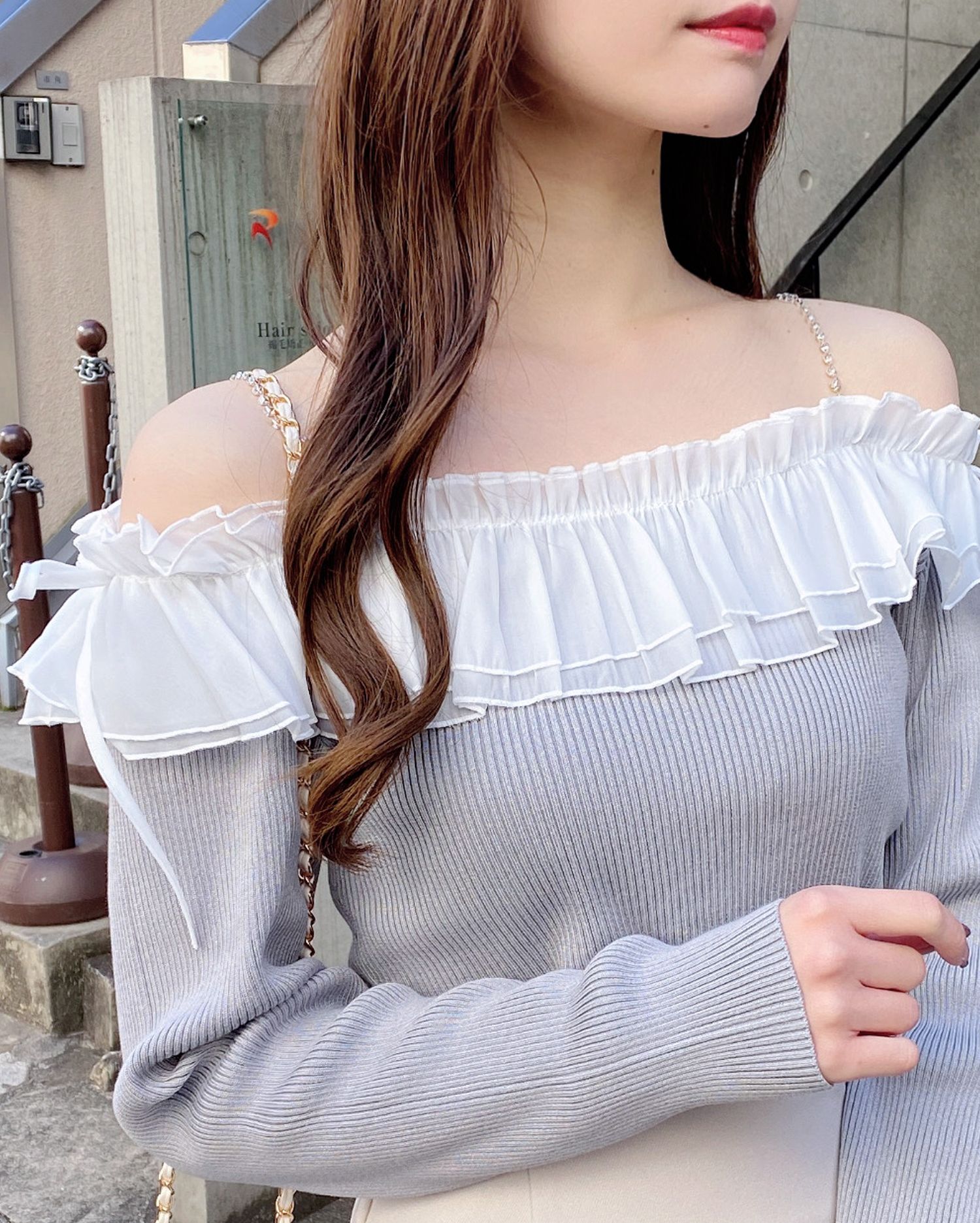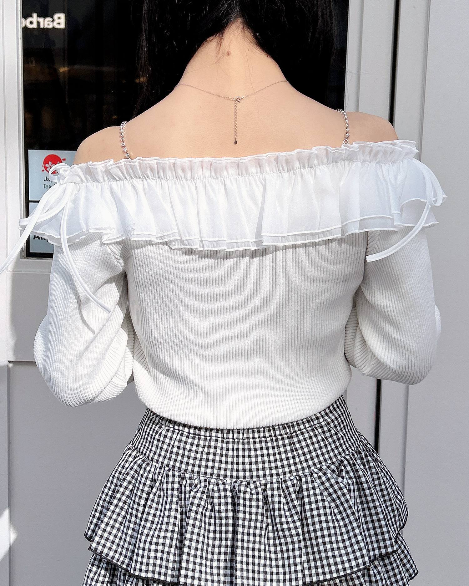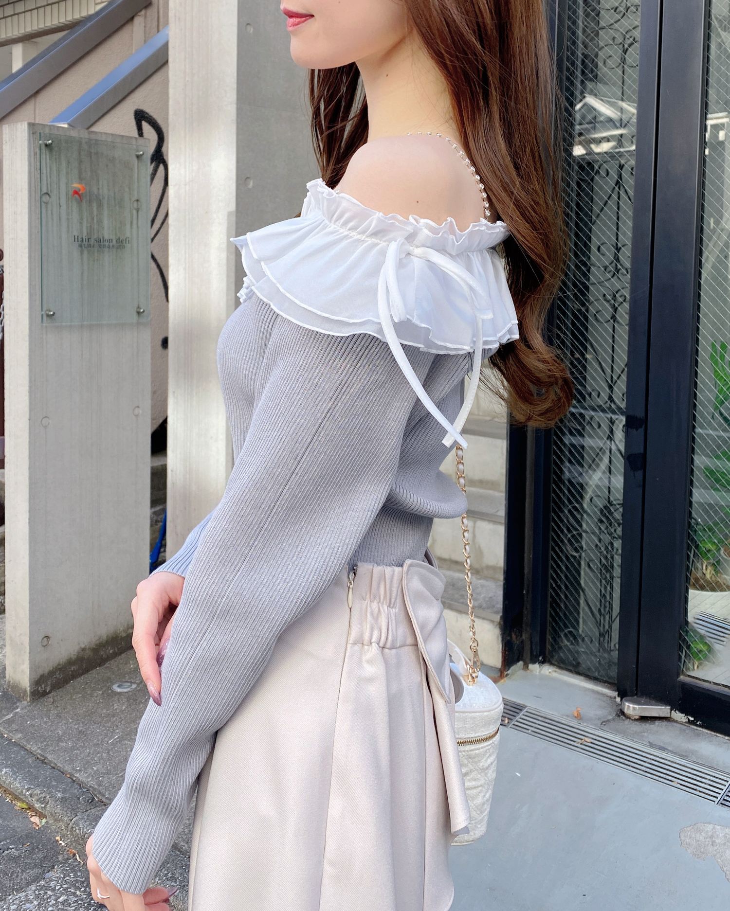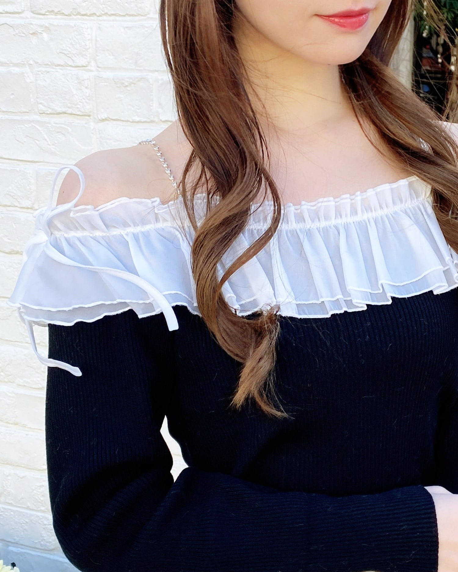 デコルテ部分にたっぷりとあしらったフリルが存在感抜群のオフショルニット。
